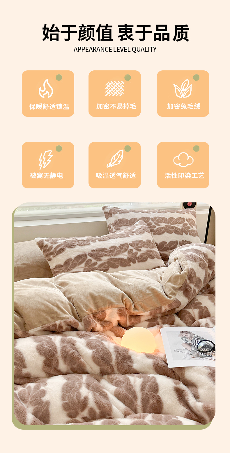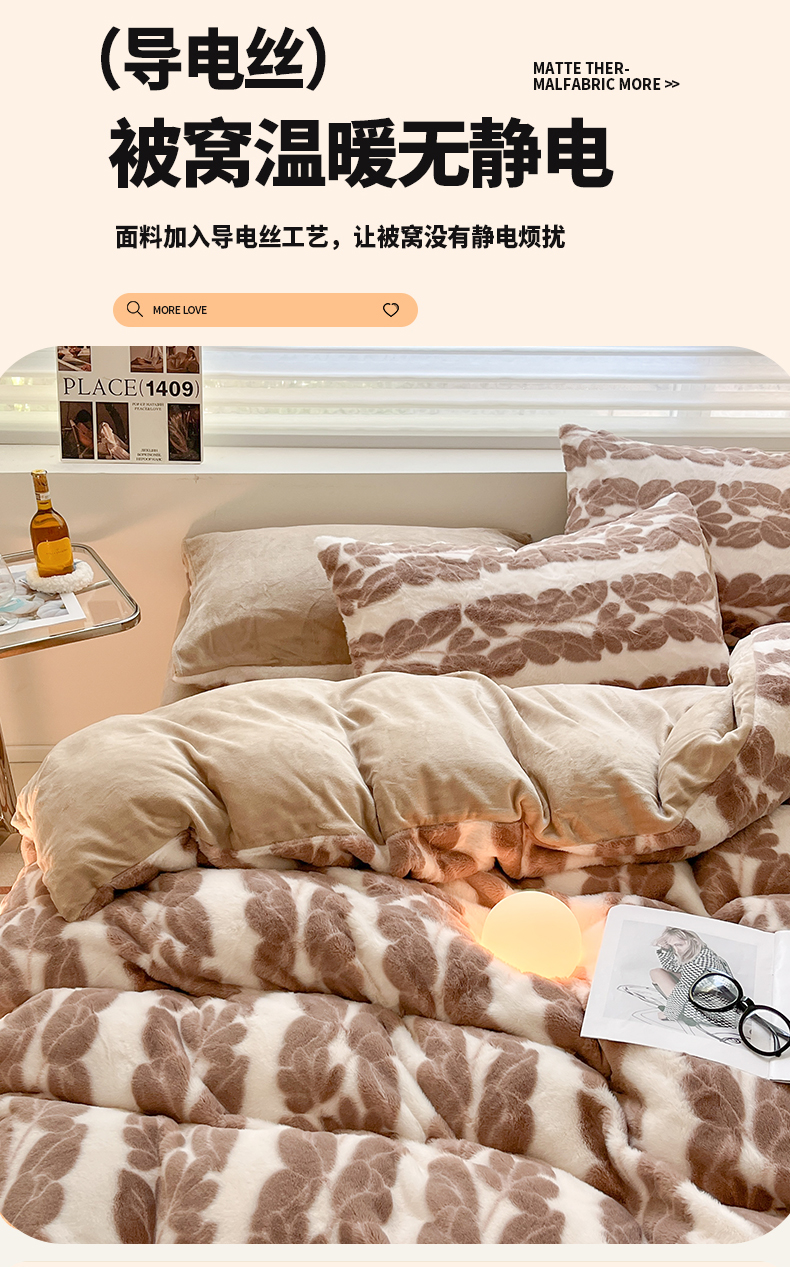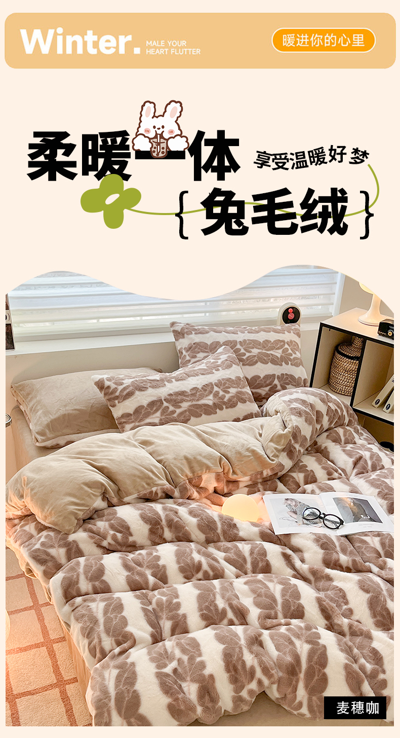 商品名称:金爱家 2024新款全消光牛奶绒A类纯色獭兔毛绒立体雕花牛奶绒四件套 兔毛麦穗咖