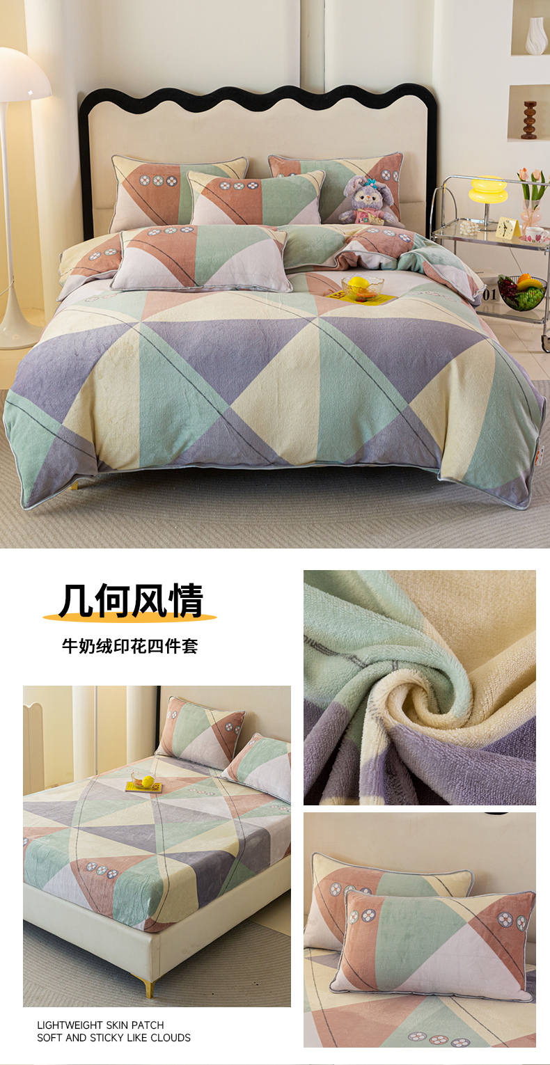当前位置: 91家纺网 > 商品网购 > 床品套件 > 四件套 > 牛奶绒四件套 > 欧喜璐 2024年新款 8.5-9.5斤加厚牛奶绒金貂绒法莱绒四件套单被套 几何风情