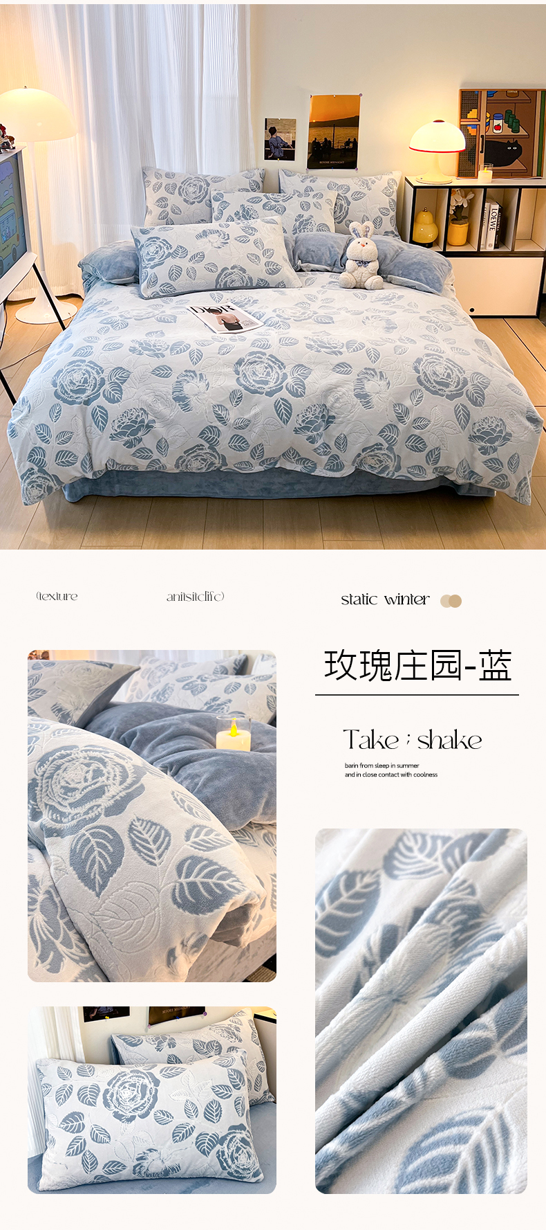 当前位置: 91家纺网 > 商品网购 > 床品套件 > 四件套 > 牛奶绒四件套 > 2024新款原创白色小清新场景雕花牛奶绒单被套四件套 玫瑰庄园-蓝