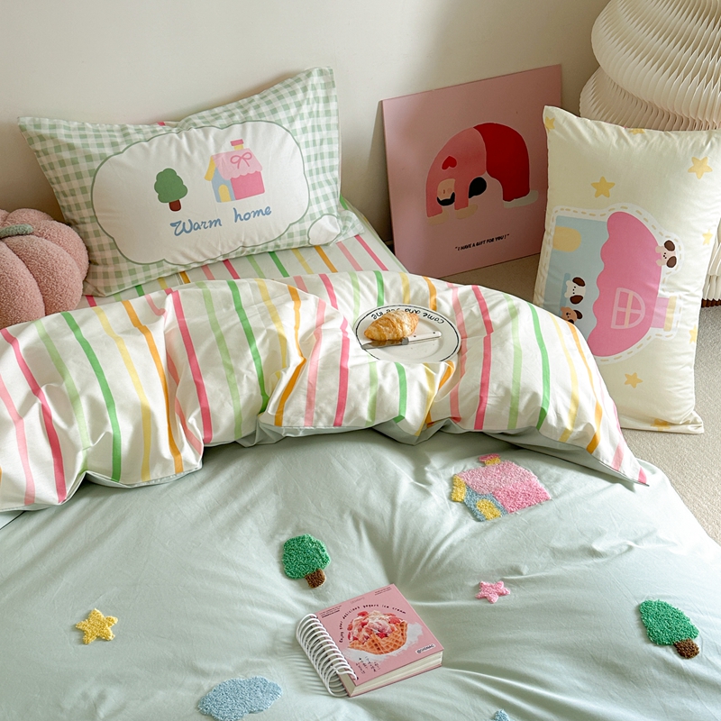 (总)柚子YOUTH 225新款全棉双层纱球球款四件套,薄荷绿条,波点霉霉,波点小丑,蓝心,芊芊结,碎花点点