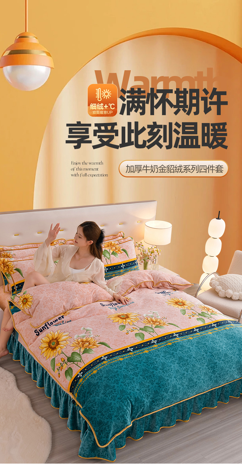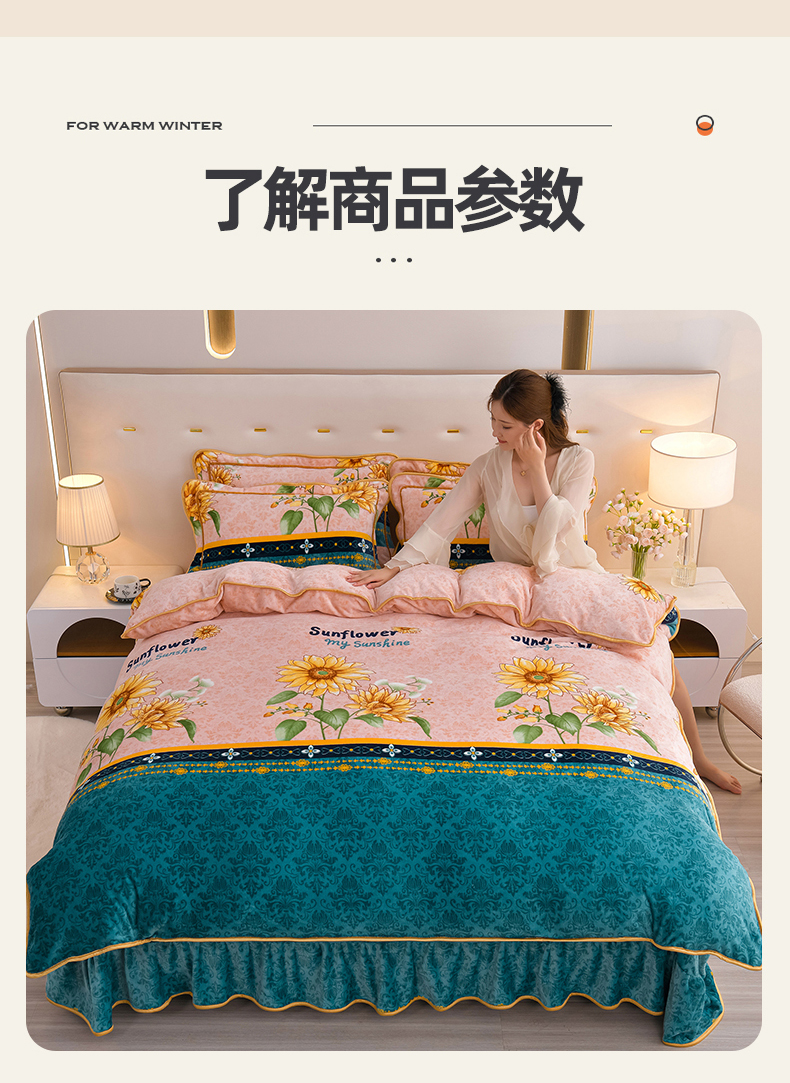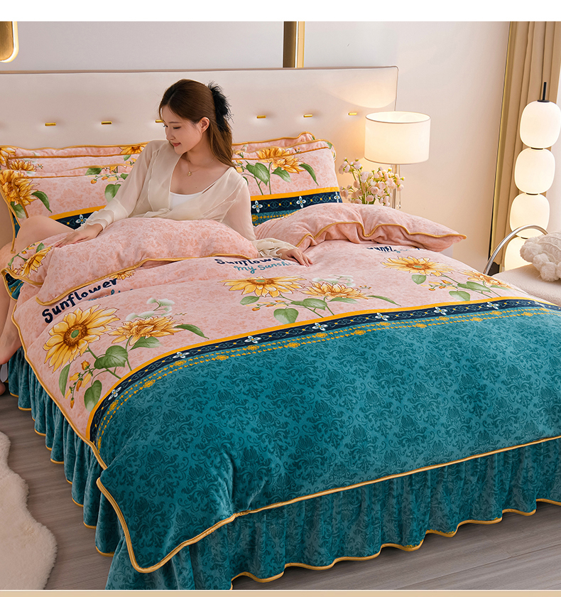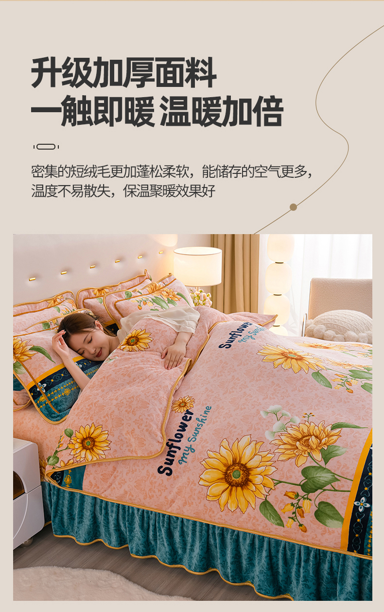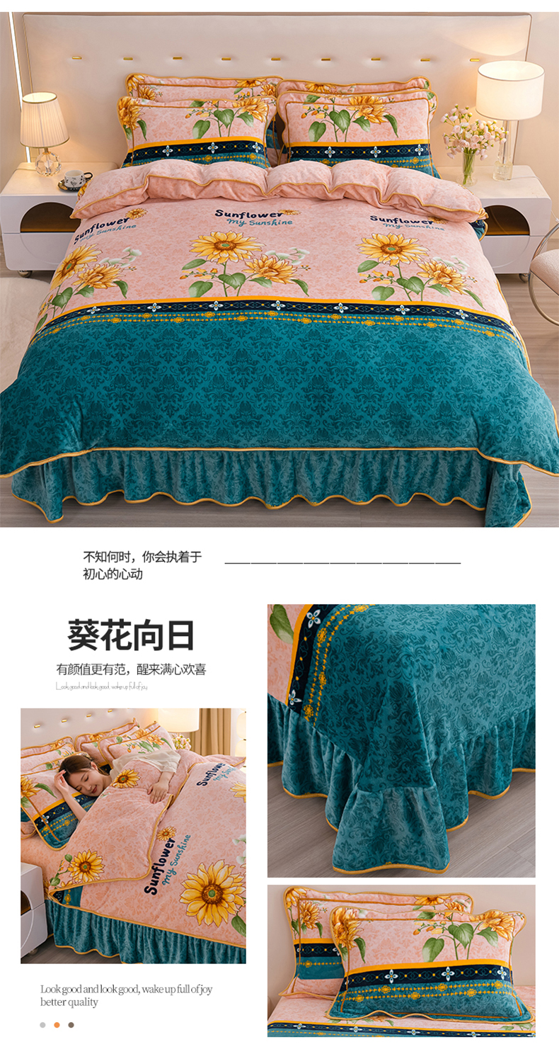 当前位置: 91家纺网 > 商品网购 > 床品套件 > 四件套 > 牛奶绒四件套 > 阿亮家居 2024新款8.5斤保暖牛奶绒金貂绒床裙款四件套 葵花向日