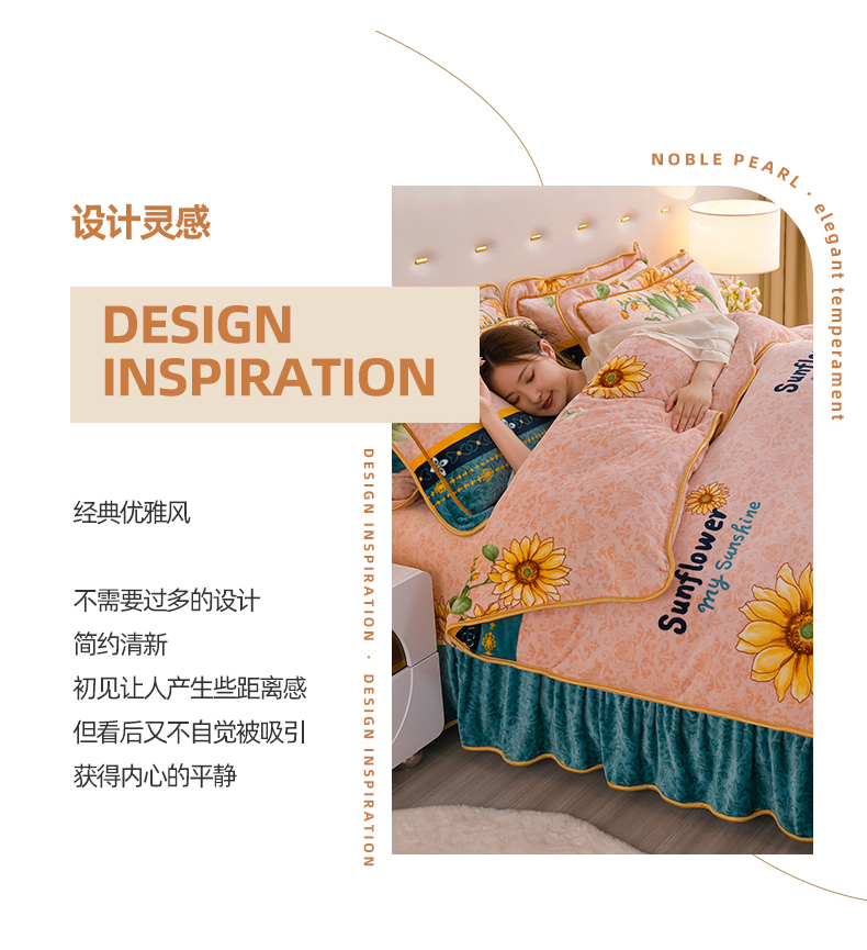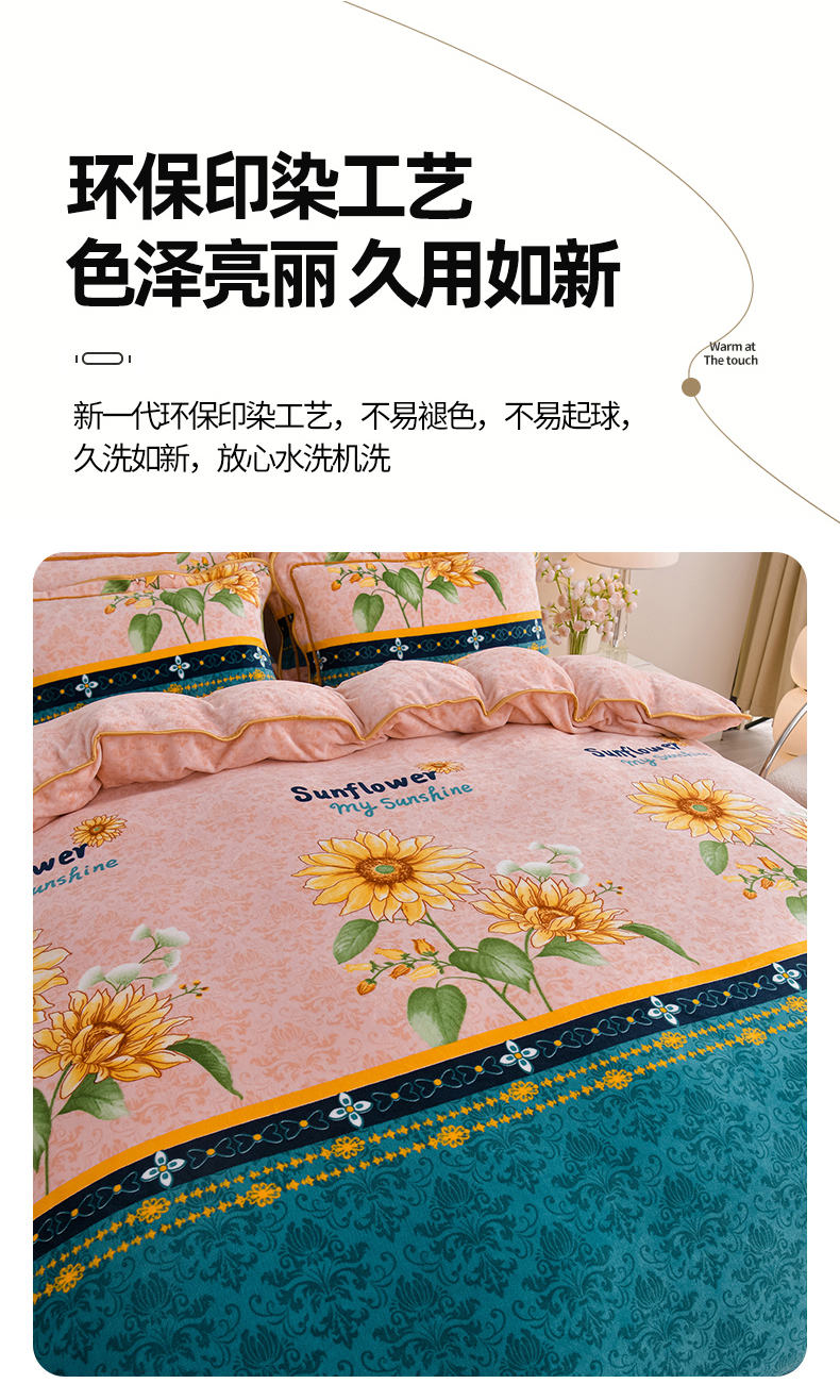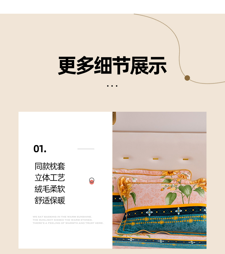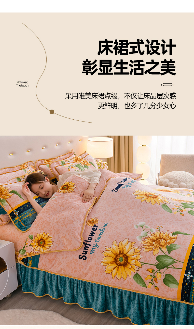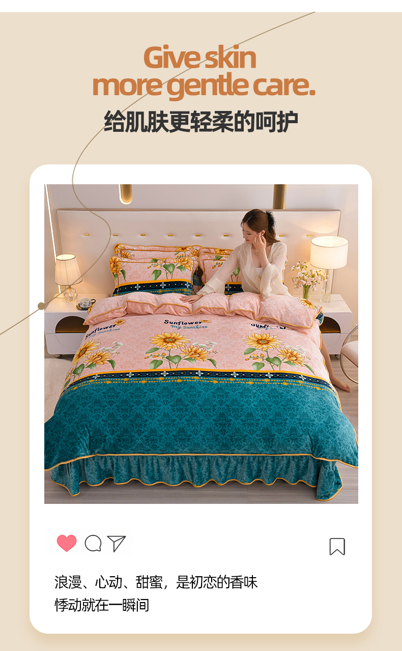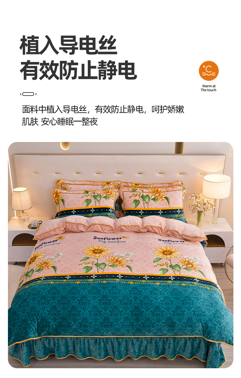 当前位置: 91家纺网 > 商品网购 > 床品套件 > 四件套 > 牛奶绒四件套 > 阿亮家居 2024新款8.5斤保暖牛奶绒金貂绒床裙款四件套 葵花向日