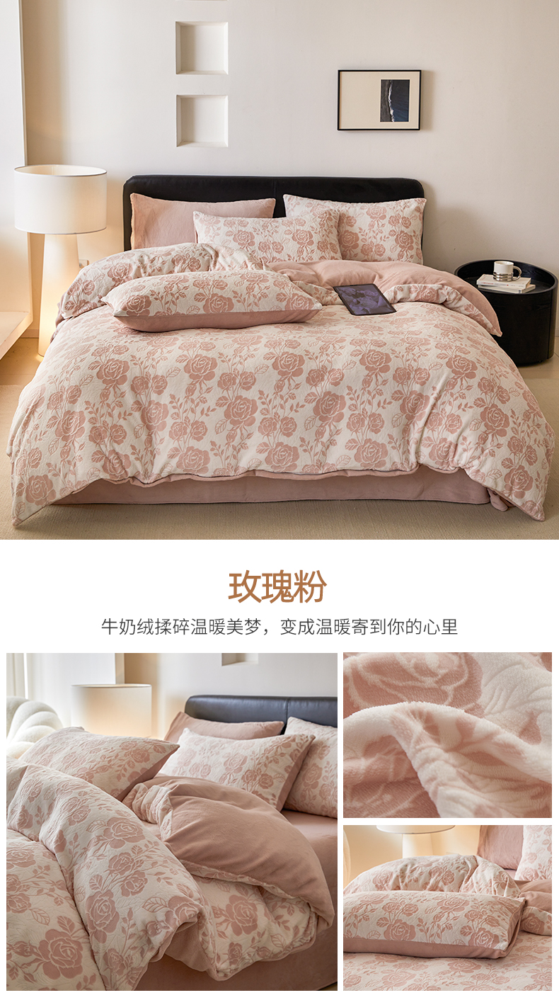 (总)优彩 2025新款雕花牛奶绒四件套烂花牛奶绒四件套,若叶-奶杏,若叶-浅荷绿,玫瑰-粉,玫瑰-米,小几何-婴儿蓝