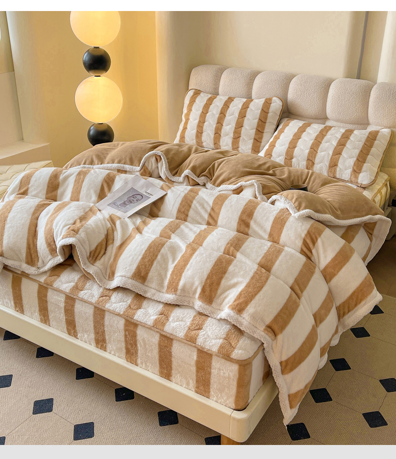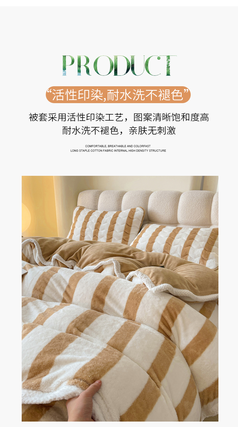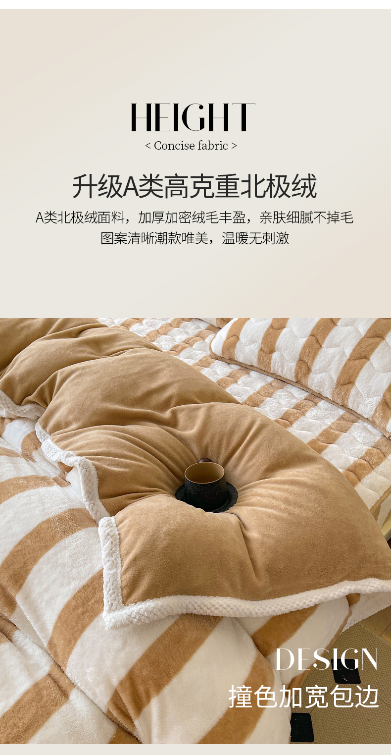 商品名称:2024新款A类北极绒格子-条纹系列宽包边加厚被套(暖光图) 条纹-奶咖