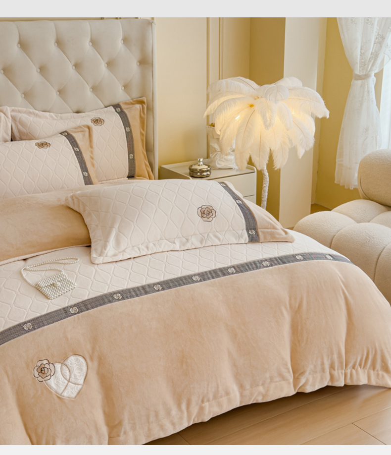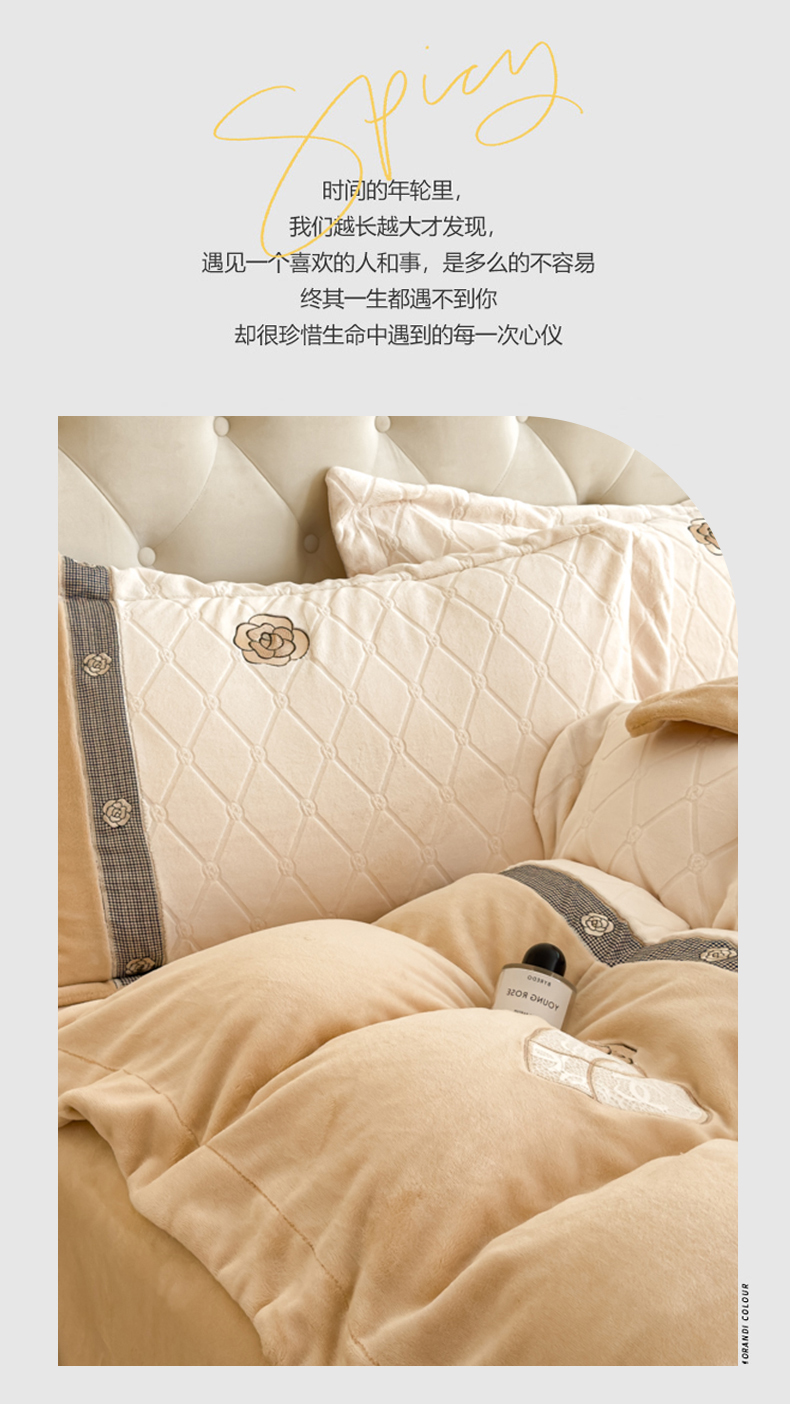 (总)木兰花 2025新款纯色雕花全消光牛奶绒蕾丝绣花被套夹棉床盖款四件套(控价288),粉玉,果绿,米咖,天蓝