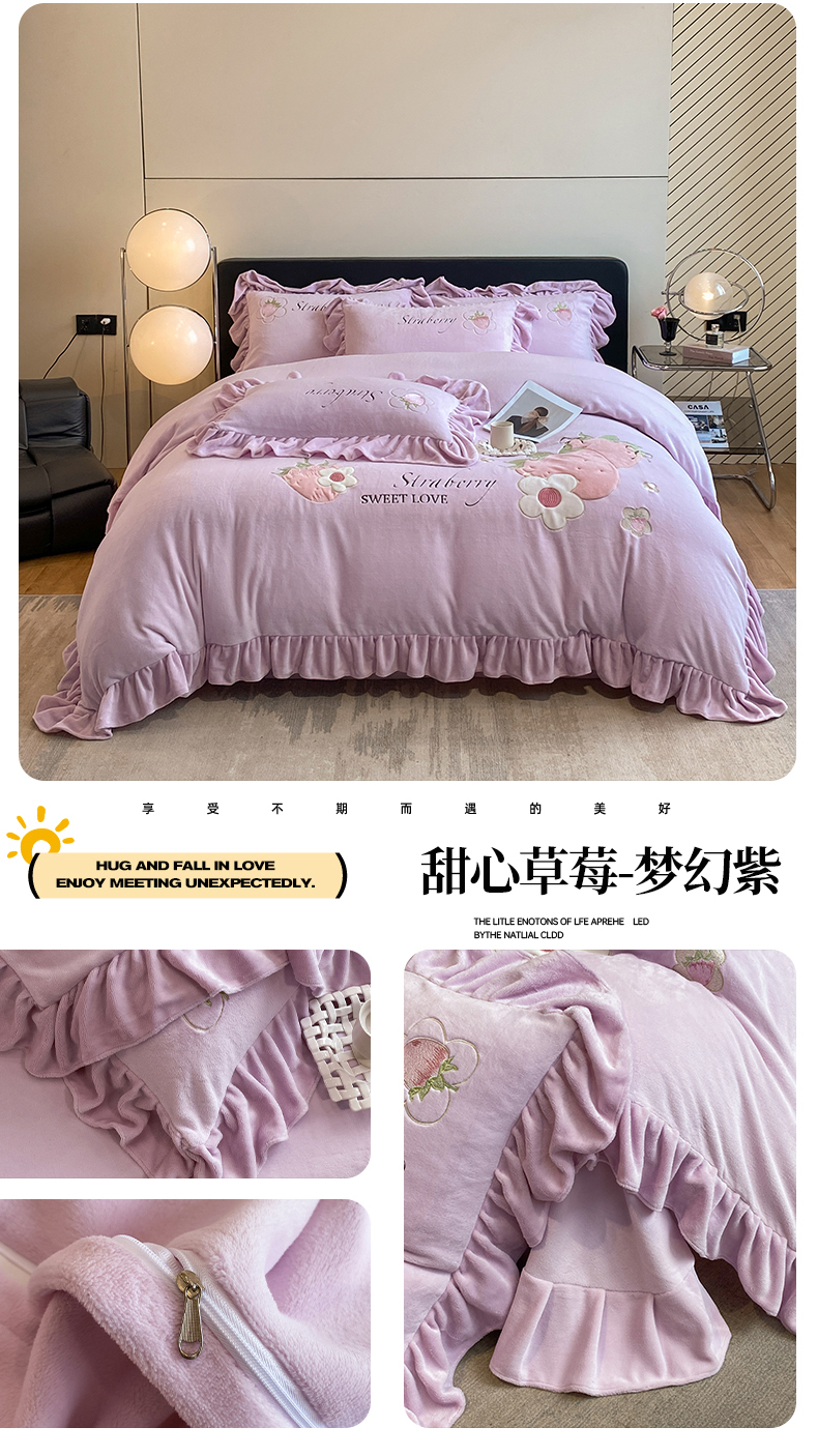 爱家(原缔乐家纺) 牛奶绒贴布绣四件套-甜心草莓 甜心草莓-梦幻紫