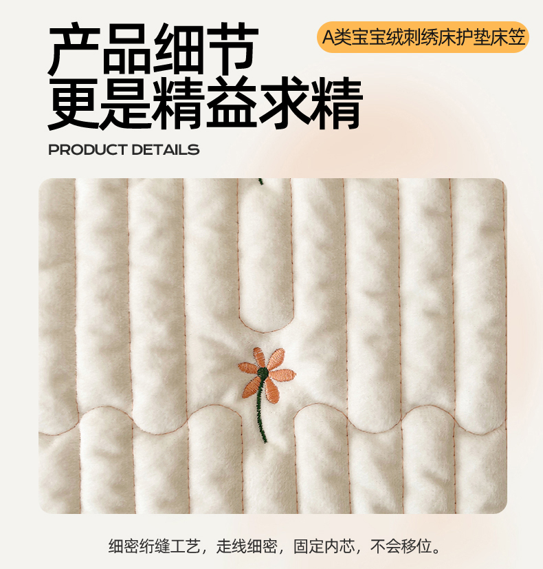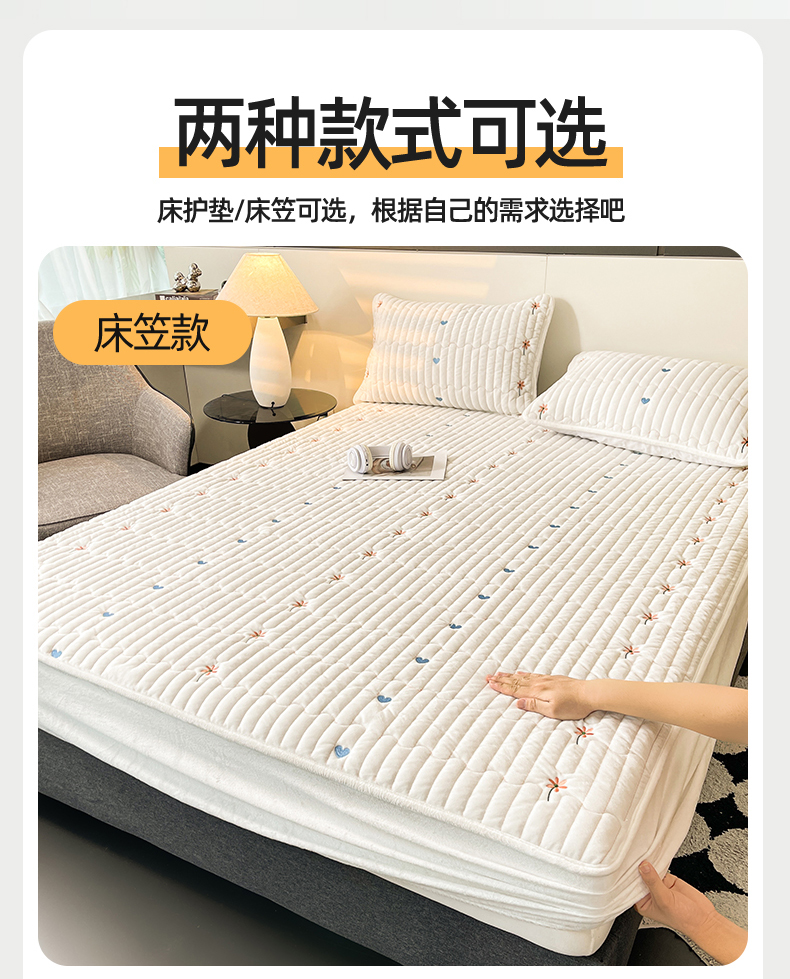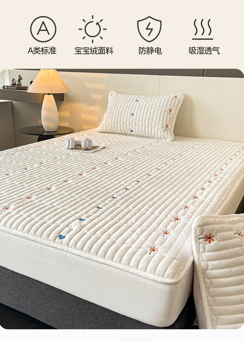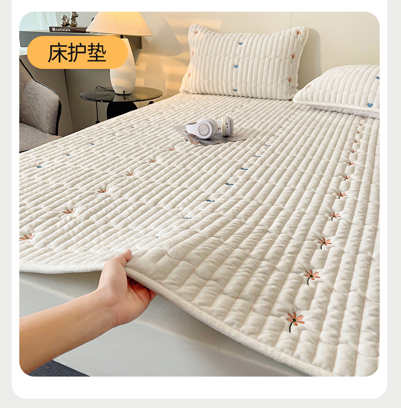 商品名称:2024新款A类纯色牛奶绒刺绣薄款床垫加厚绒保暖床笠床护垫 艾维-白(床褥款)