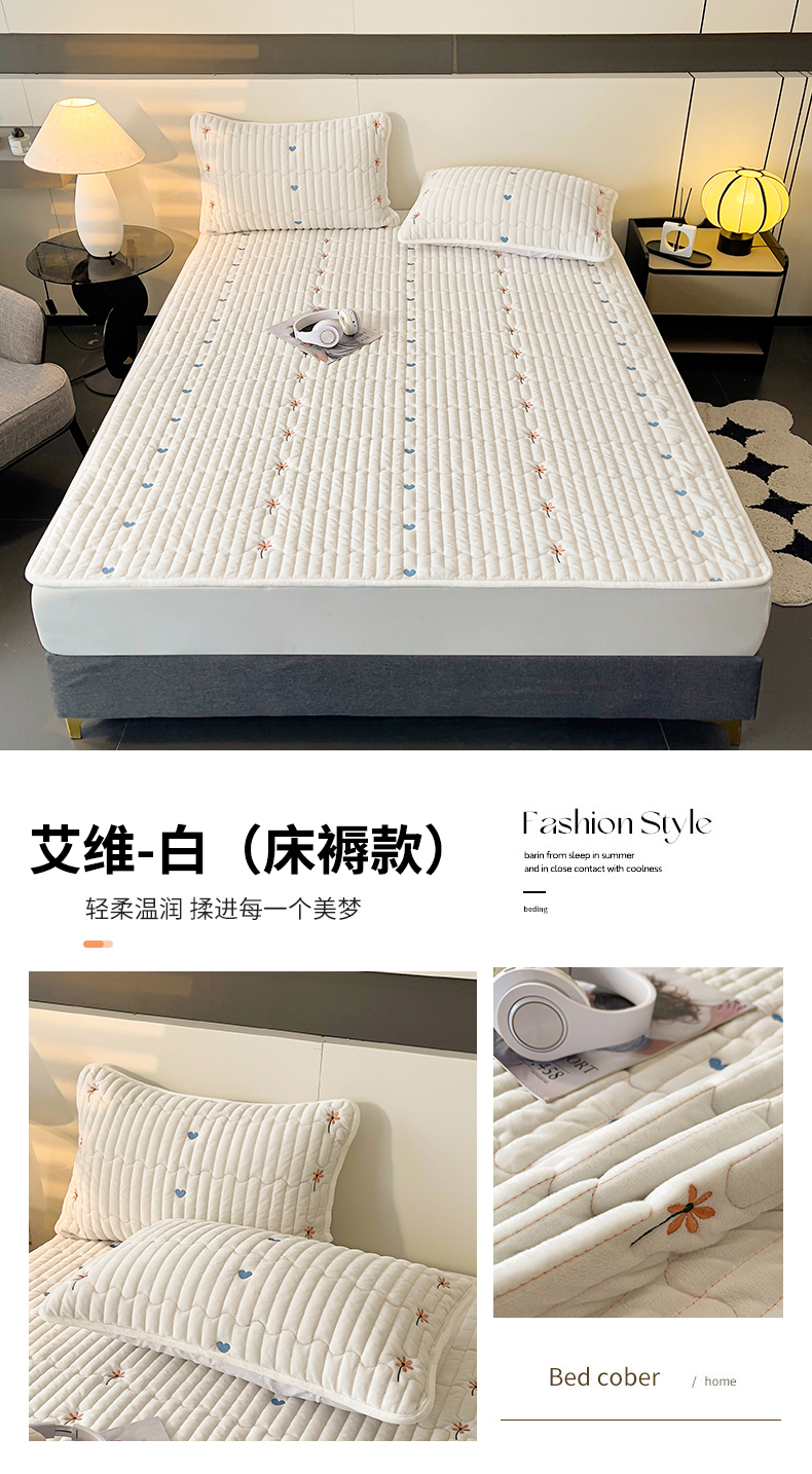 2024新款A类纯色牛奶绒刺绣薄款床垫加厚绒保暖床笠床护垫 艾维-白(床褥款)