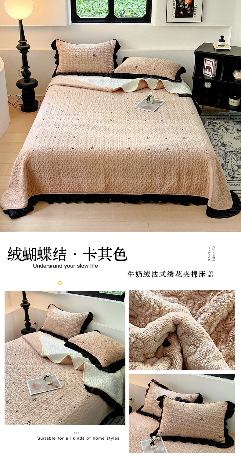 美梦家纺 2024新款牛奶绒法式绣花夹棉床盖 绒蝴蝶结·卡其色