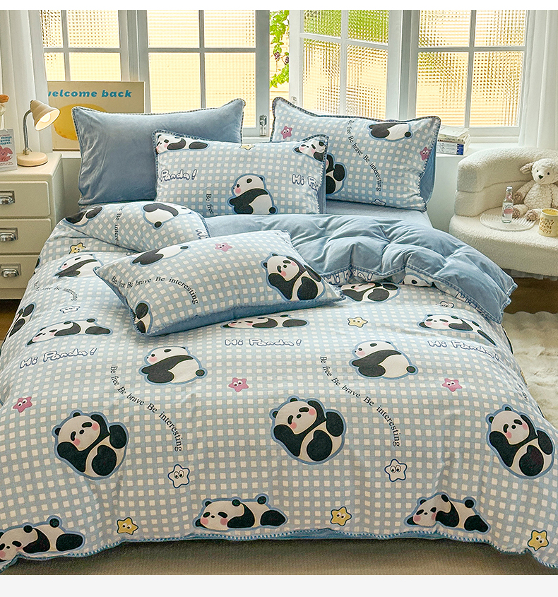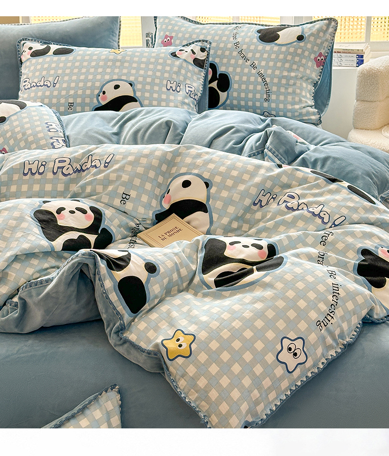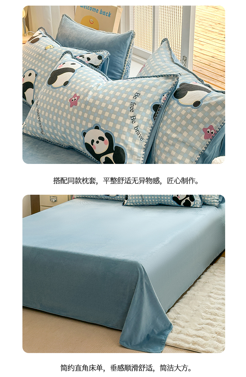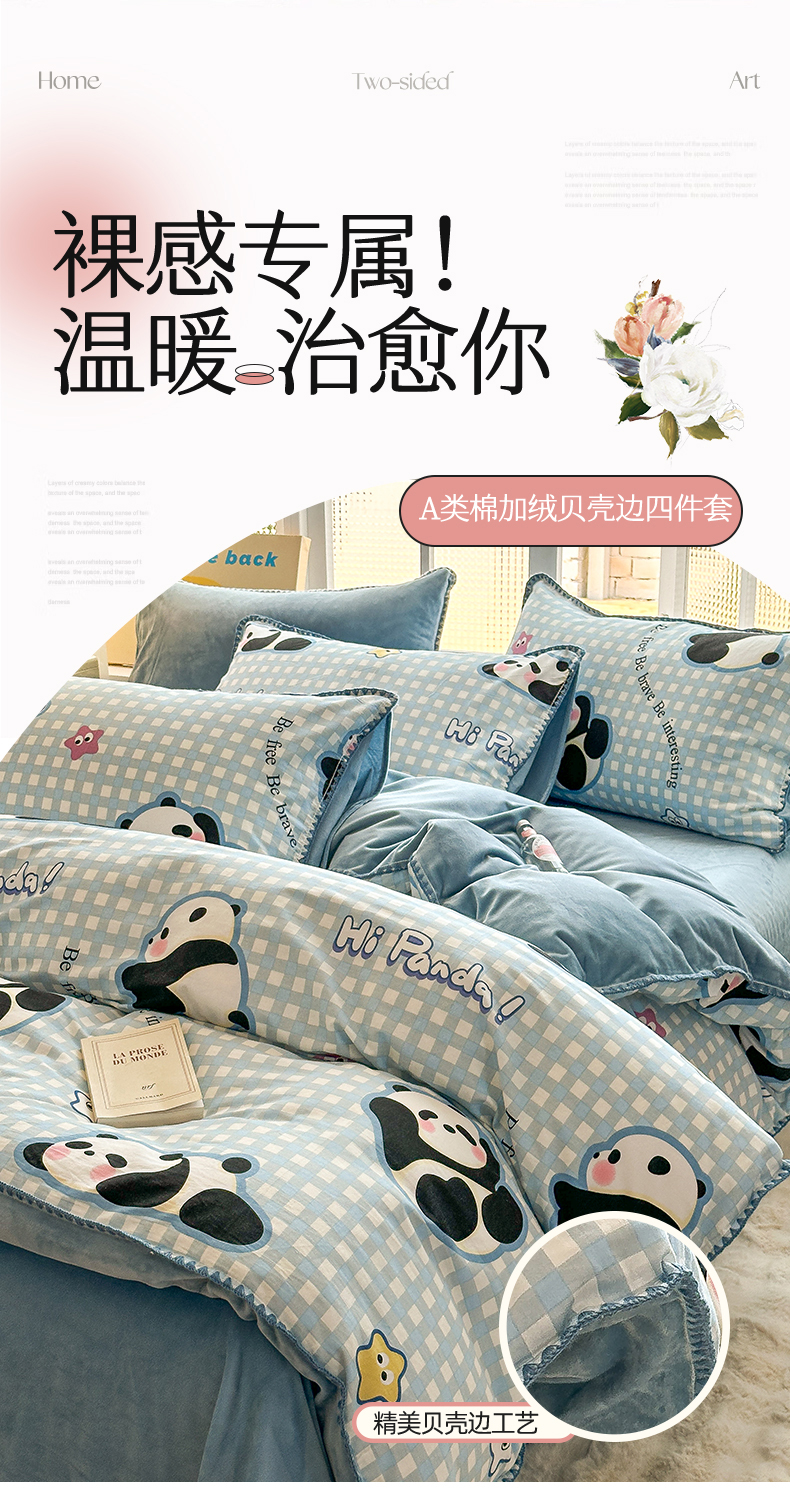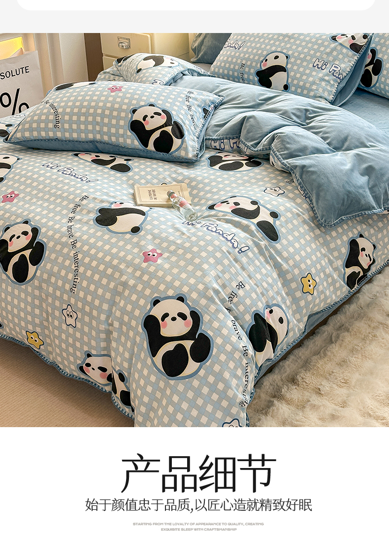 当前位置: 91家纺网 > 商品网购 > 床品套件 > 四件套 > 牛奶绒四件套 > 红粉佳人新款小清新卡通贝壳边三角针棉加绒四件套工艺款牛奶绒四件套蓝格熊猫