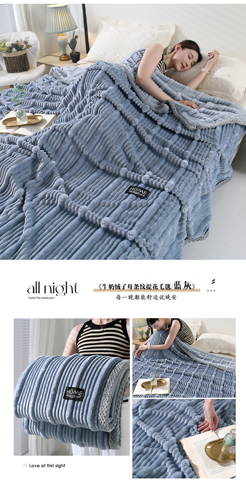 商品名称:美洲琳 2025新款牛奶绒子母条纹提花毛毯 蓝灰