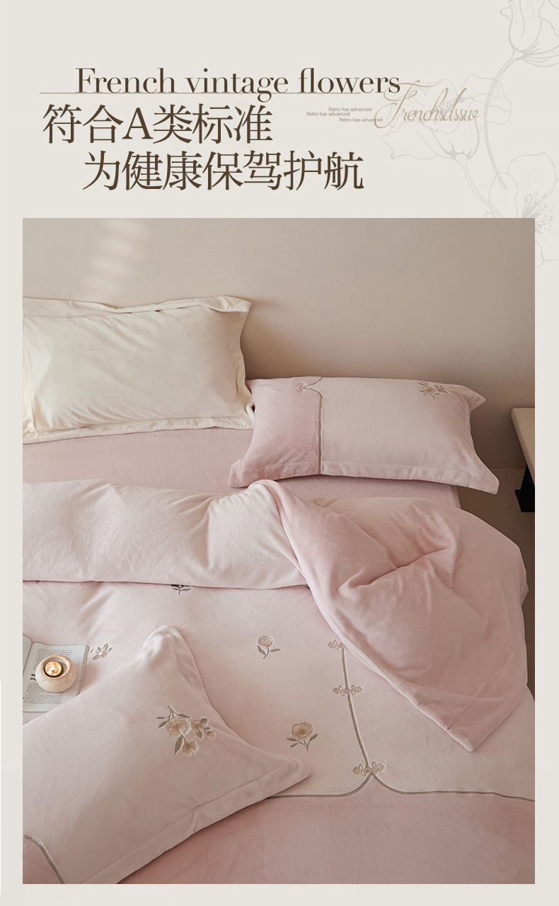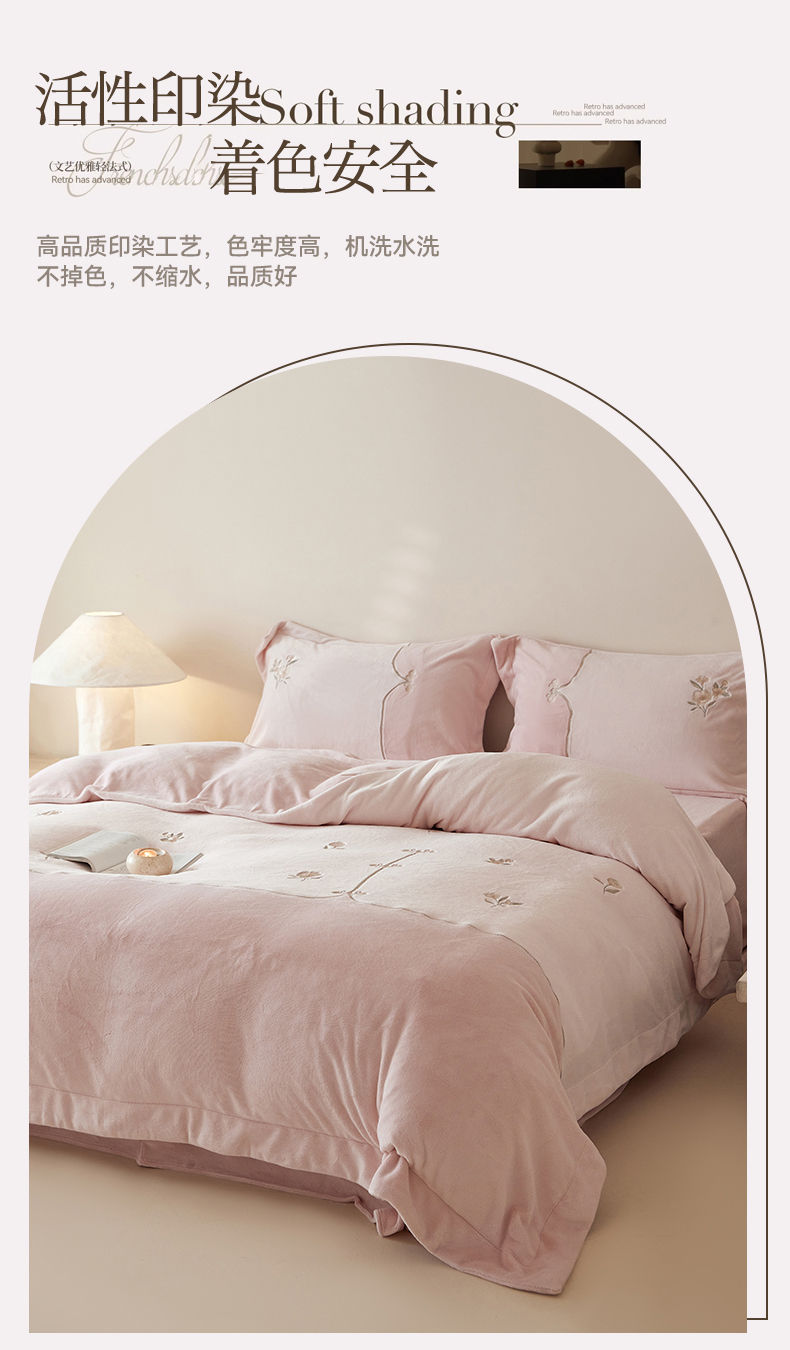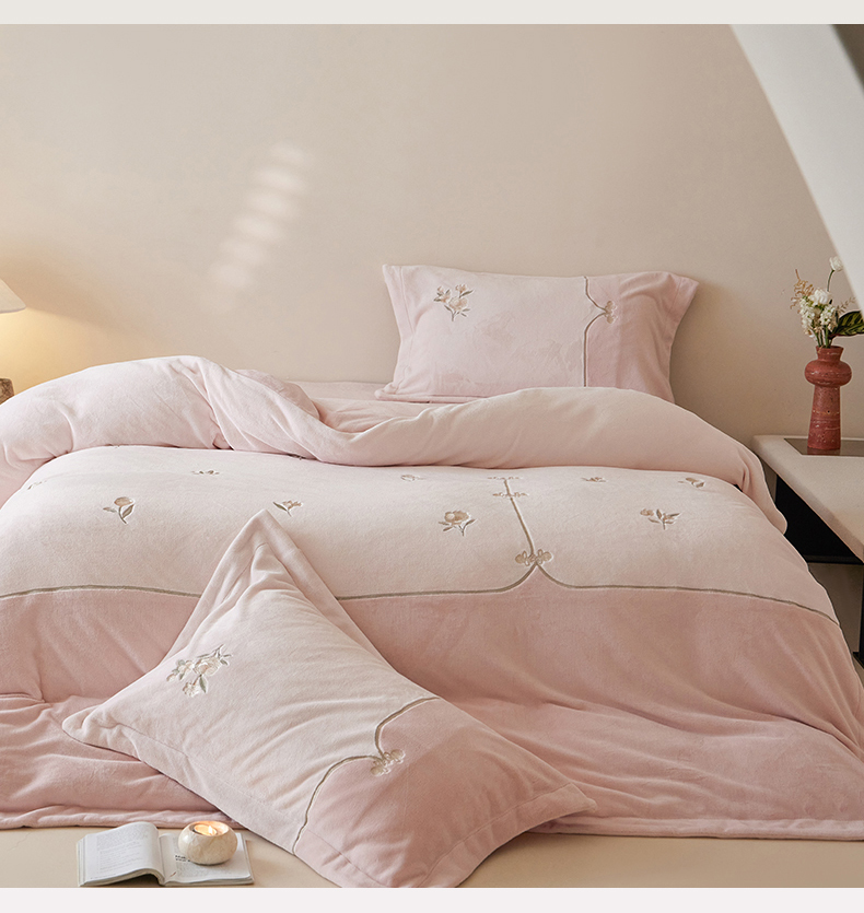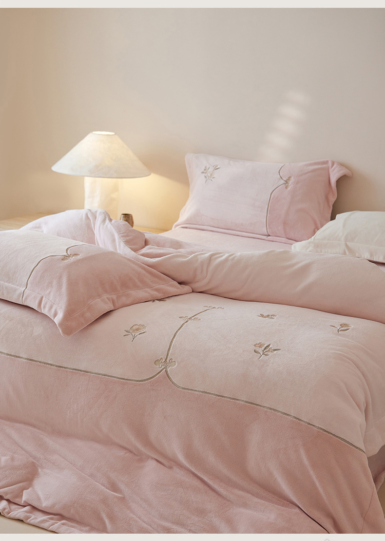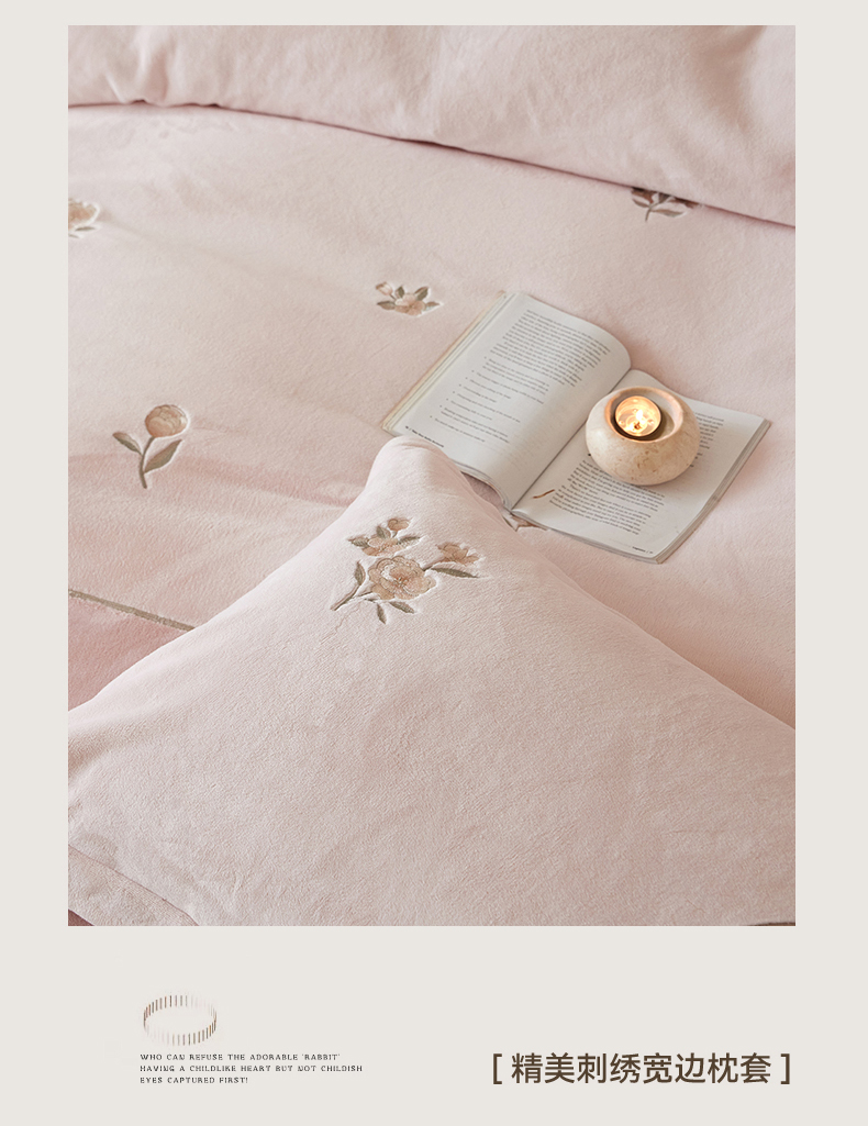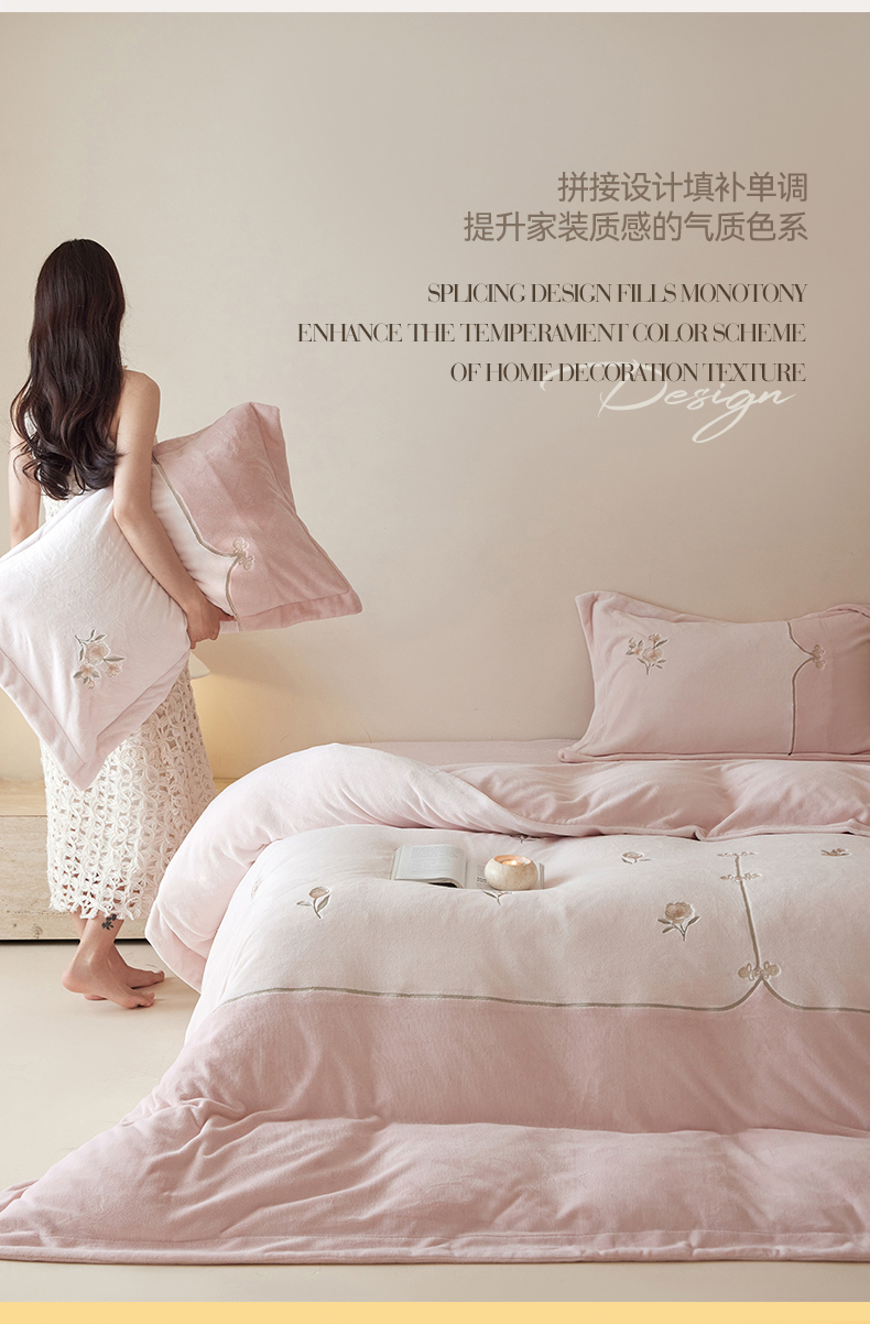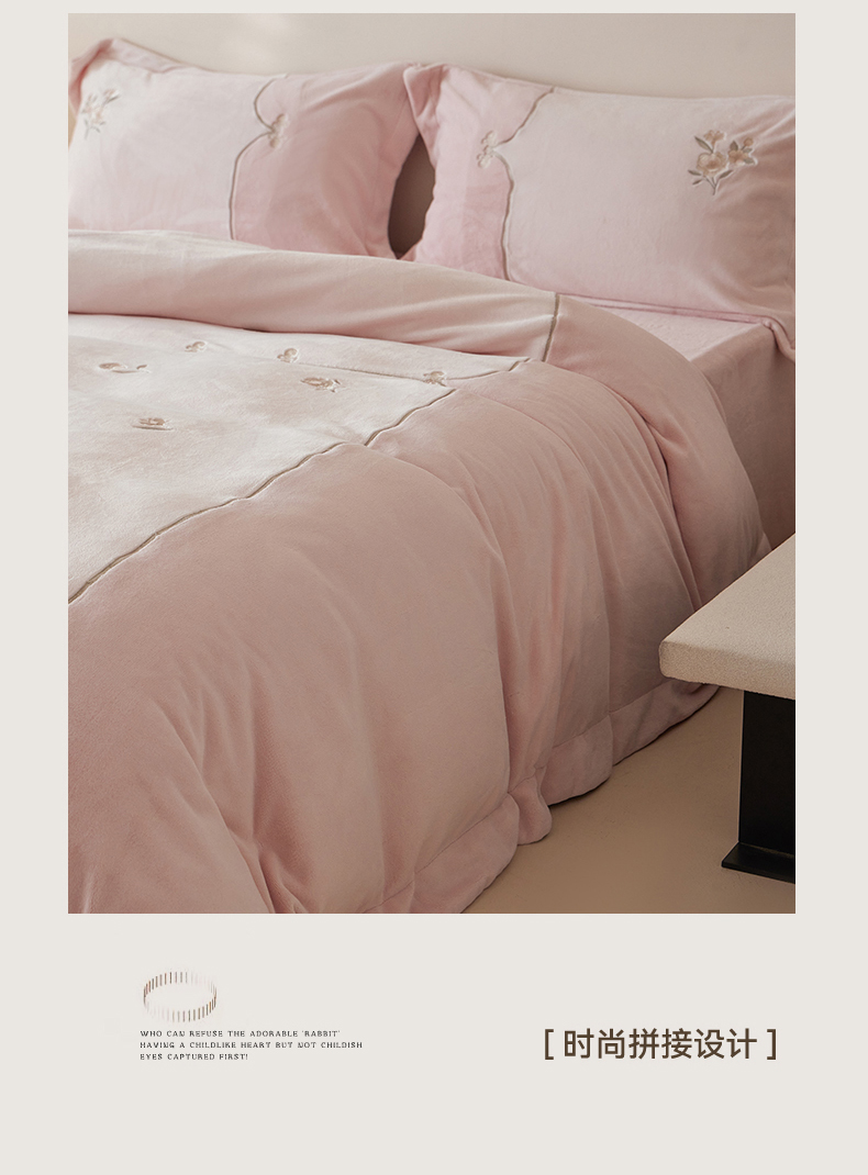 名品优仓 2024新款高克重牛奶绒刺绣宽边四件套-暮春 暮春-浅粉+牛奶粉