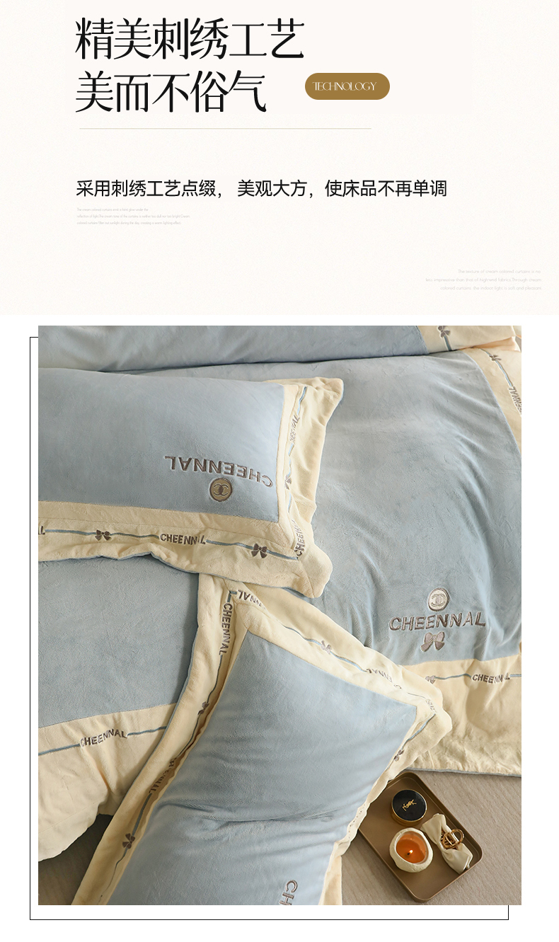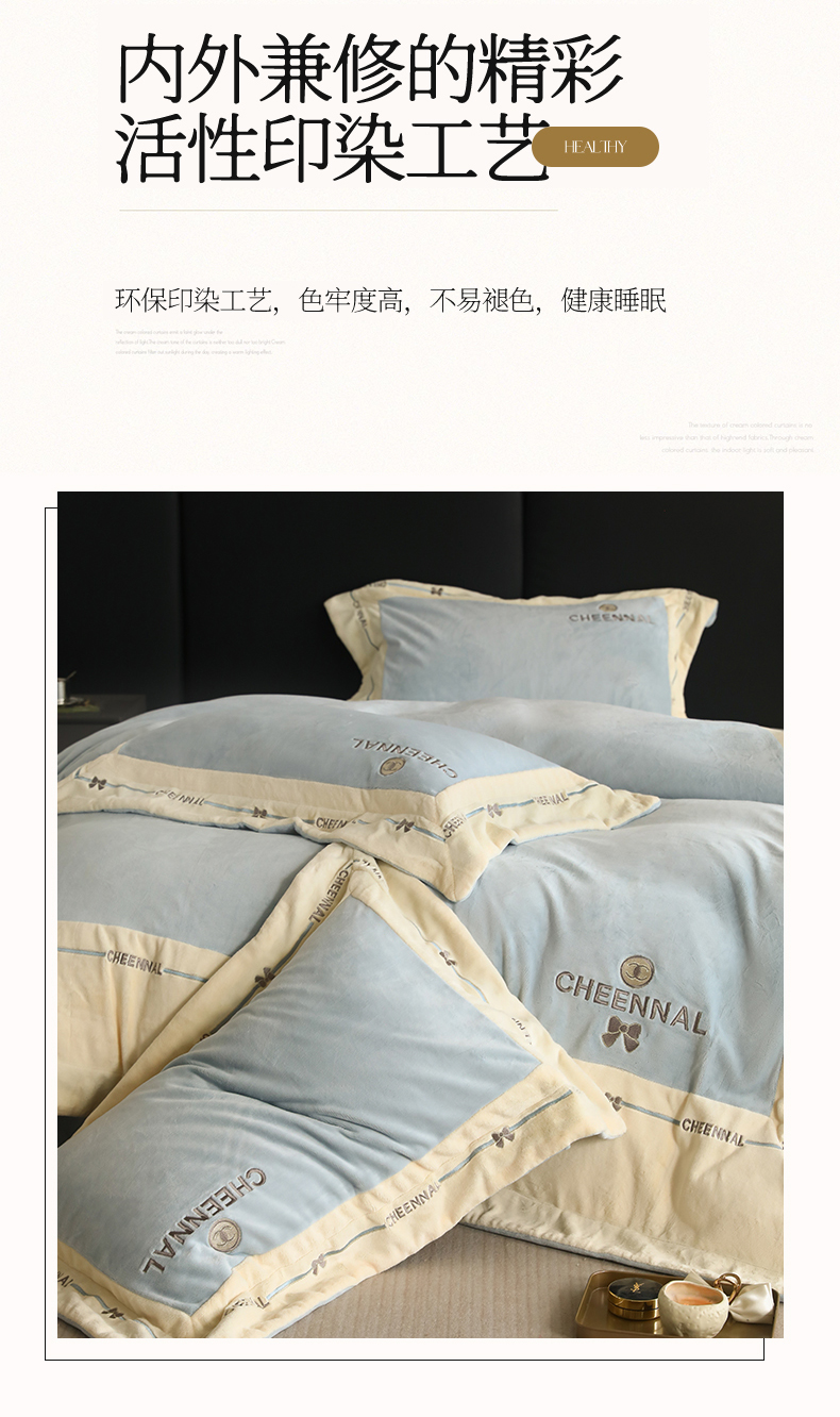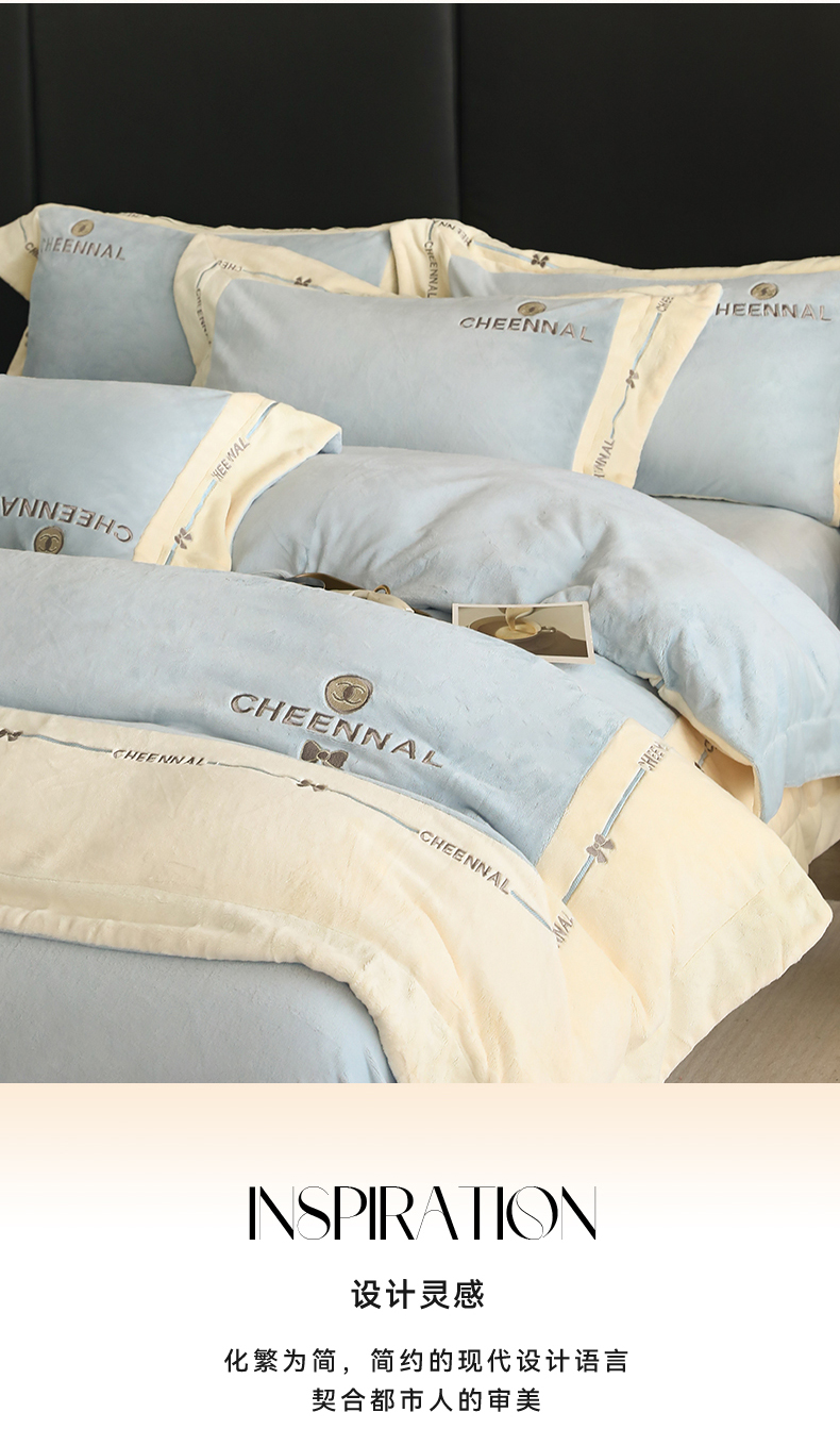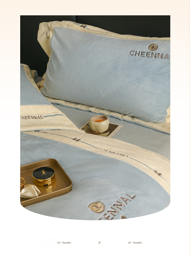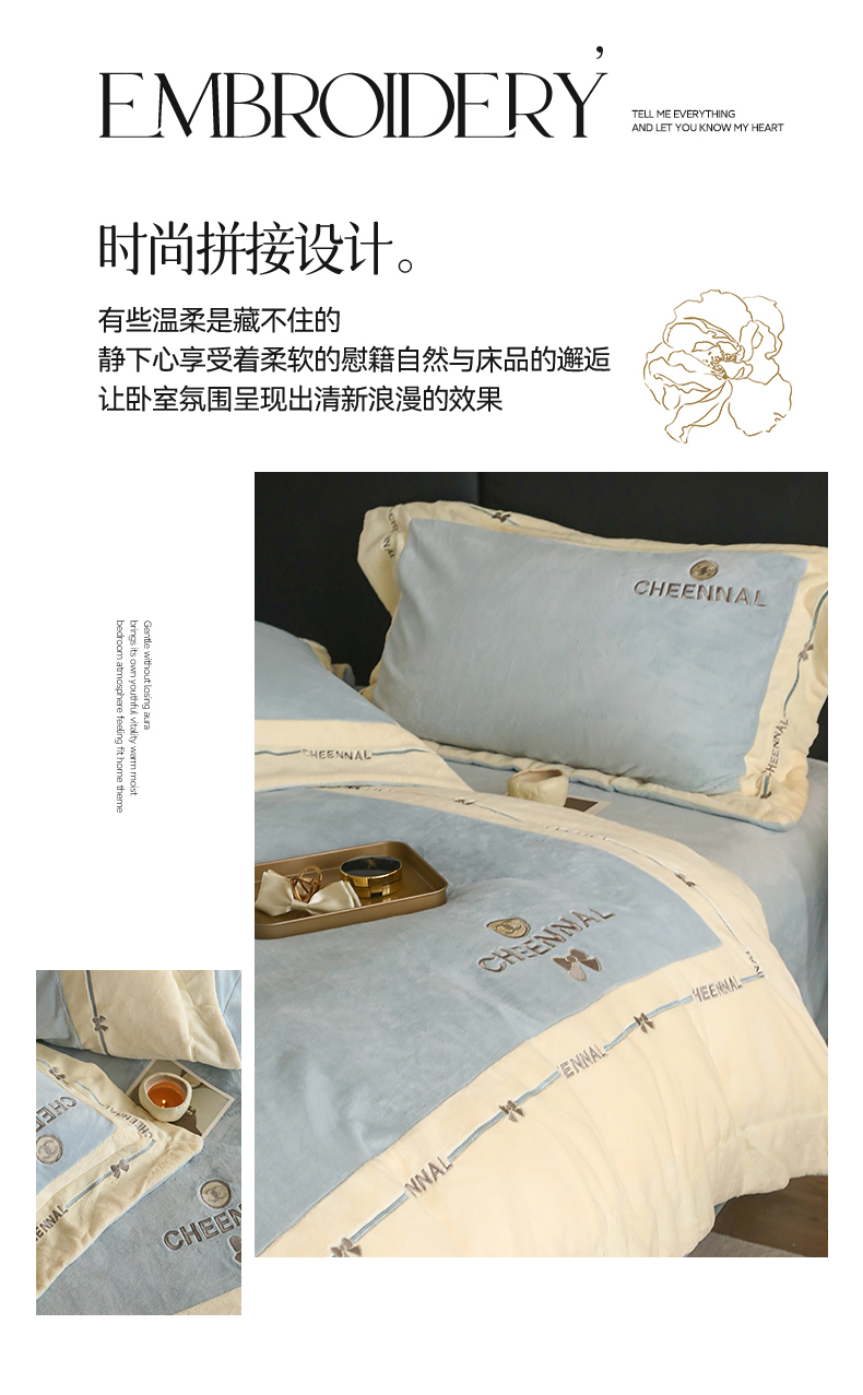 商品名称:名品优仓 2024新款高克重高克重牛奶绒四件套-希娜尔 希娜尔-梦蓝