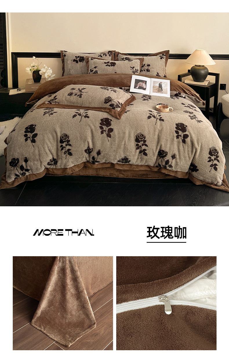 商品名称:丝印良品 2024秋冬新款丹麦绒宽边牛奶绒四件套 宽边兔绒-玫瑰咖