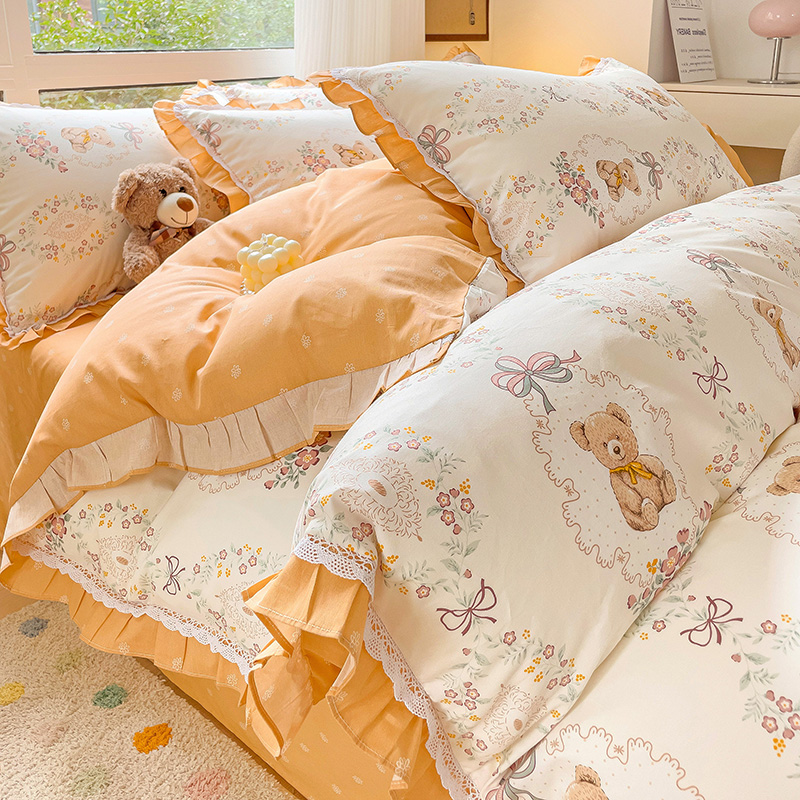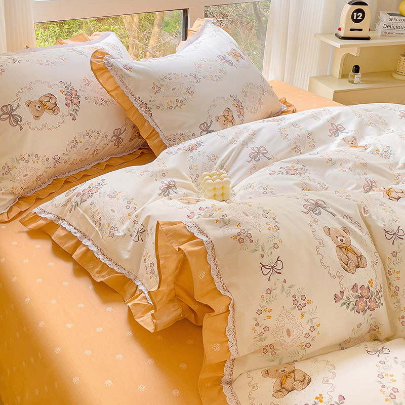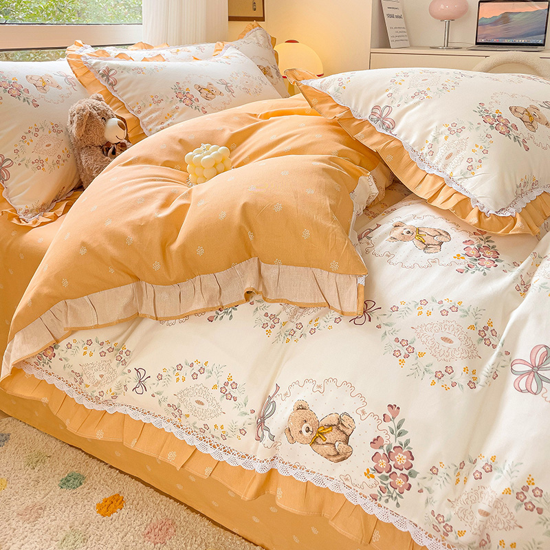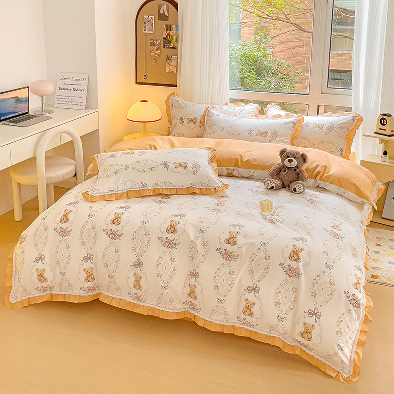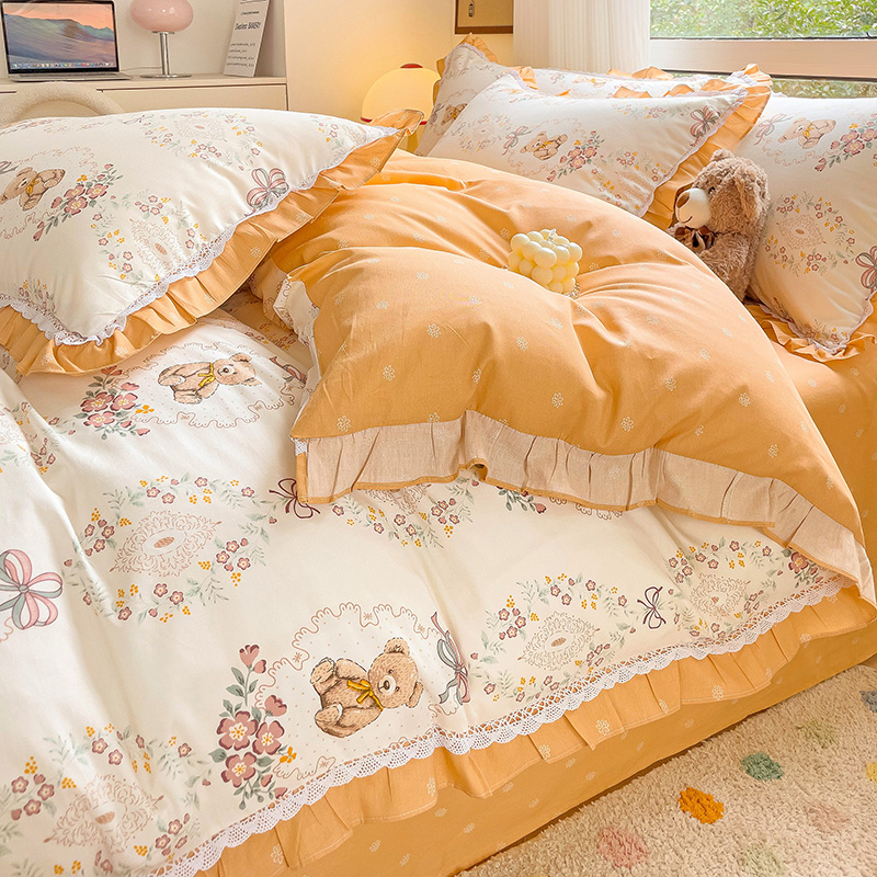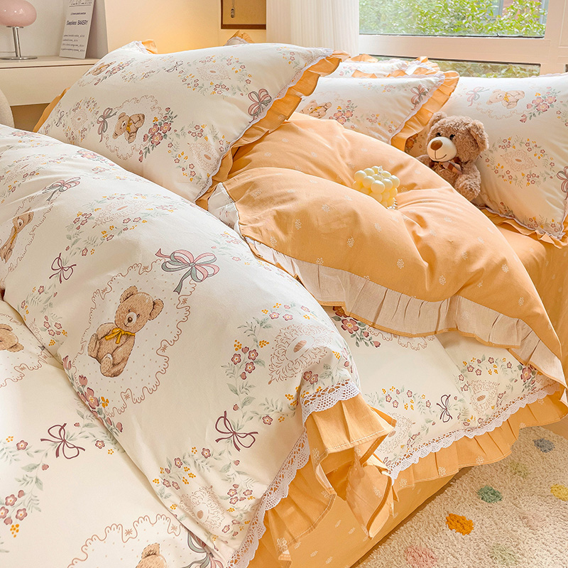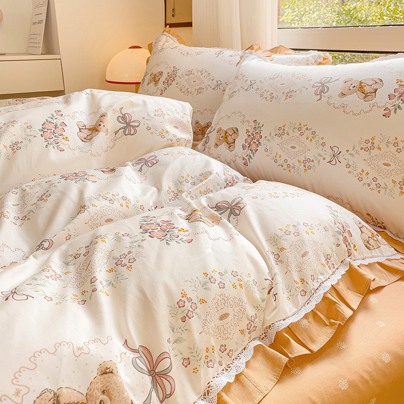 棉生活家纺 2025新款全棉小清新花边款蕾丝四件套 咕嘟小熊