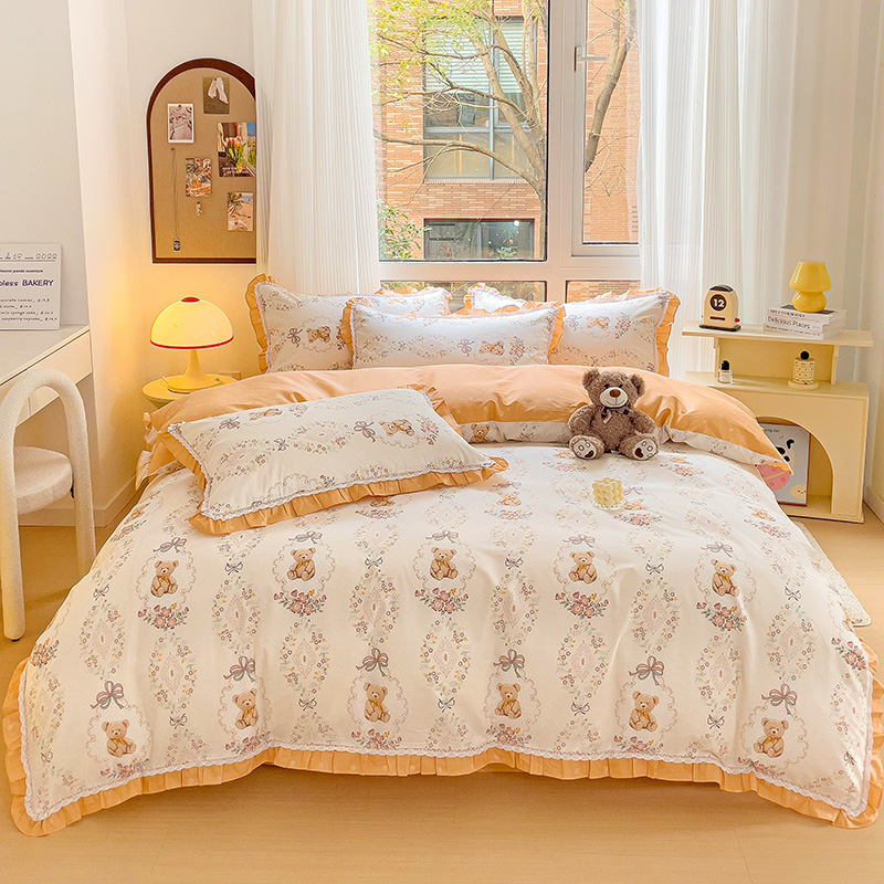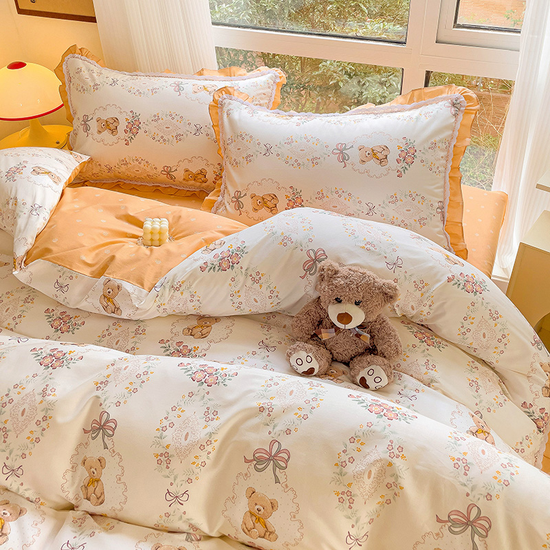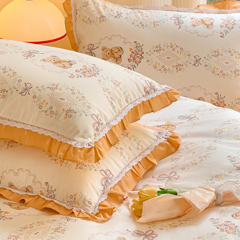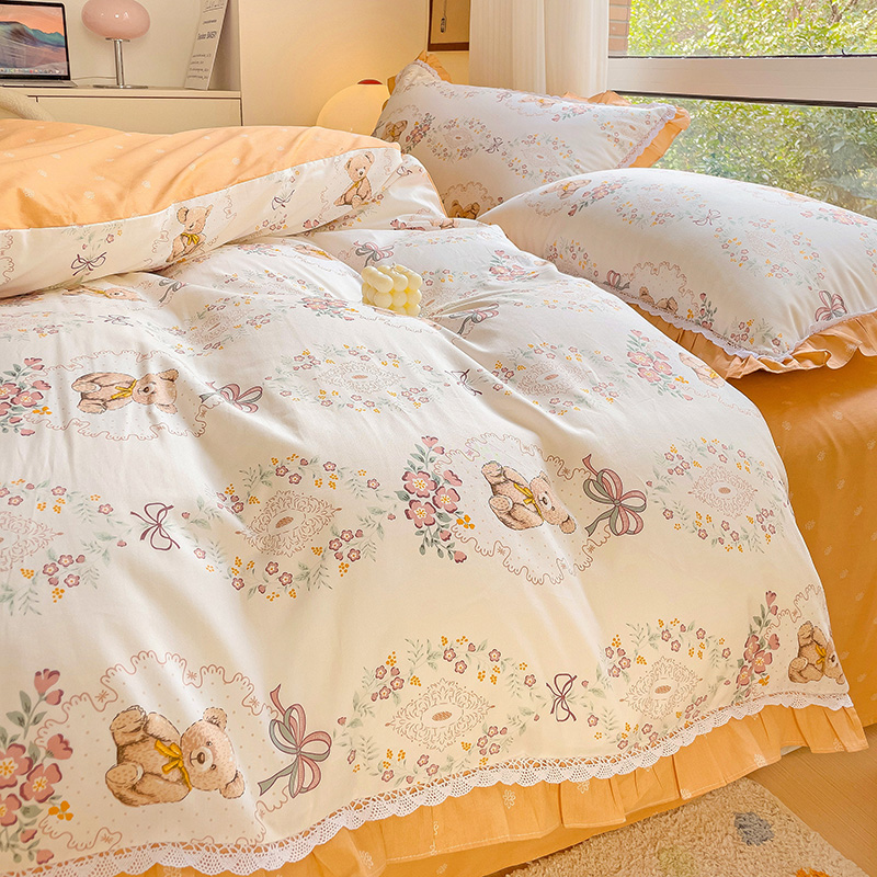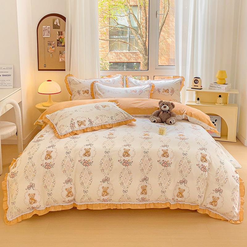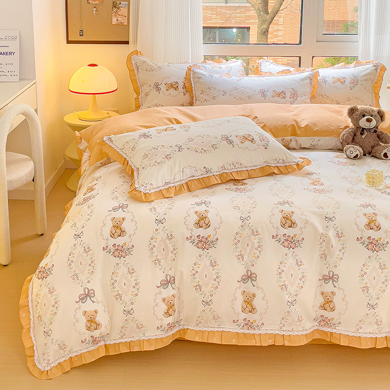 棉生活家纺 2025新款全棉小清新花边款蕾丝四件套 咕嘟小熊