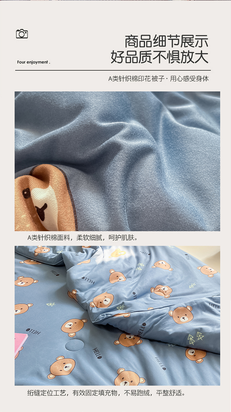 • 91家纺网 家纺一手货源 找家纺 (总)2025新款A类针织棉被芯夏凉被春秋被冬被儿童学生成人冬被加厚被子大豆被—影棚图,爱心小兔,爱心小熊,彩虹熊-蓝,大熊猫,蛋糕兔,动物集,花朵熊,花花世界,可爱熊蓝,恐龙宝贝,恐龙家族,太空熊,甜心草莓,五彩小熊,小女孩,小汽车蓝,小兔团子,宇航员蓝,长耳兔,字母熊