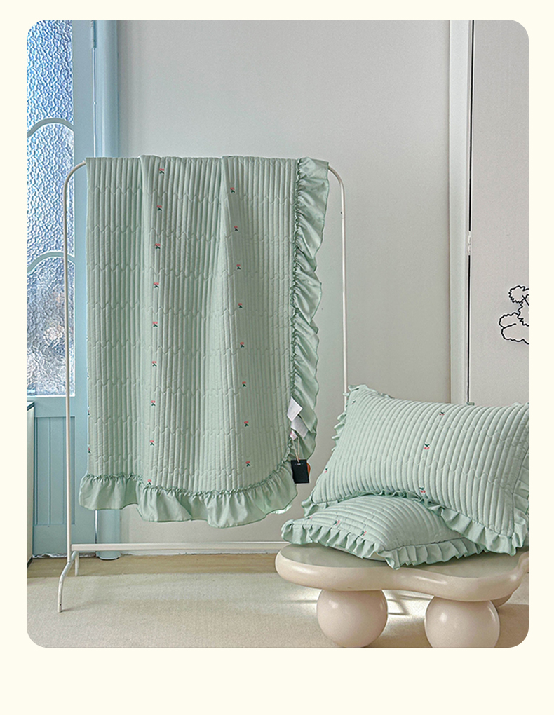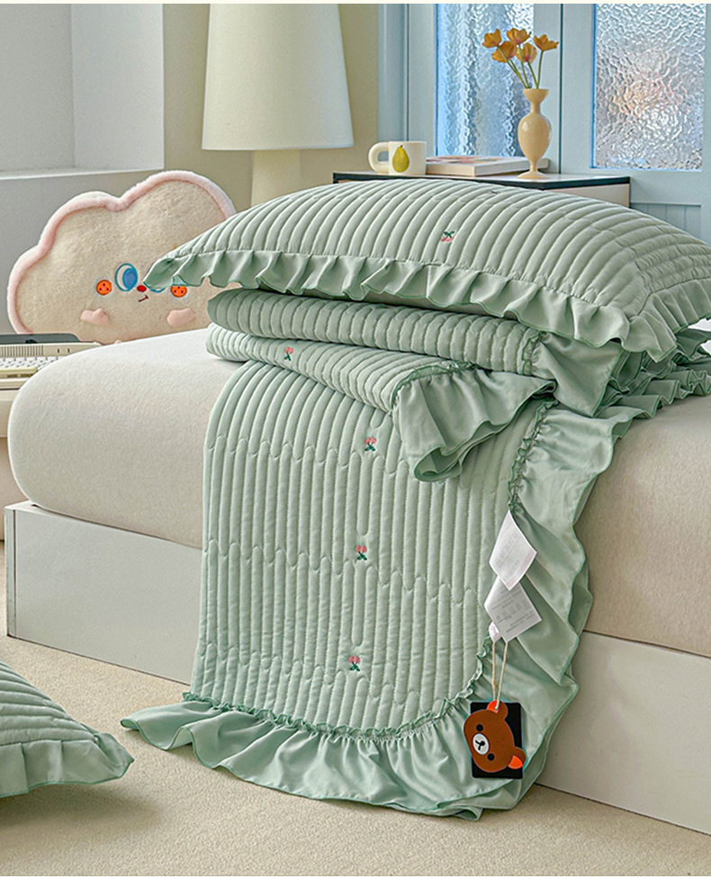 源舜家纺 2025新款无弹针织绣花小清新床盖夏被四件套 绿色