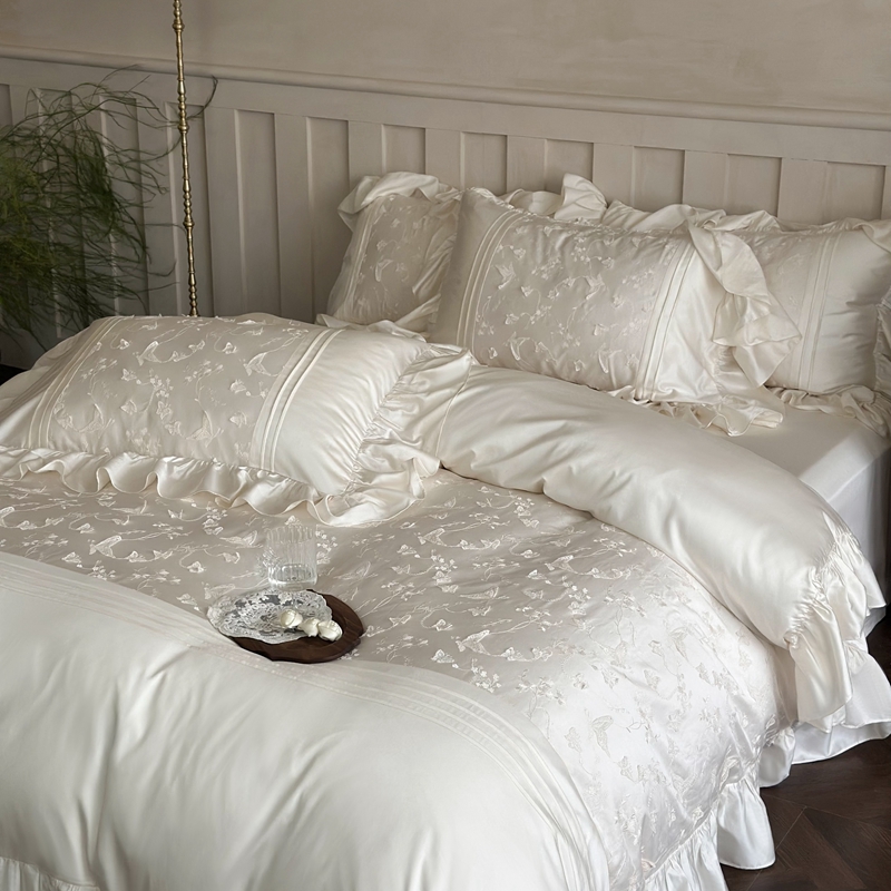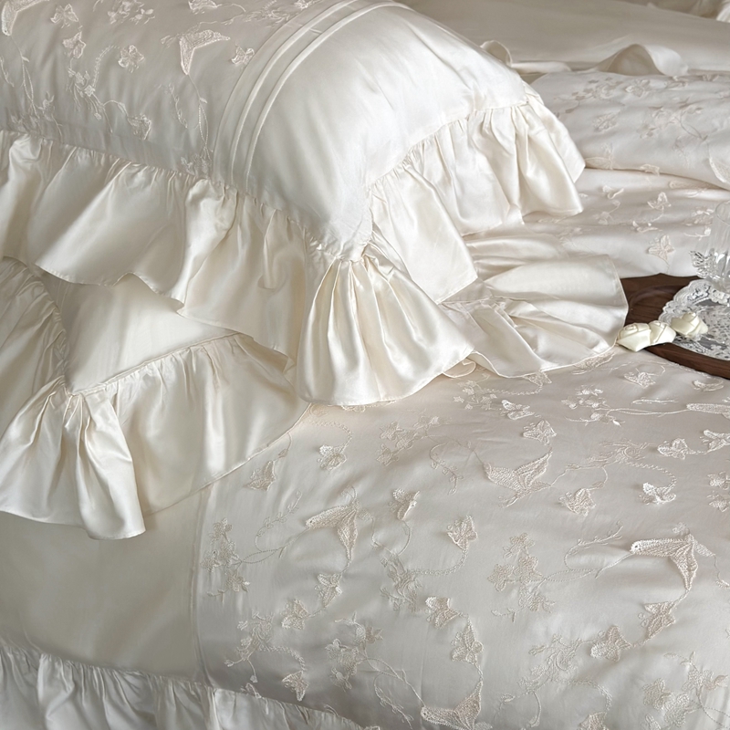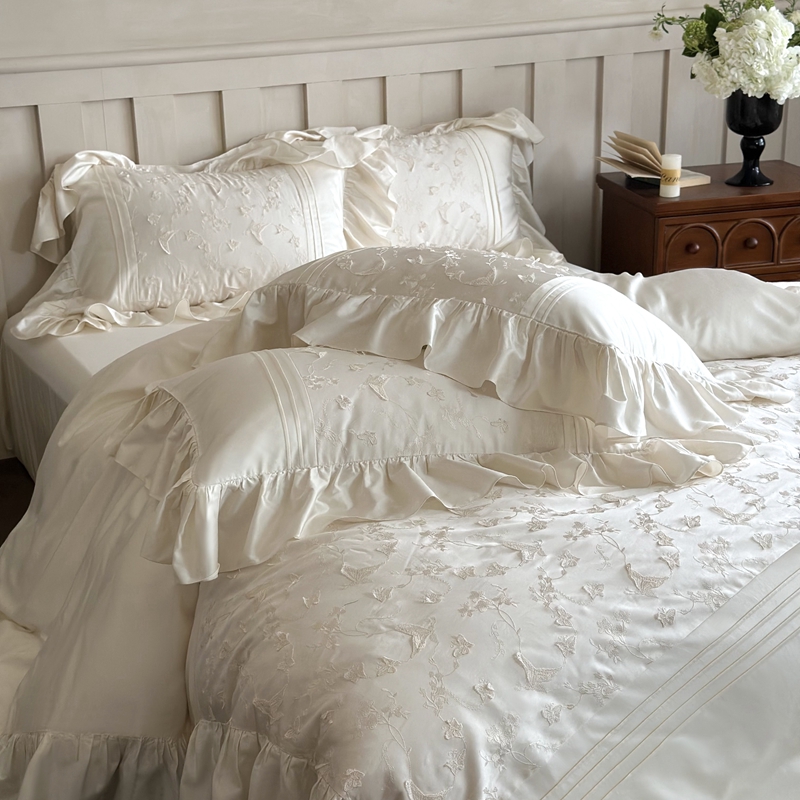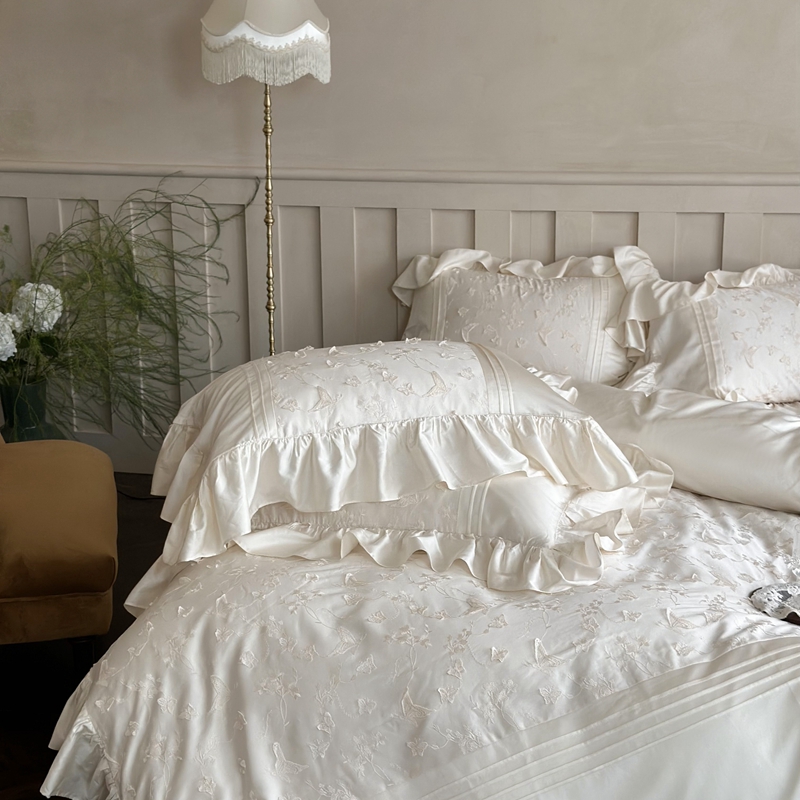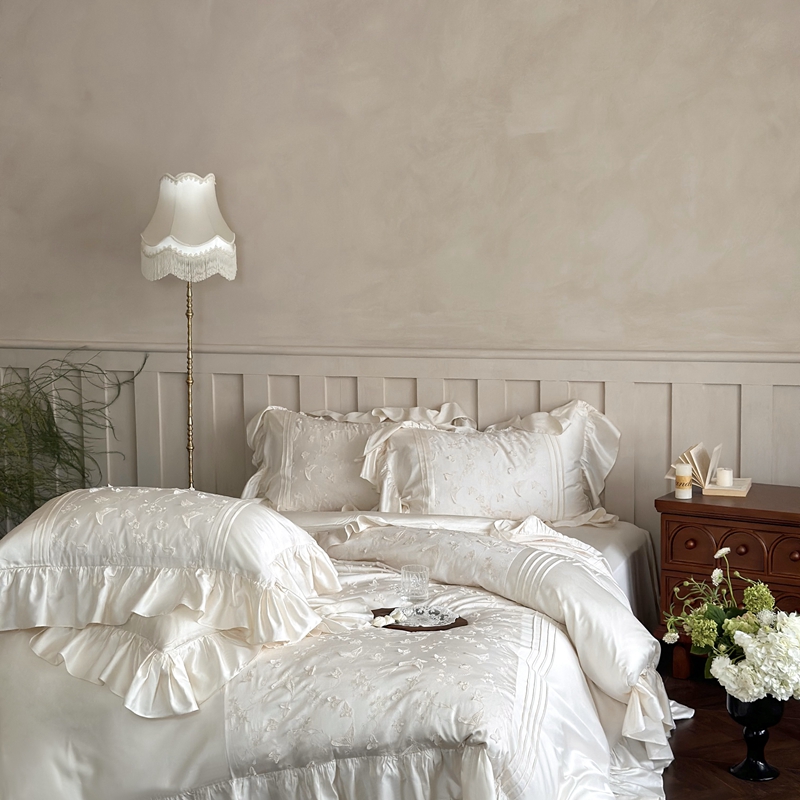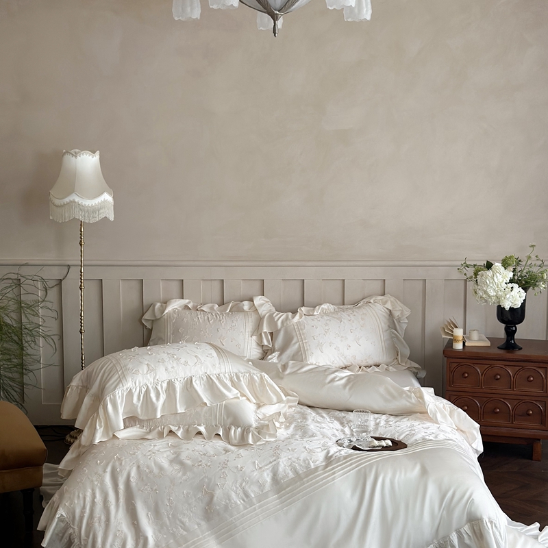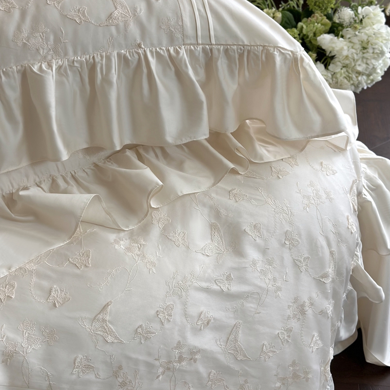 (总)佳汐蓝 2025春夏新品双层皱皱纱刺绣+织带+荷叶边四件套--白茶花,奶白,曲奇