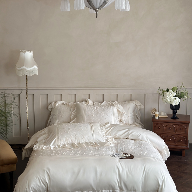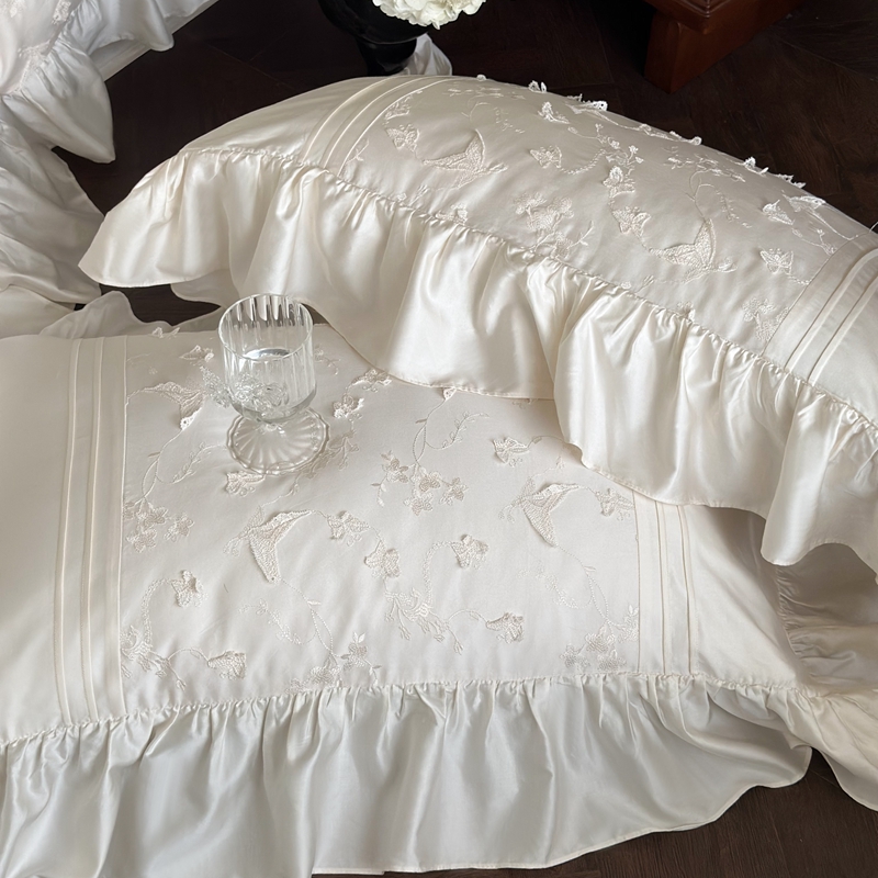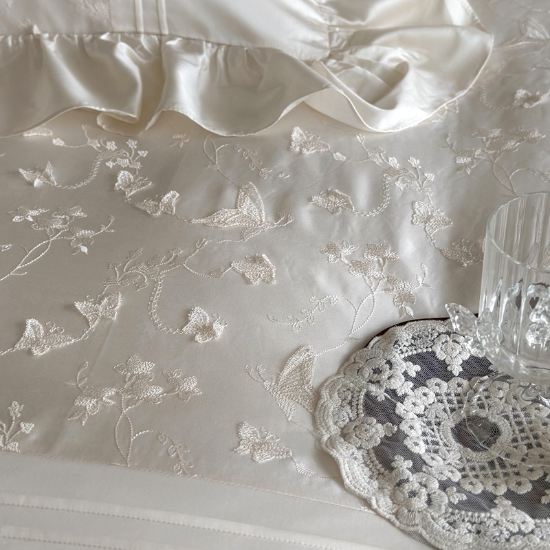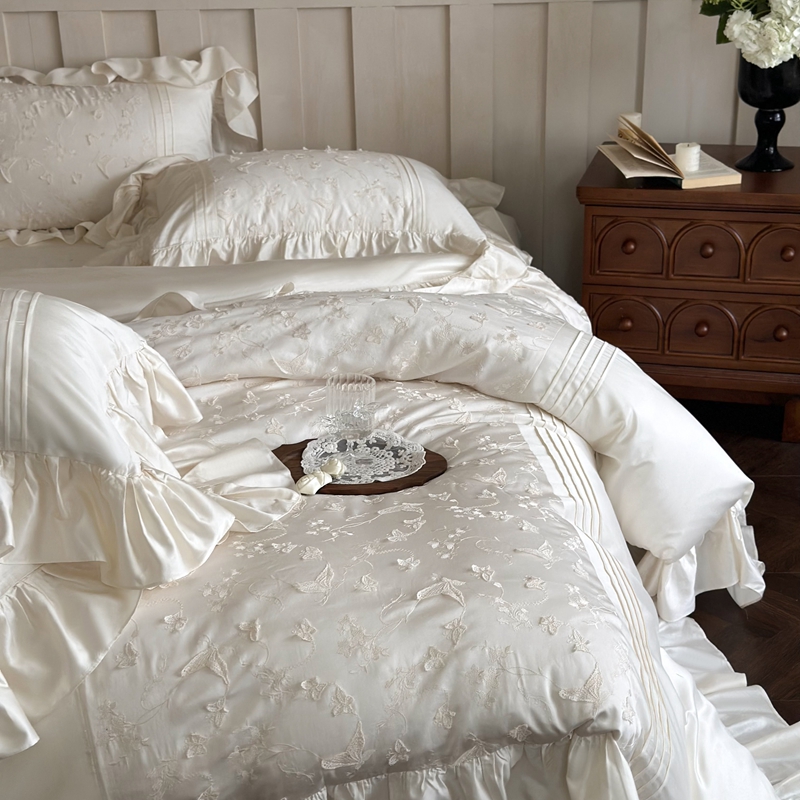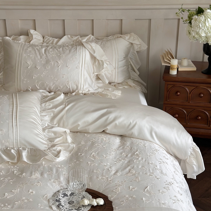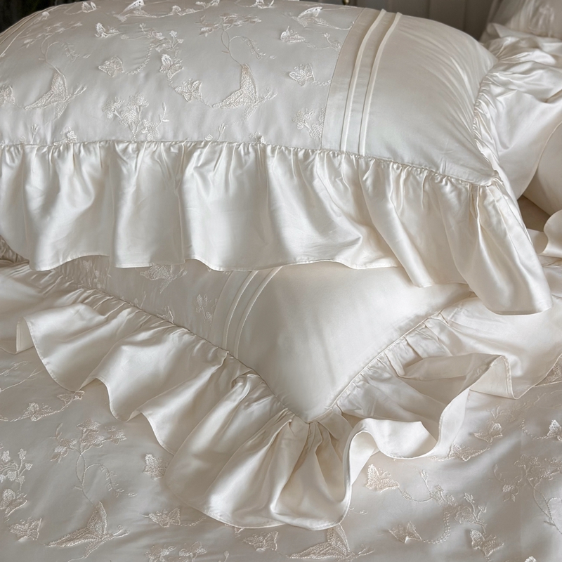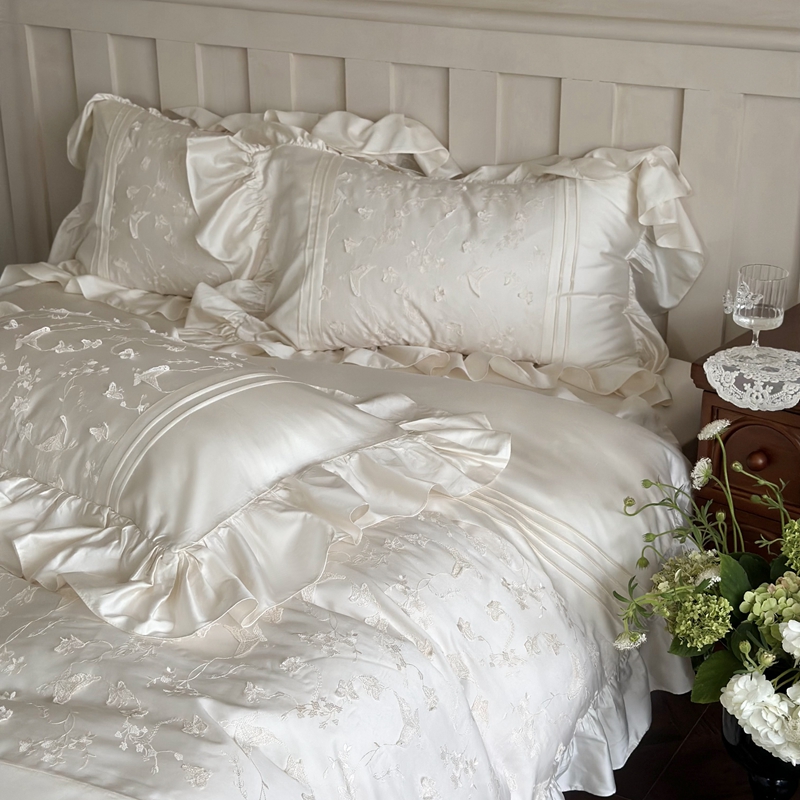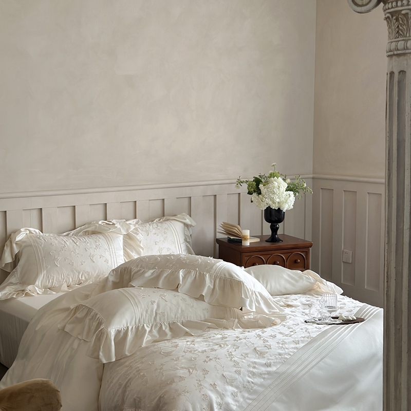 (总)佳汐蓝 2025春夏新品双层皱皱纱刺绣+织带+荷叶边四件套--白茶花,奶白,曲奇