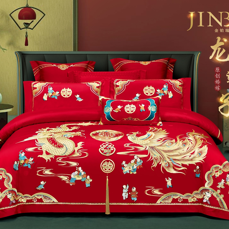 栩裕纺织 2025新款全棉刺绣婚庆四件套 龙凤送子
