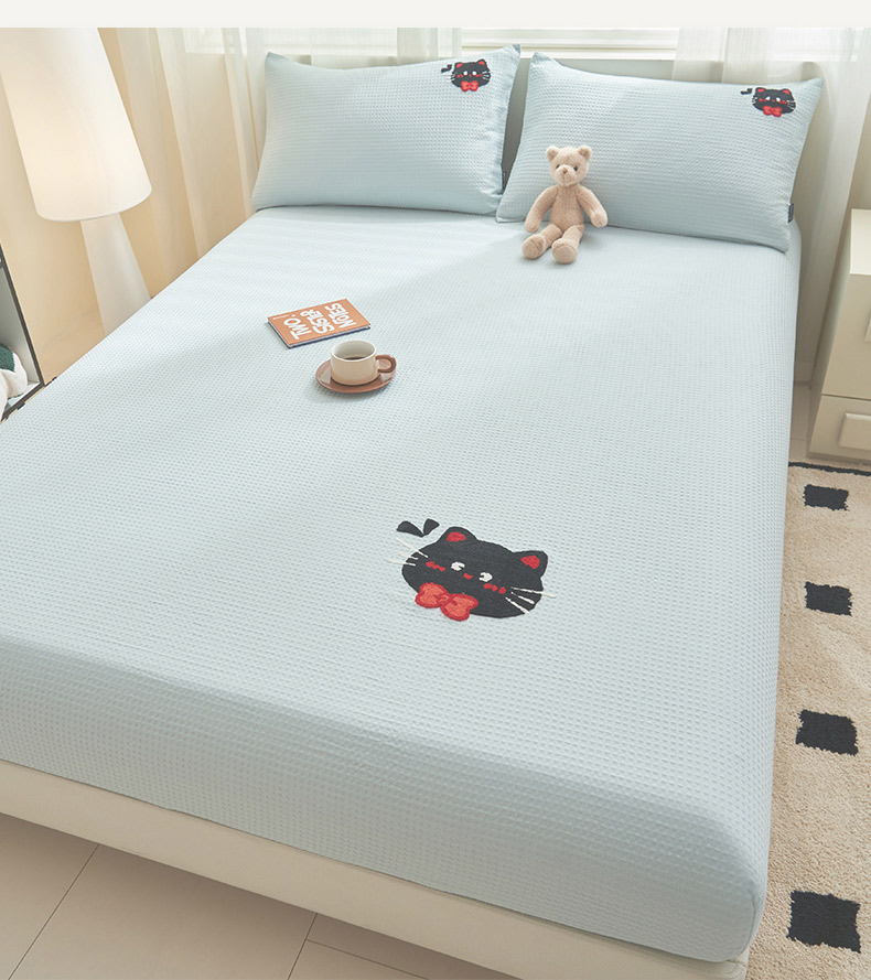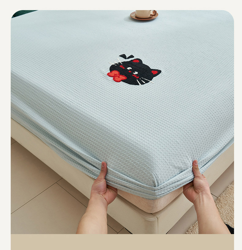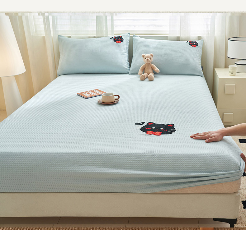 寐绸家纺 2025新款纯棉华夫格毛巾绣单床笠 绣花华夫格床笠-天蓝
