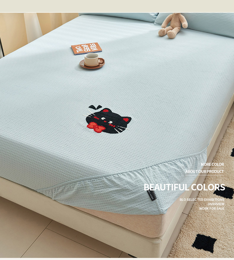 • 91家纺网 家纺一手货源 找家纺 寐绸家纺 2025新款纯棉华夫格毛巾绣单床笠 绣花华夫格床笠-天蓝