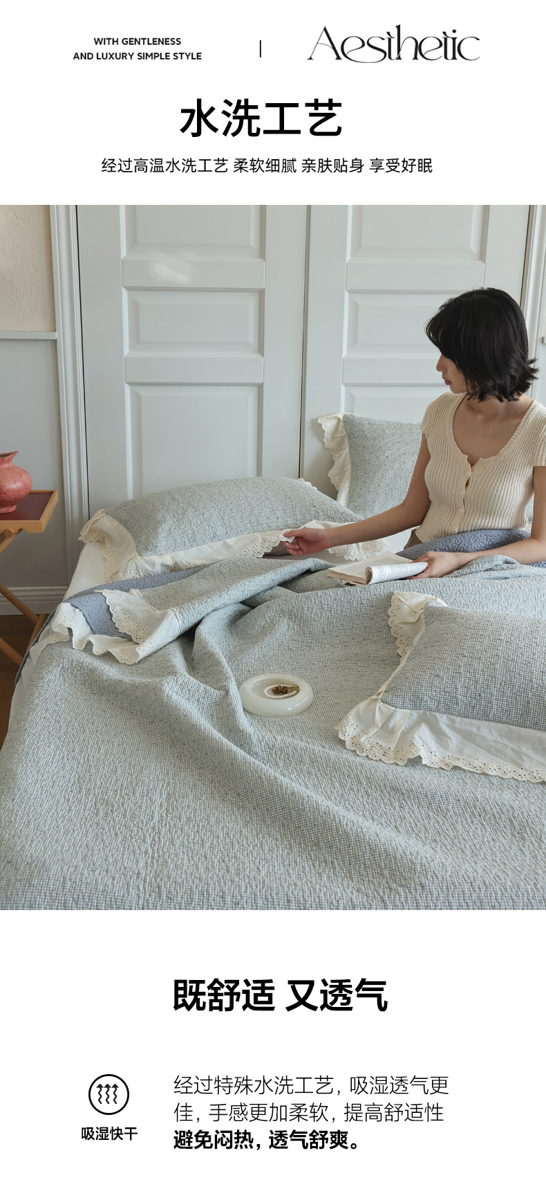 商品名称:万盛家纺 2025新款全棉水洗花边床盖三件套 樱桃周末蓝