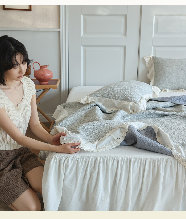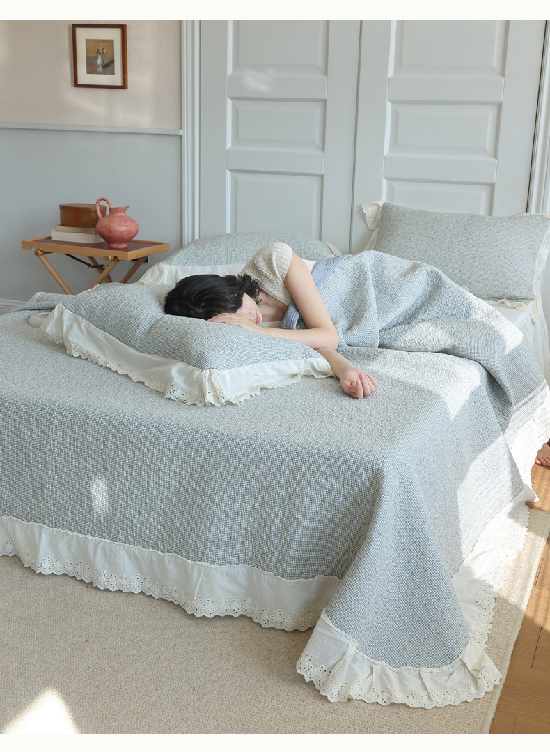 万盛家纺 2025新款全棉水洗花边床盖三件套 樱桃周末蓝