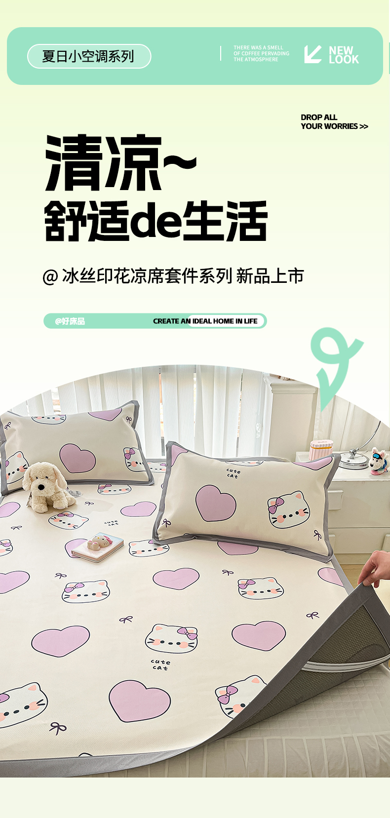 川悦生活 2025新款600D立体宽边冰丝印花凉席 晚晚喵喵