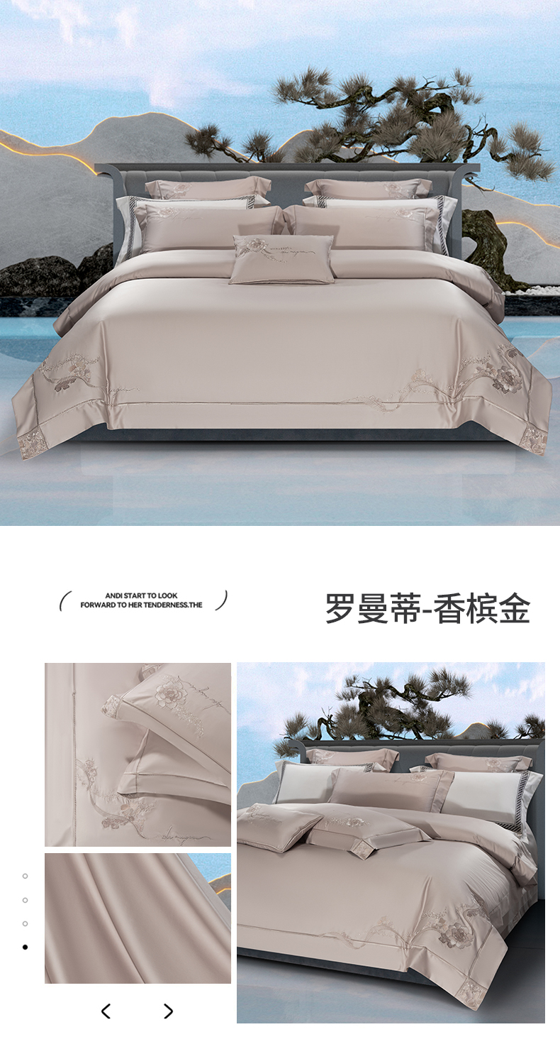 高大尚婚庆馆 2025新款长绒棉高端绣花四件套-罗曼蒂 罗曼蒂香槟金