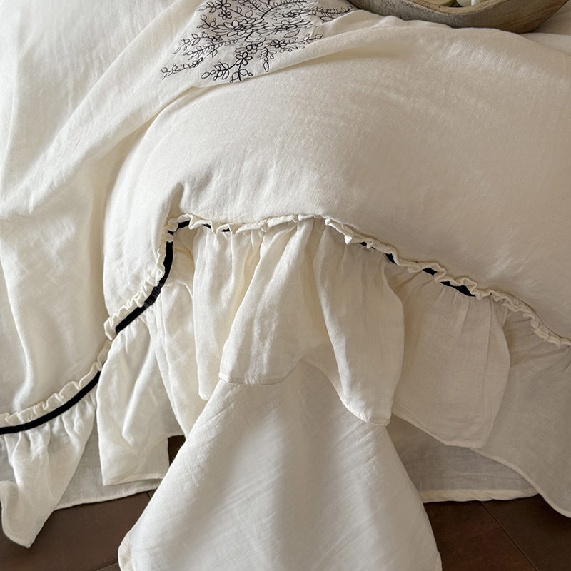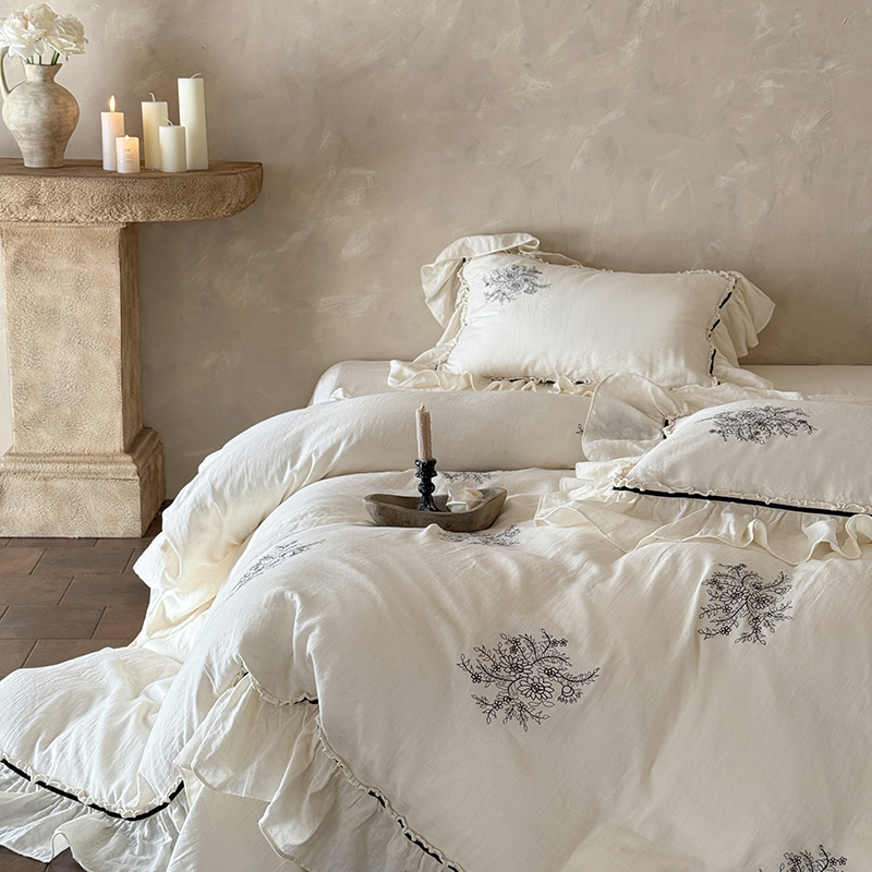 (总)佳汐蓝 2025春夏新品双层皱皱纱刺绣+织带+荷叶边四件套--白茶花,奶白,曲奇
