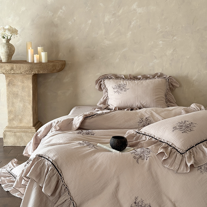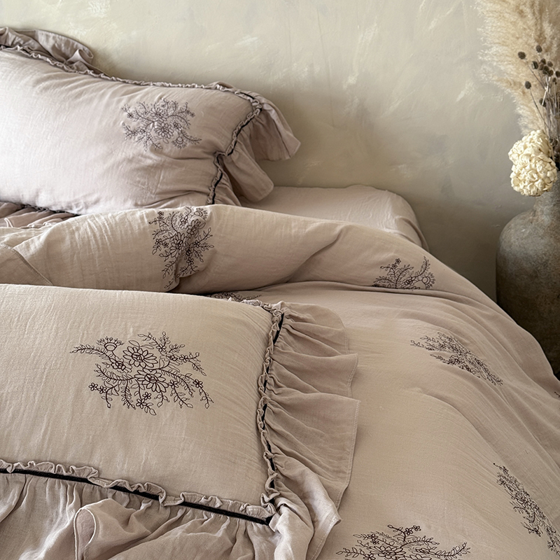 (总)佳汐蓝 2025春夏新品双层皱皱纱刺绣+织带+荷叶边四件套--白茶花