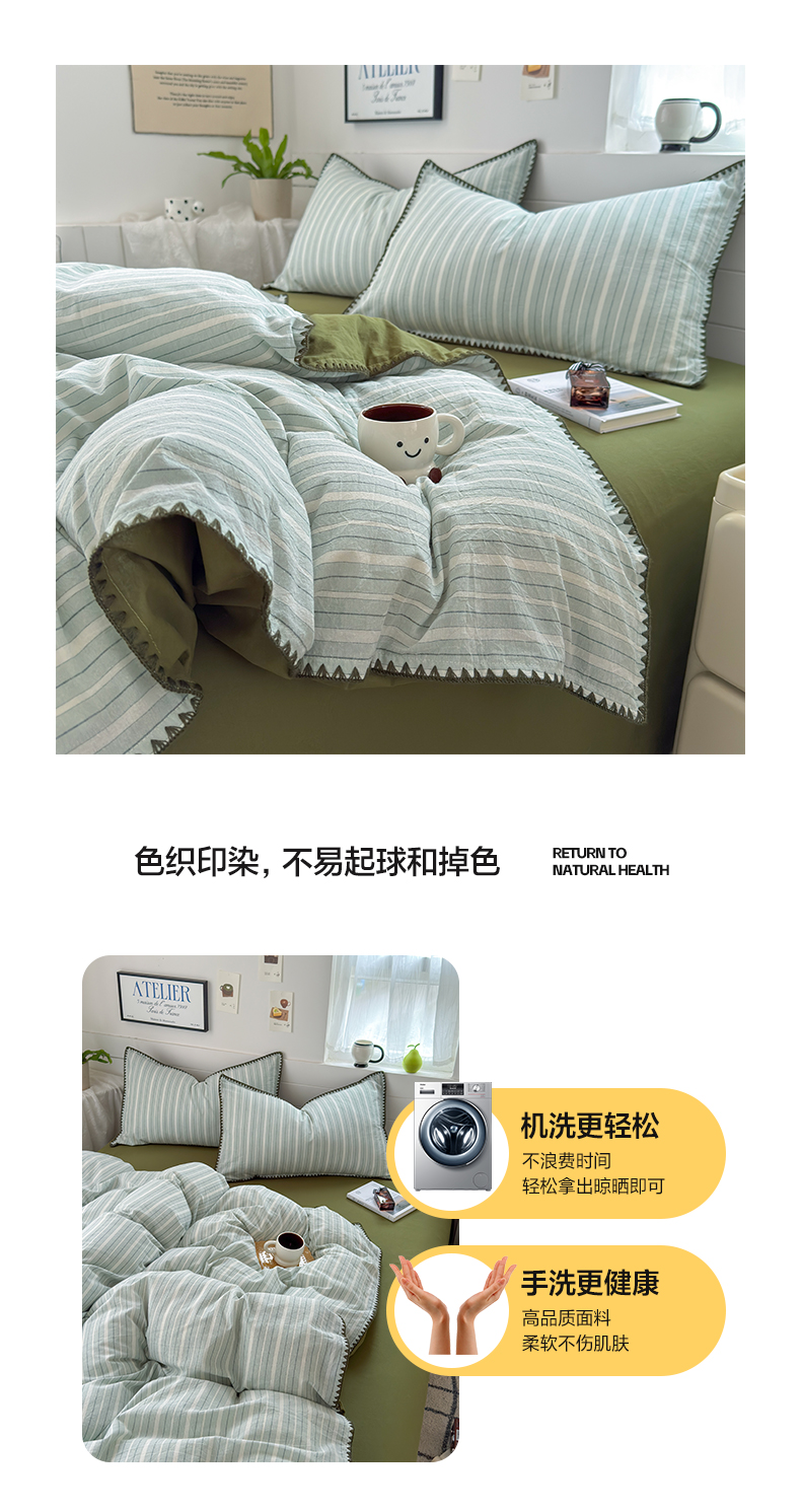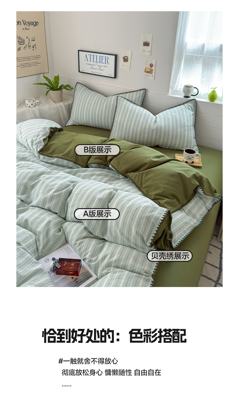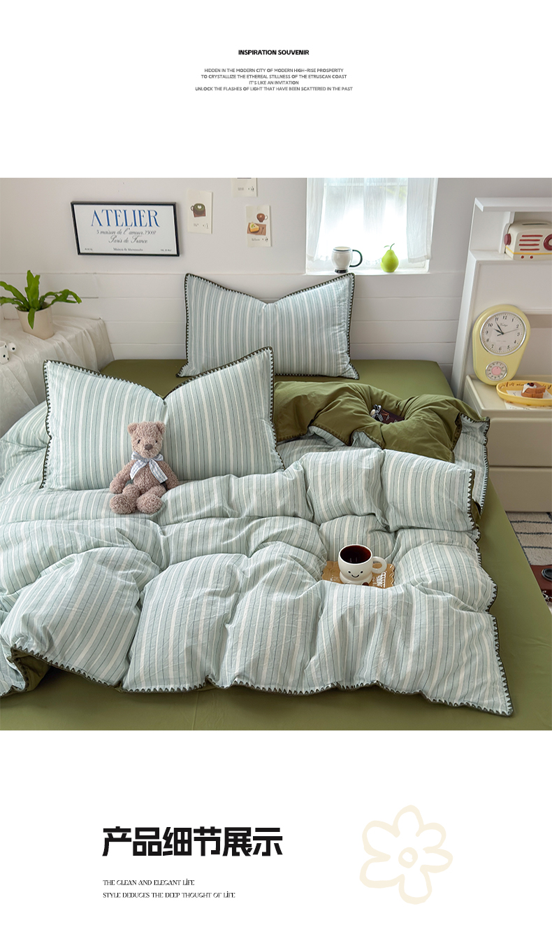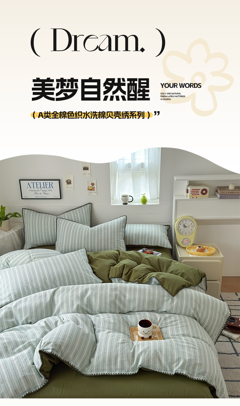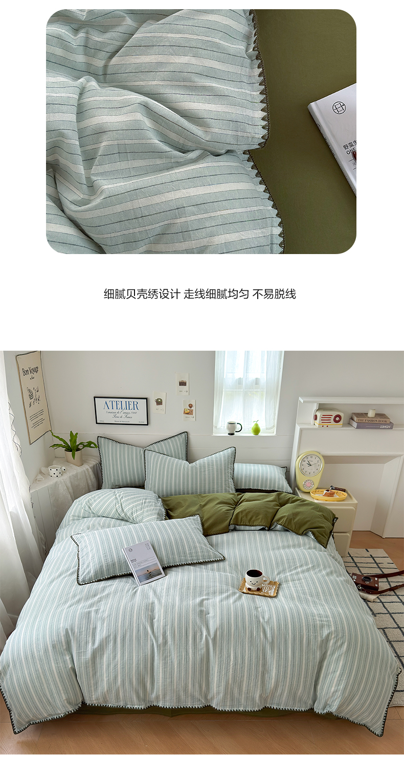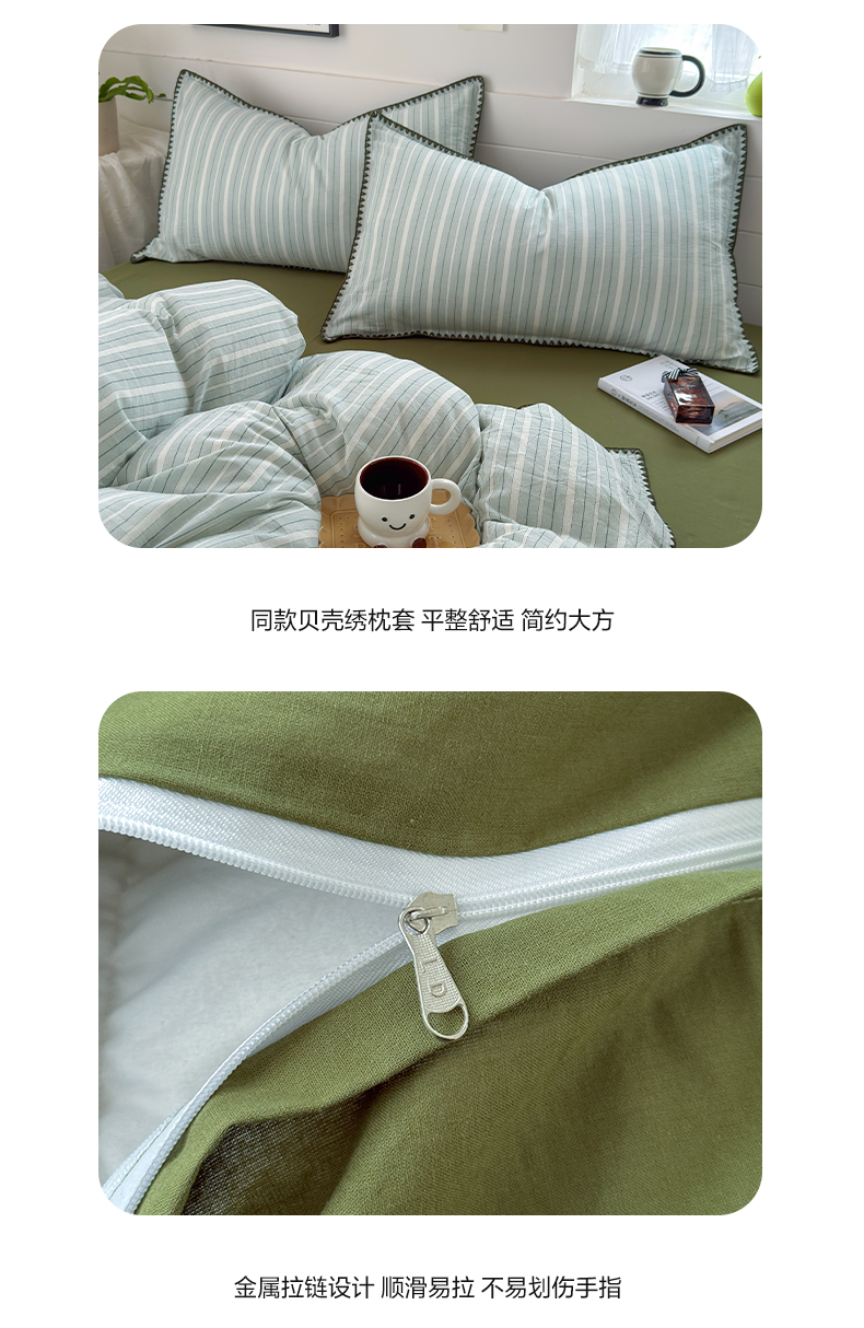 当前位置: 91家纺网 > 商品网购 > 床品套件 > 四件套 > 水洗棉四件套 > 2025新款A类全棉色织水洗棉贝壳绣条纹系列四件套 雅诗绿