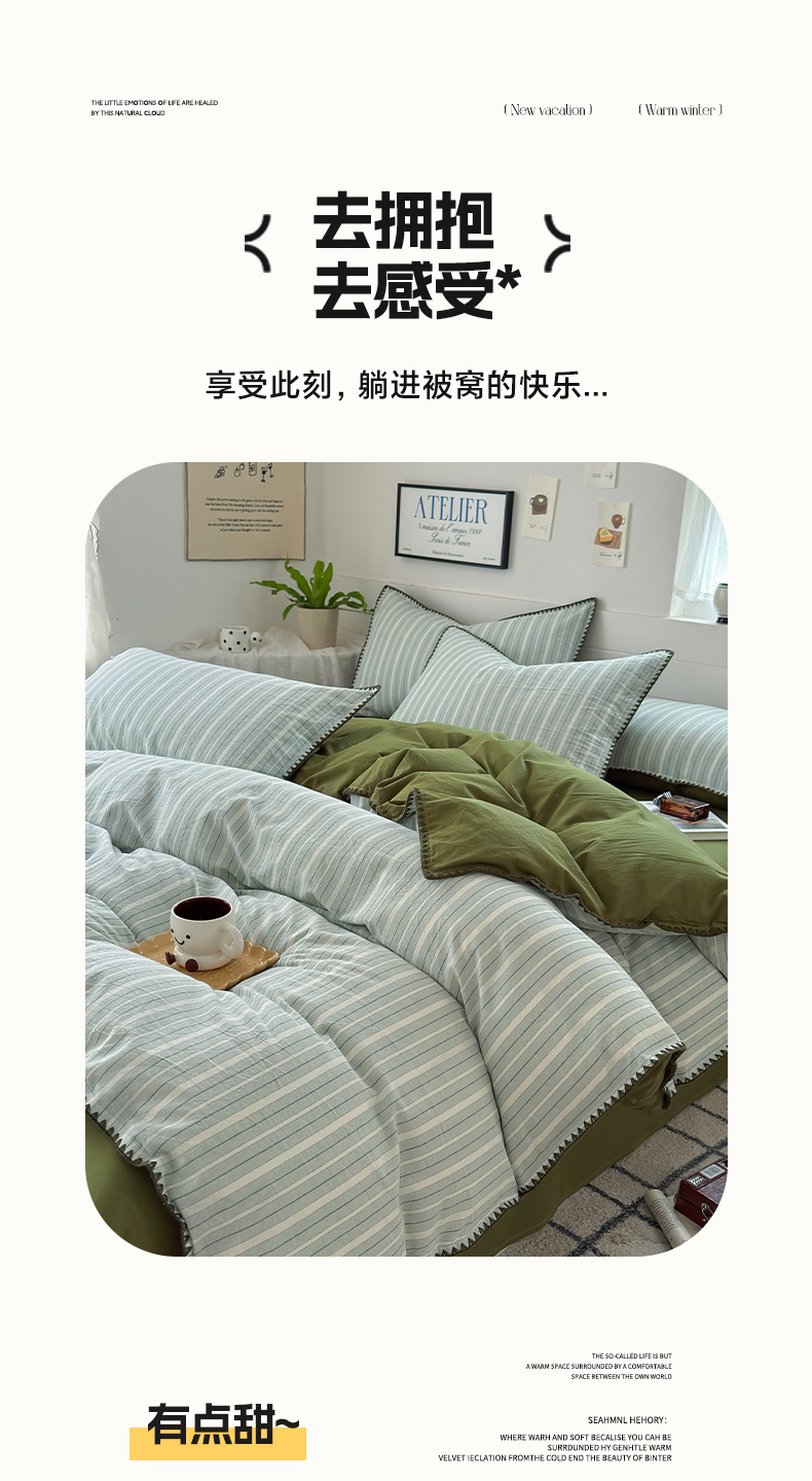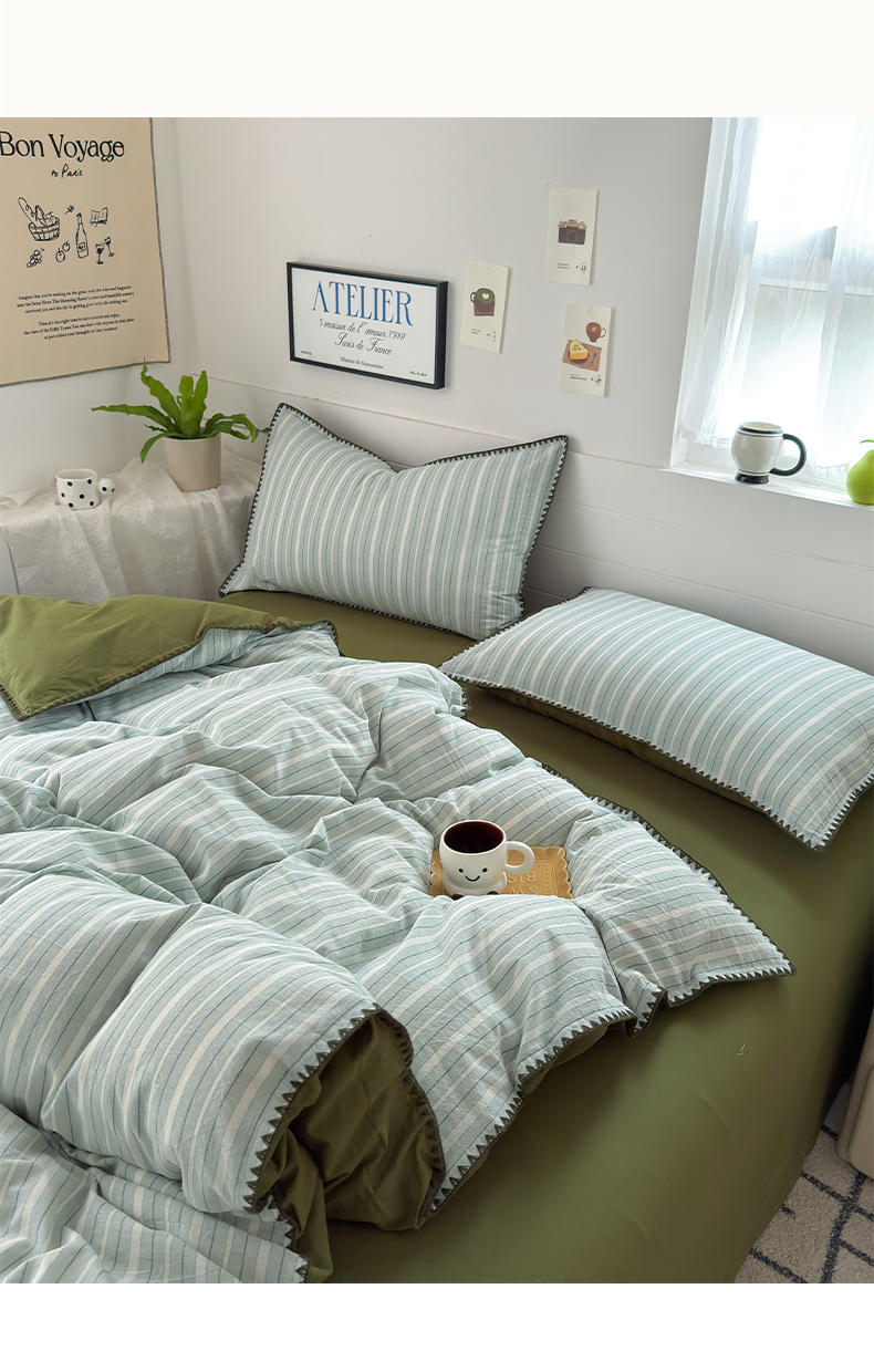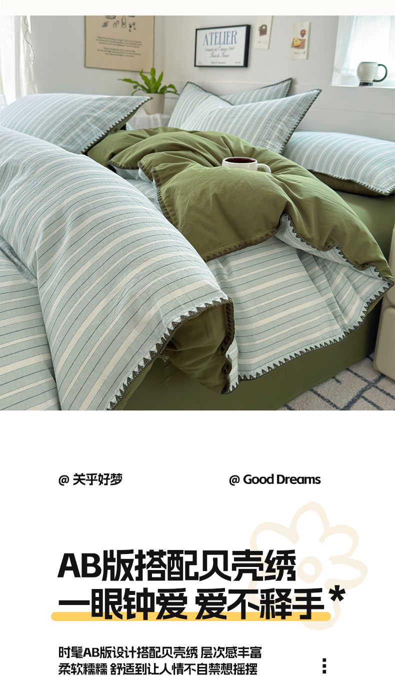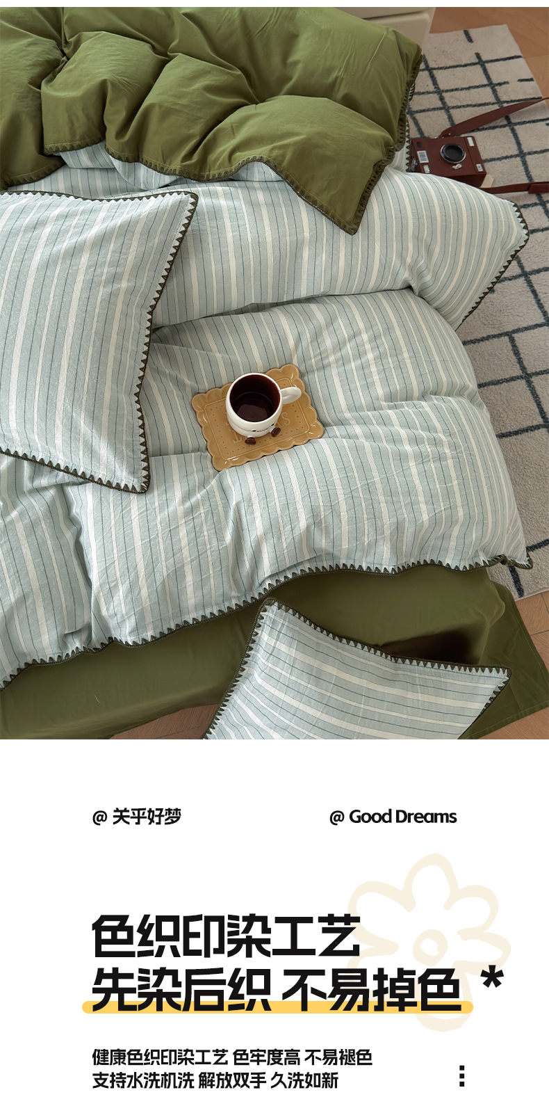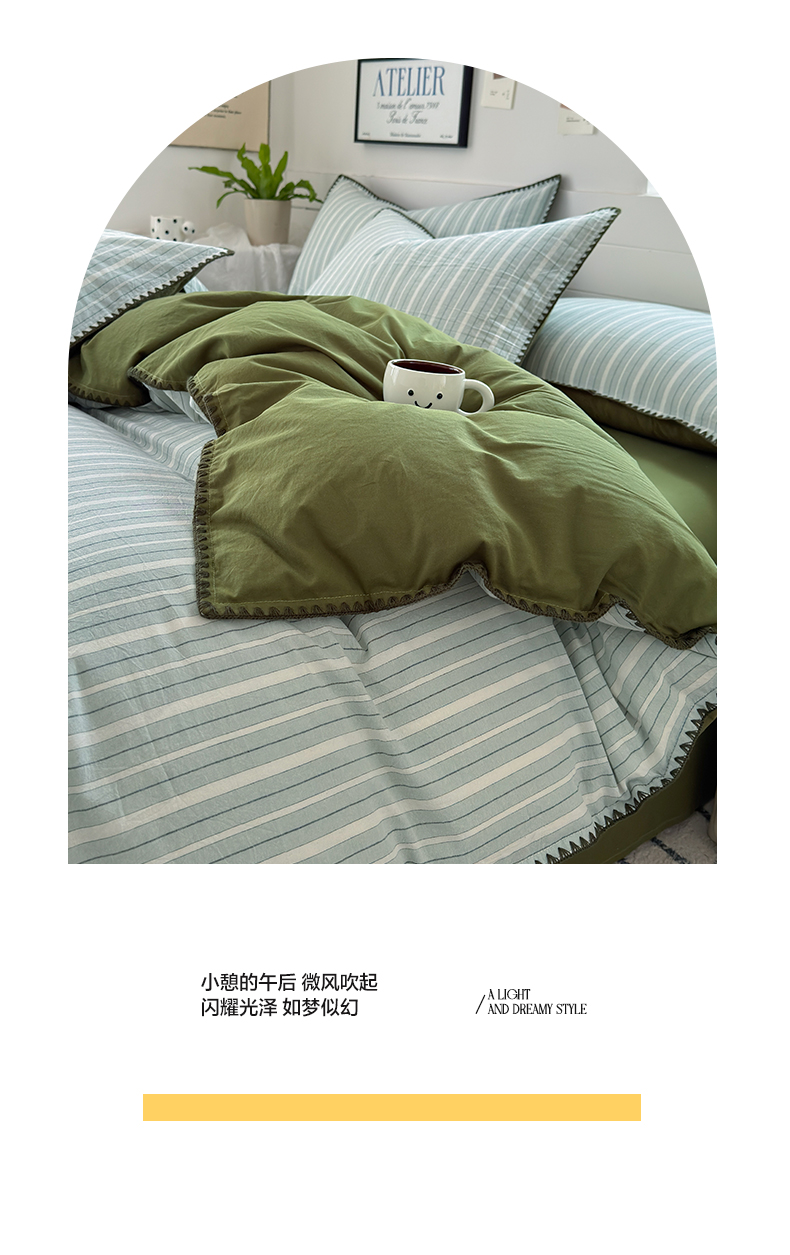 当前位置: 91家纺网 > 商品网购 > 床品套件 > 四件套 > 水洗棉四件套 > 2025新款A类全棉色织水洗棉贝壳绣条纹系列四件套 雅诗绿