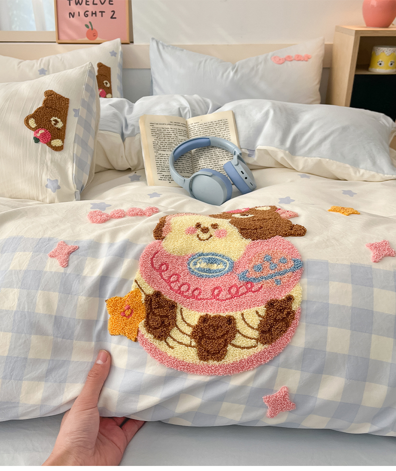 如一 2025新款A类ins风卡通毛巾绣水洗棉四件套 蛋糕熊