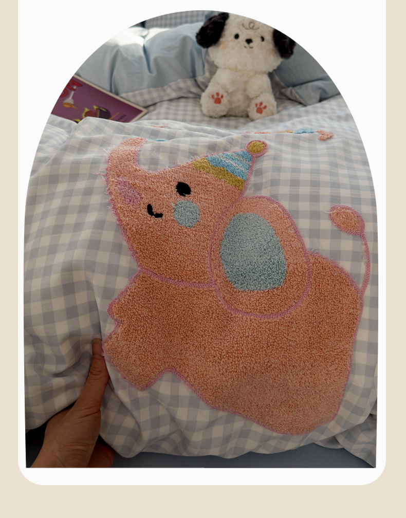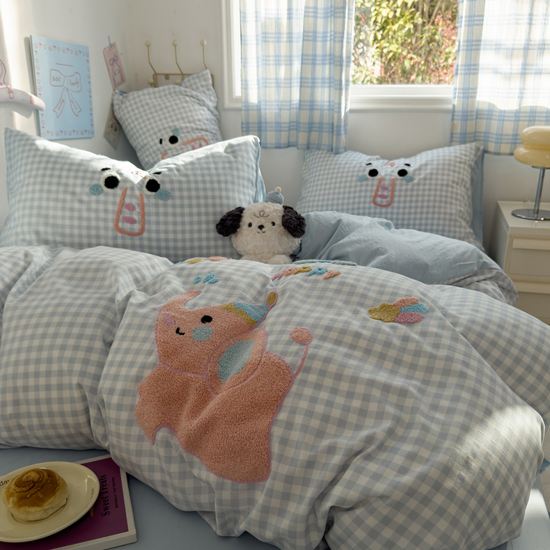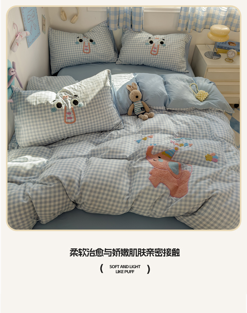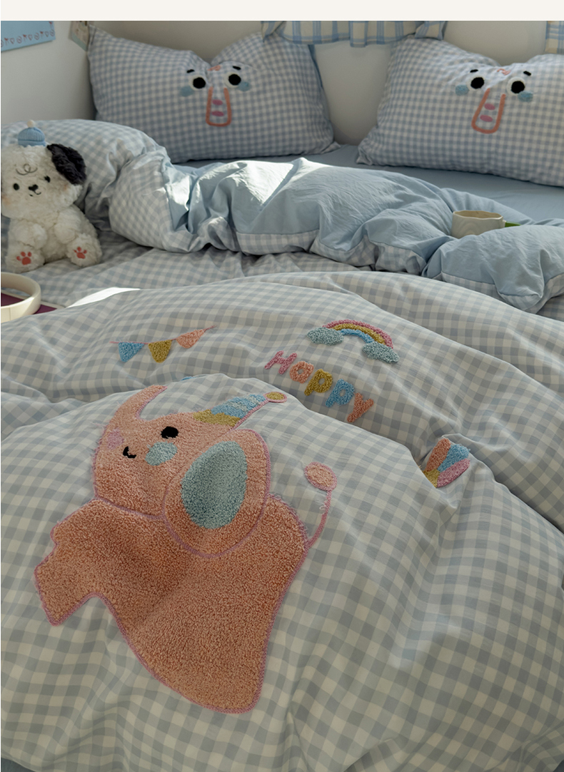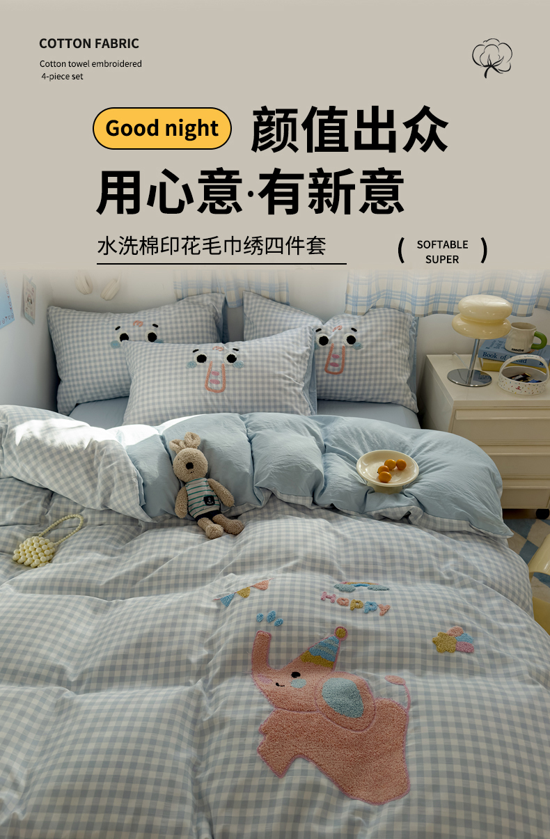 当前位置: 91家纺网 > 商品网购 > 床品套件 > 四件套 > 磨毛活性四件套 > 优兰朵 2025新款学生卡通水洗棉毛巾绣三件套床品四件套系列(提供买家秀) 快乐小飞象-蓝格
