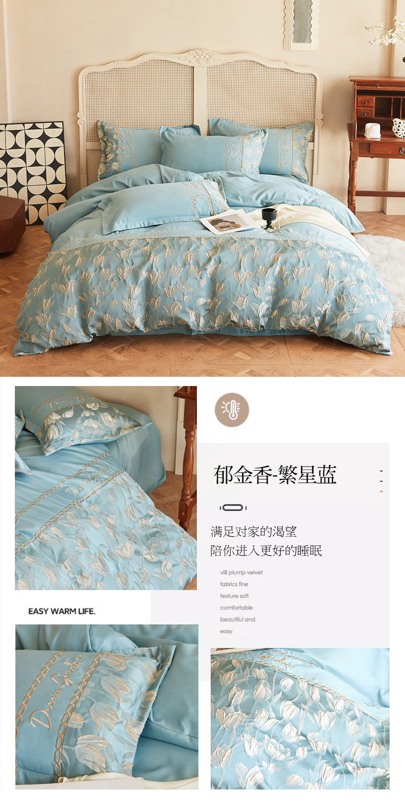 商品名称:菲儿2025新款冰丝浮雕提花绣花四件套 郁金香-繁星蓝