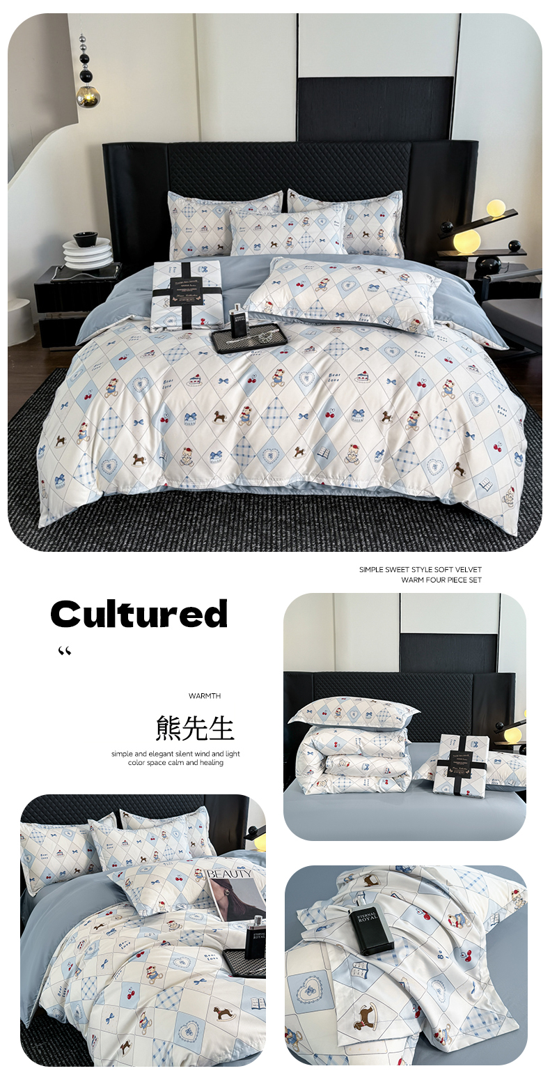 晚爱家居 2025轻奢水洗天丝印花水洗真丝四件套(硬包丝带款) 熊先生