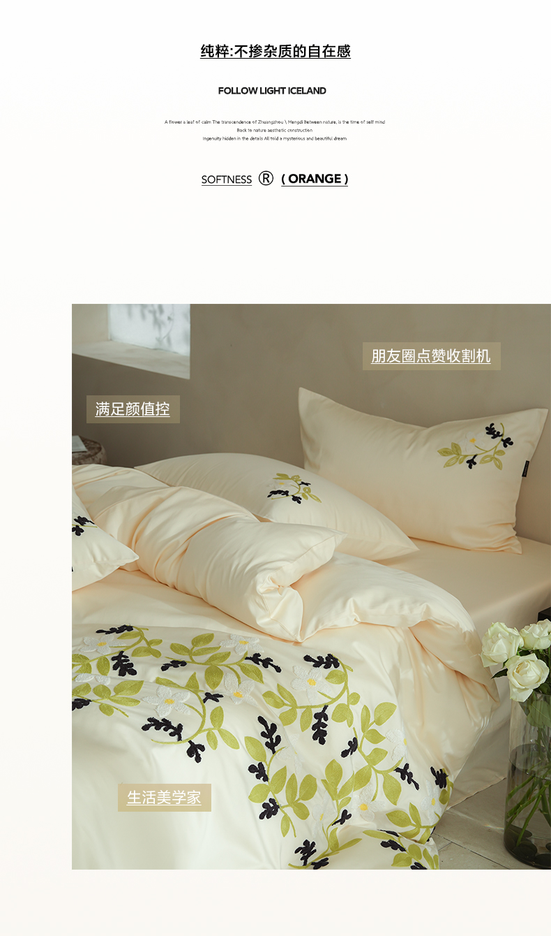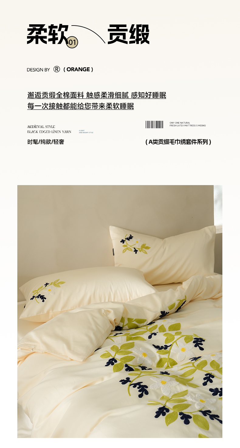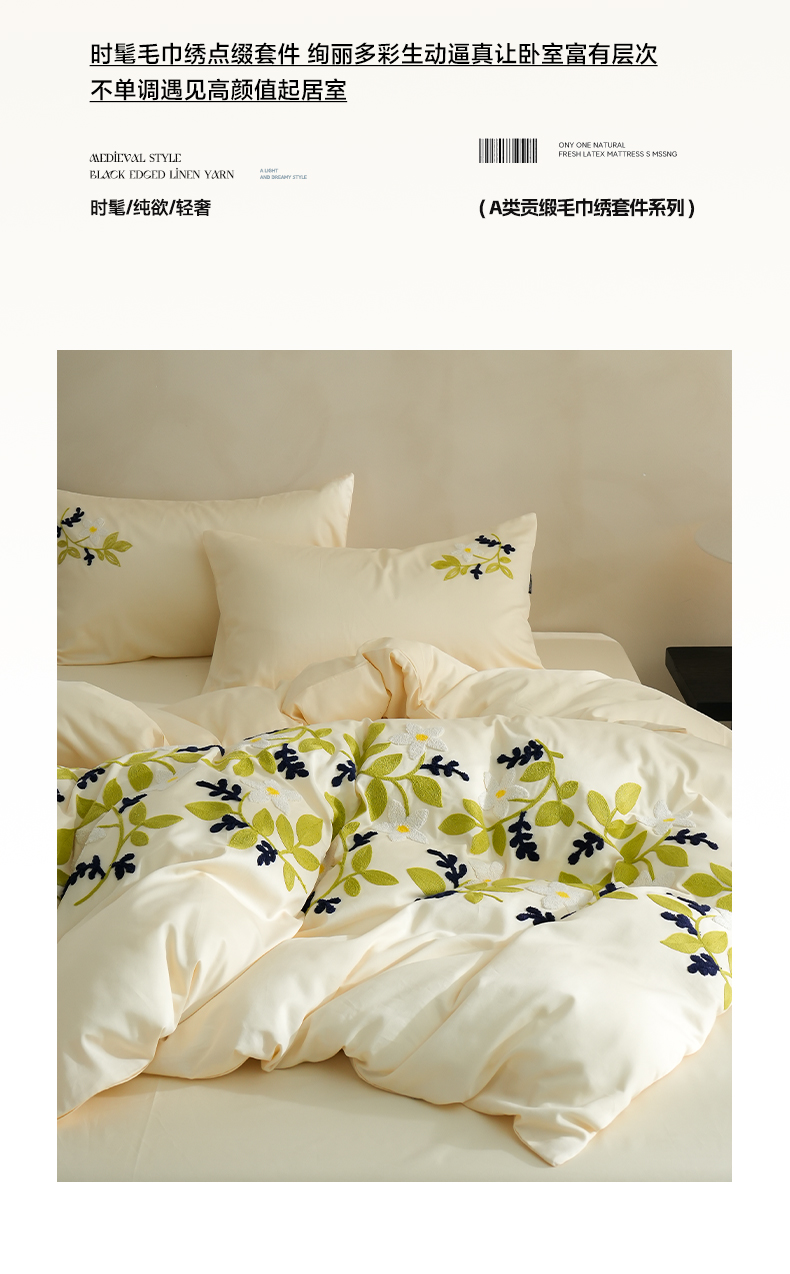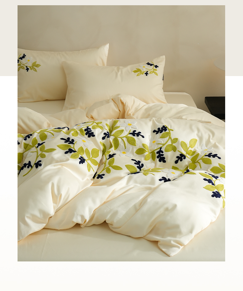 秀色家纺 2025新款小清新60s长绒棉四件套纯棉全棉毛巾绣被套床单轻奢床品-网红风 绿叶白花