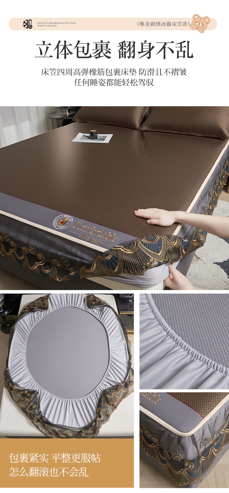 情恒家纺 2025新款冰藤席床笠款三件套 皇朝 深棕