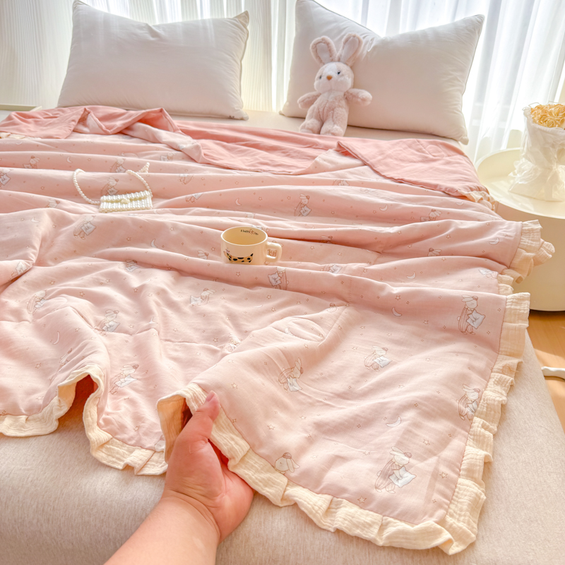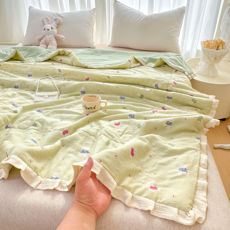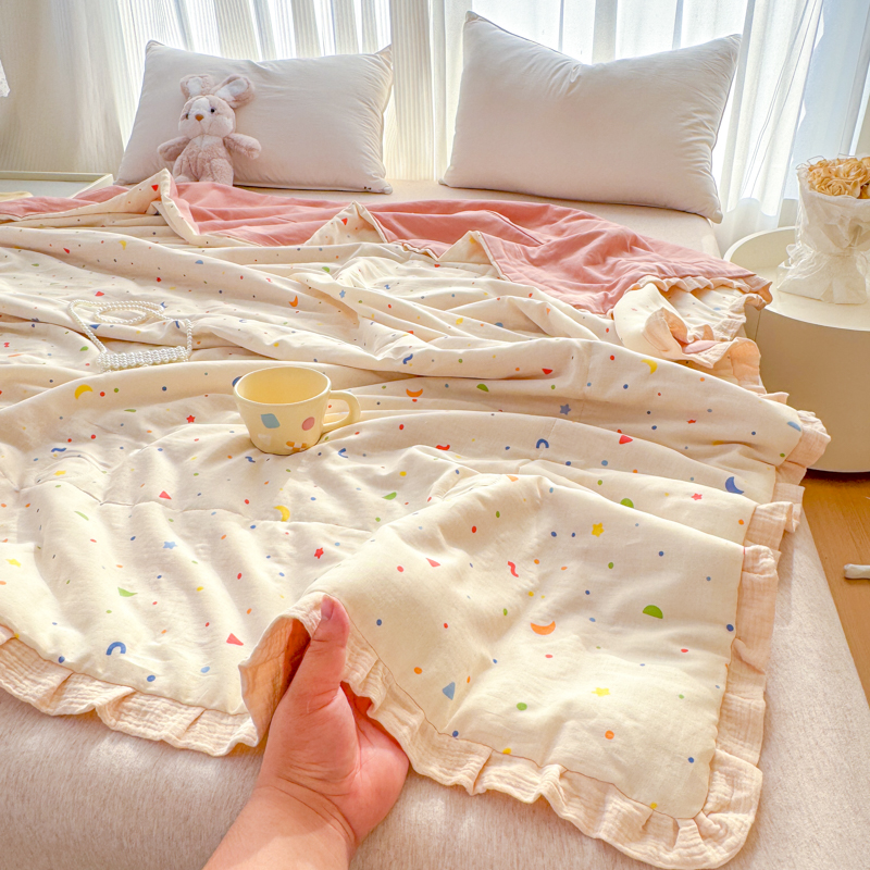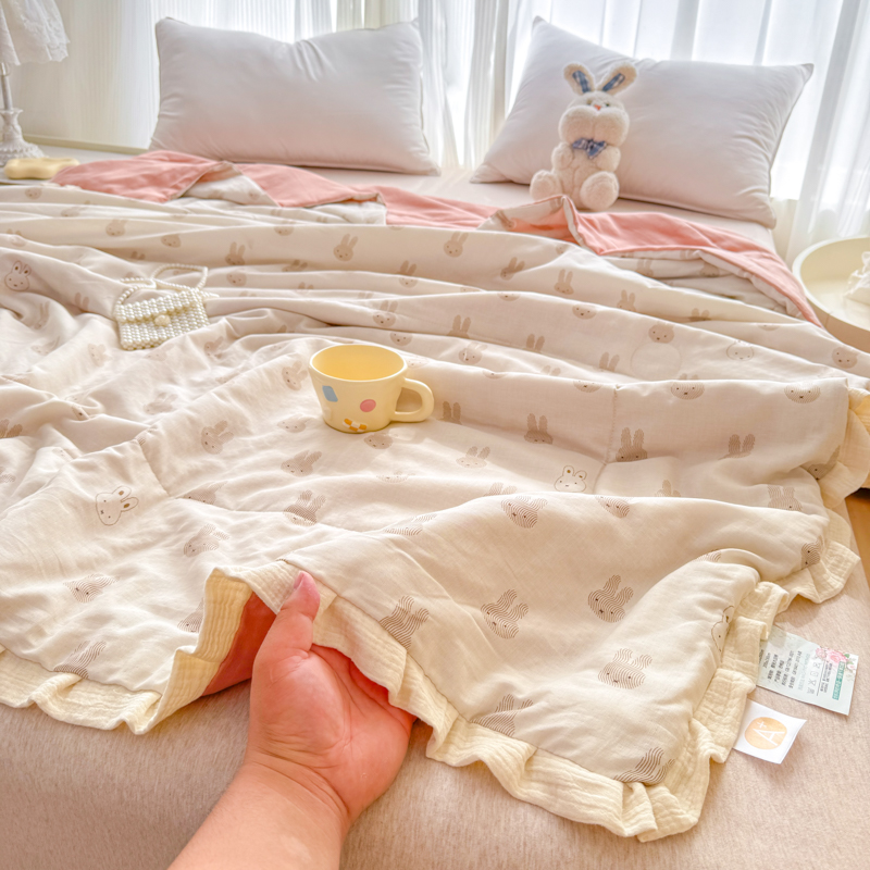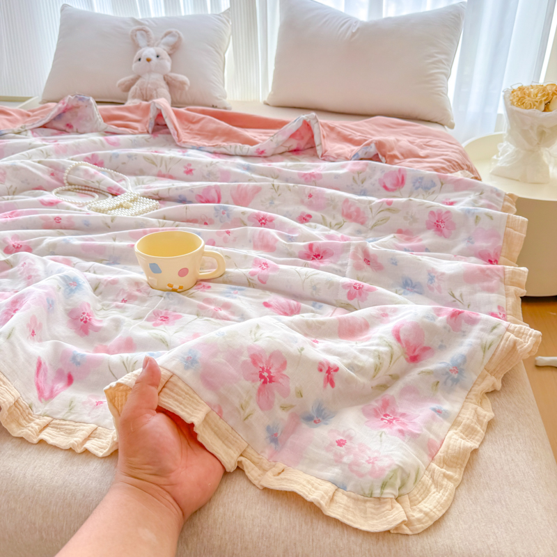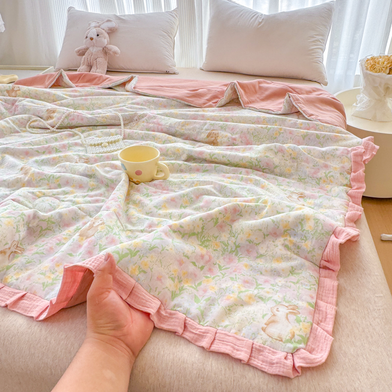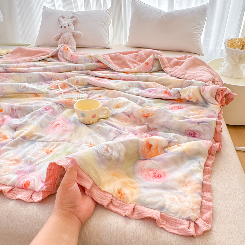 被子 > 夏被 > (总)【苏东来】2025高端韩版皱皱花边母婴级印花全棉双层纱夏被清新公主风法式蕾丝花边纯棉双层纱夏凉被空调被春秋被四件套