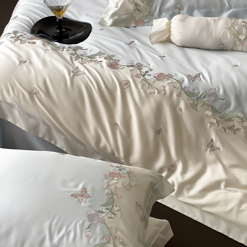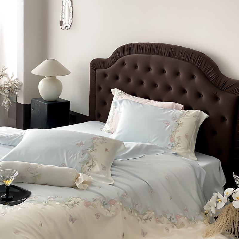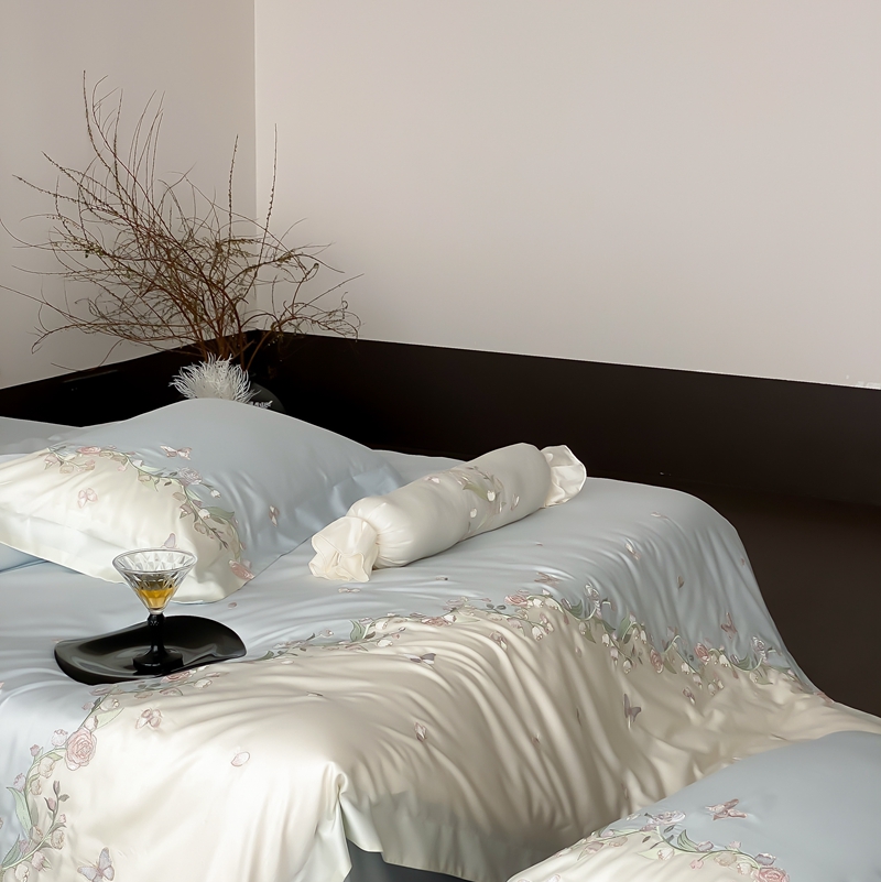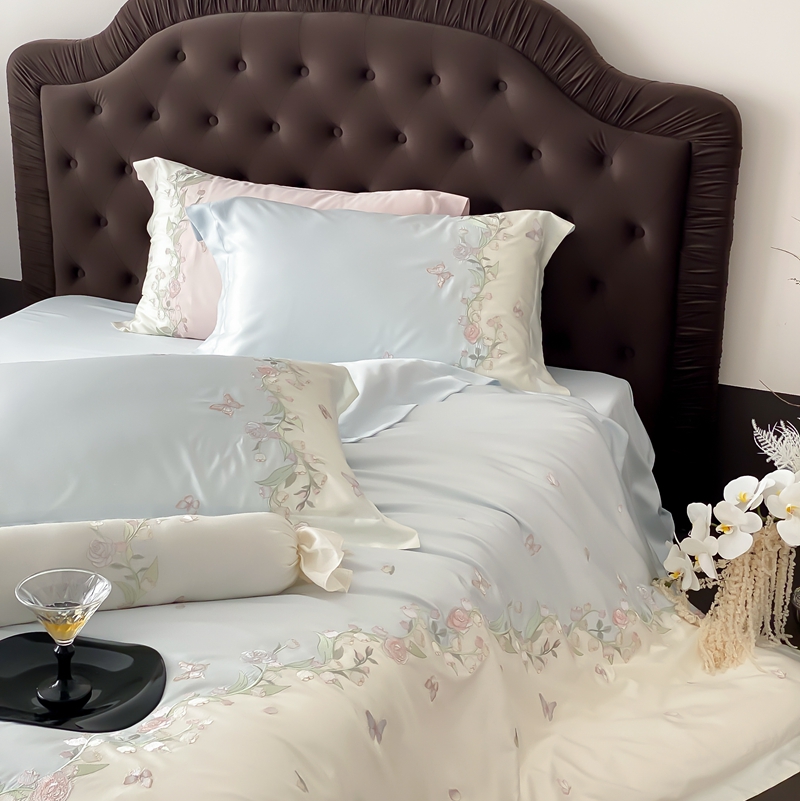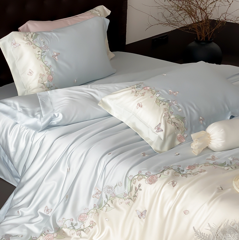(总)佳汐蓝家纺 2025春夏新款天丝棉蝶舞繁花绣花天丝四件套,蝶舞繁花·粉,蝶舞繁花·蓝