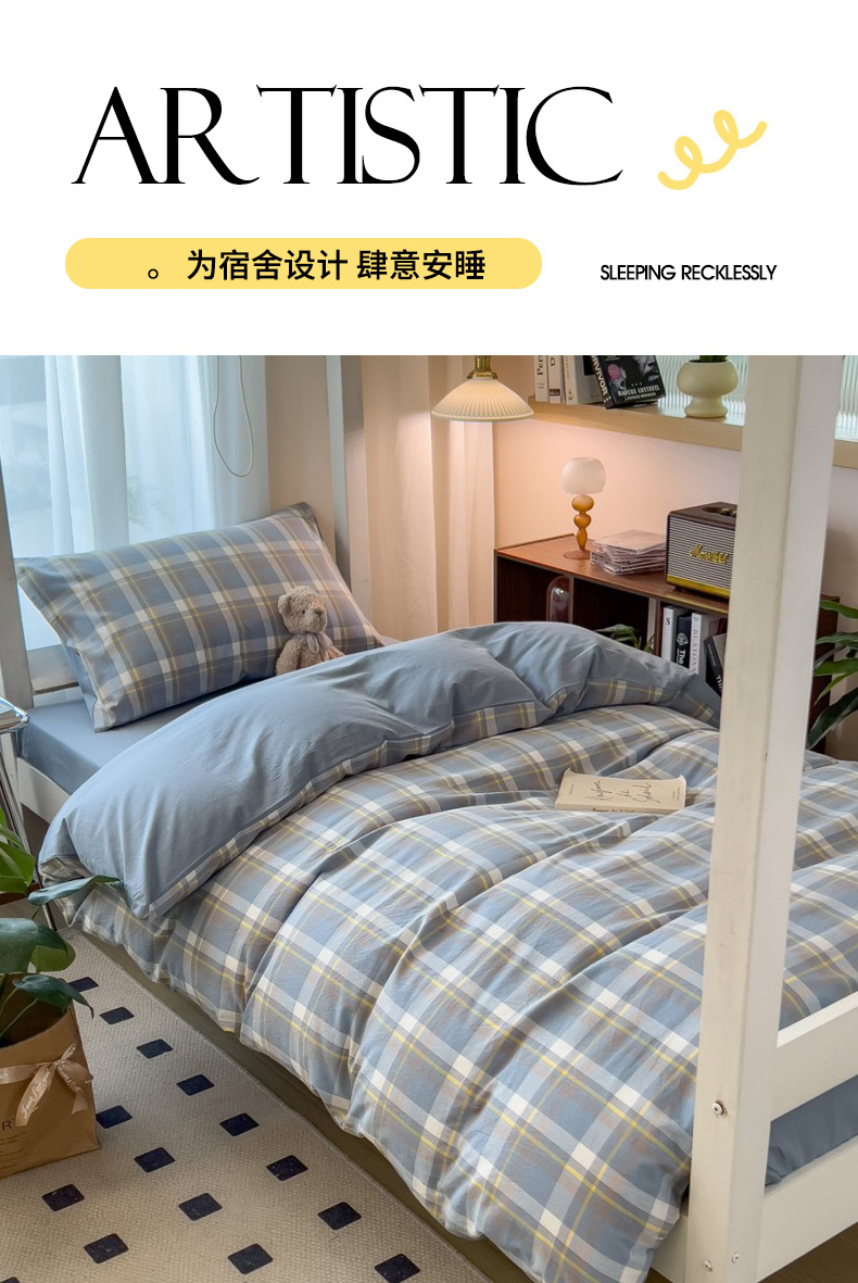 商品名称:宝士康家纺 2025春夏新款简约水洗棉学生三件套宿舍三件套上下铺三件套套件学生六件套套件(床单款) 天蓝中格