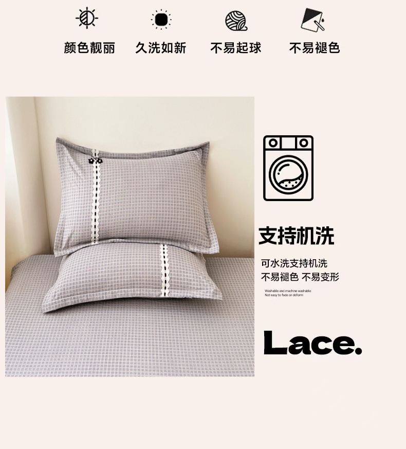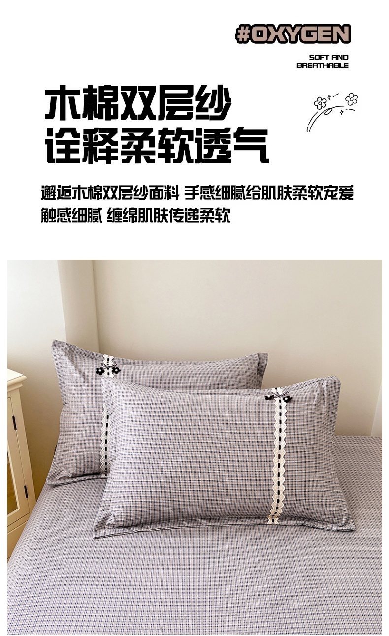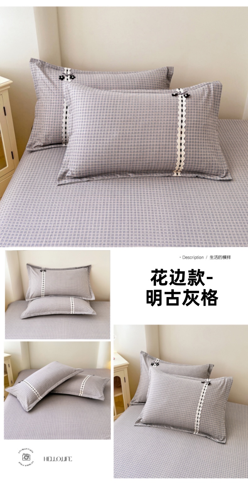 商品名称:梦舒羽 2025新款双层纱蕾丝花边格子枕套宿舍单人枕芯套内胆套一对装 明古灰格