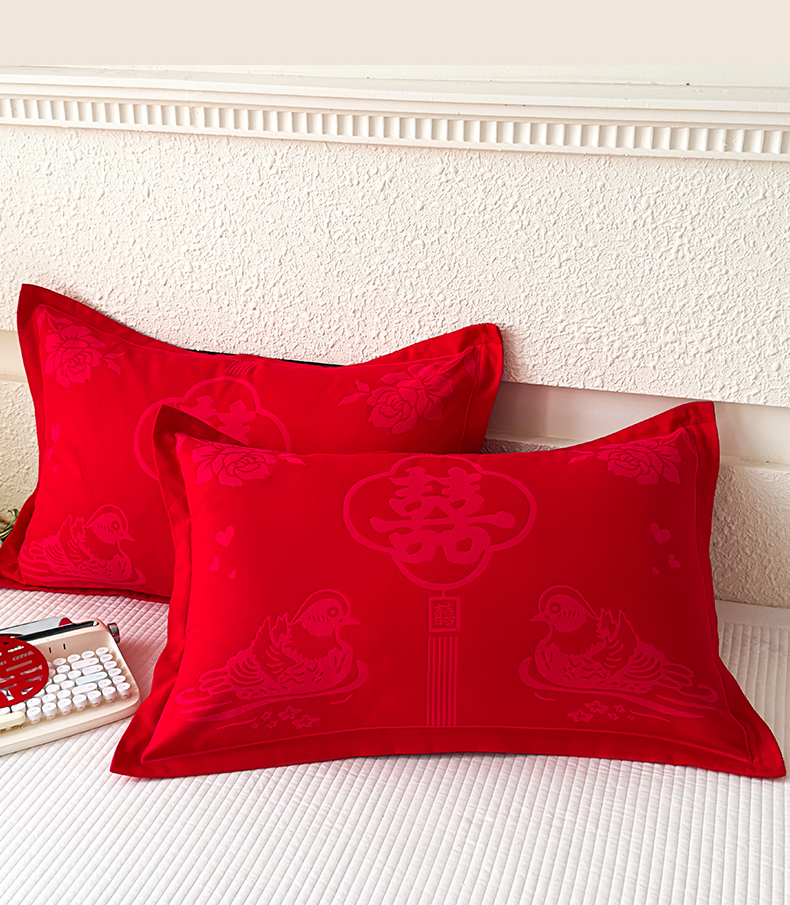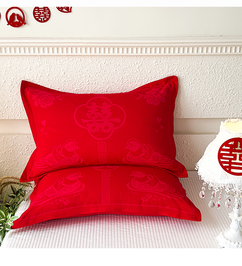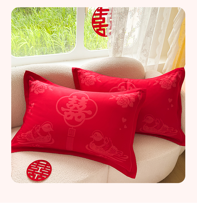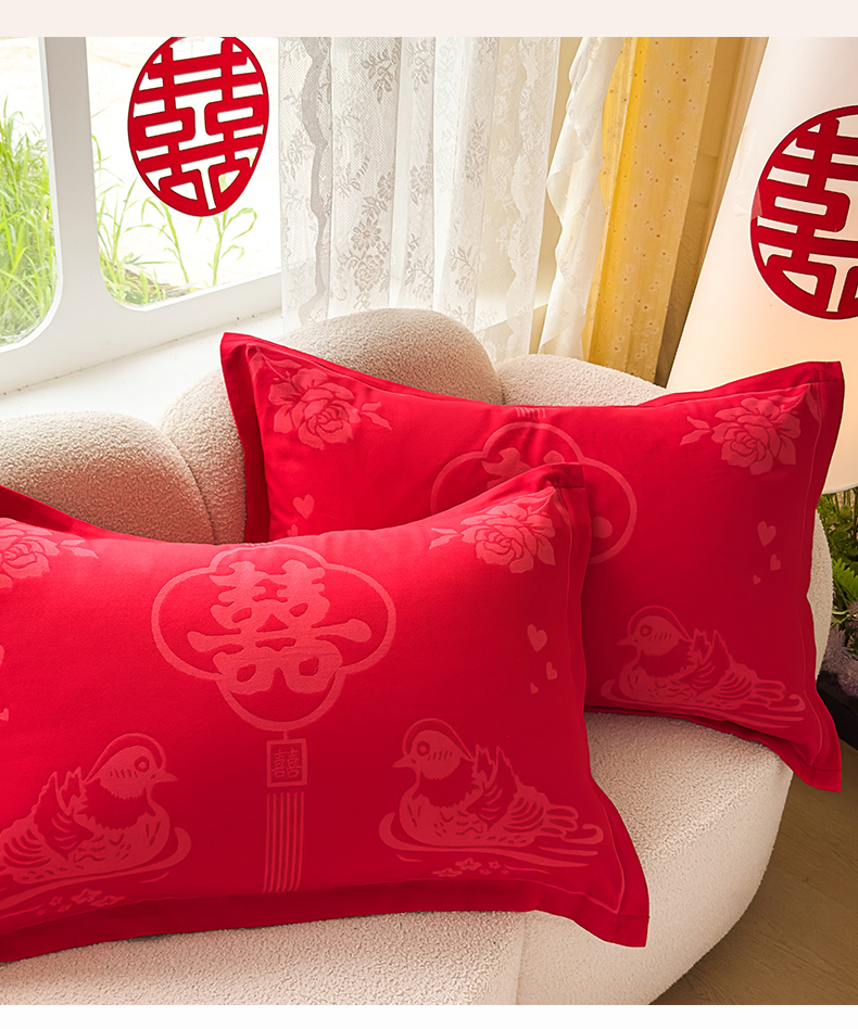 悦然毛巾被 2025新款婚庆大红三层全棉纱布枕套 欢喜鸳鸯