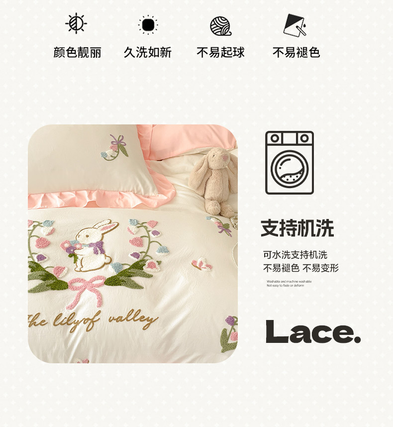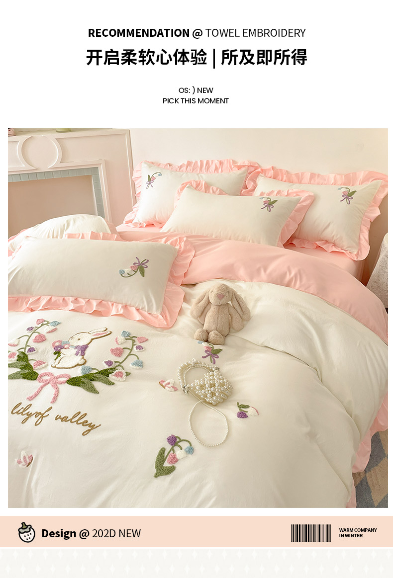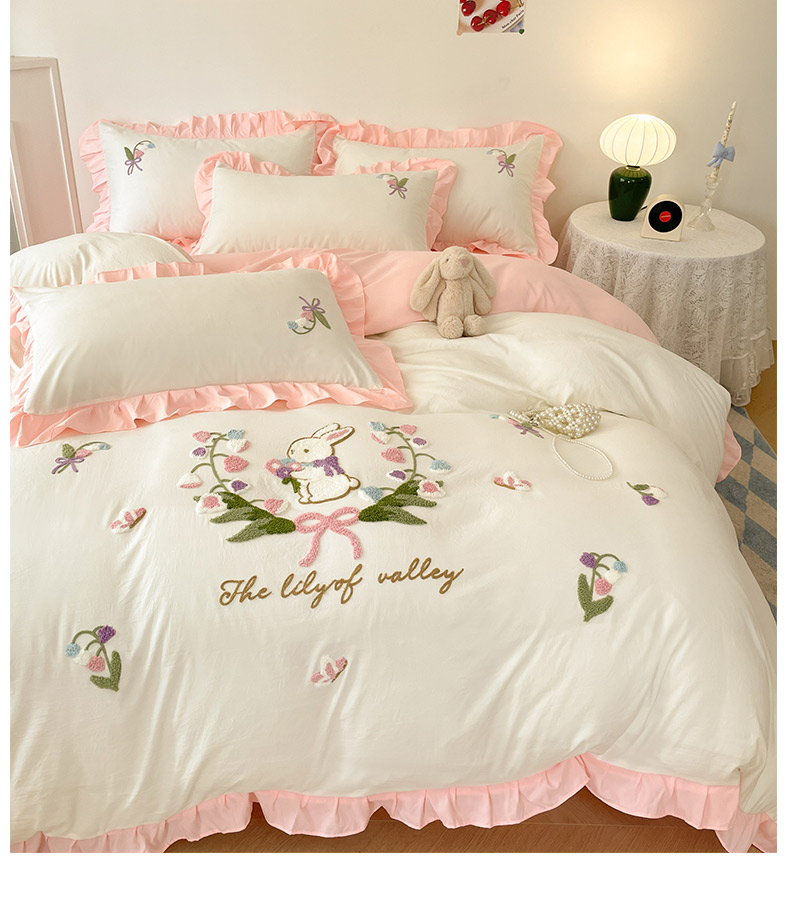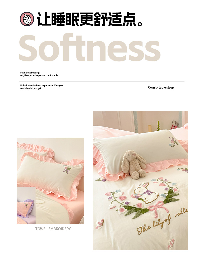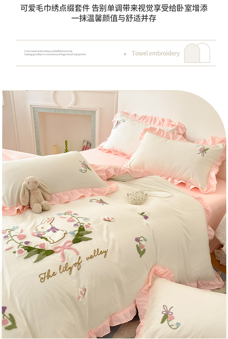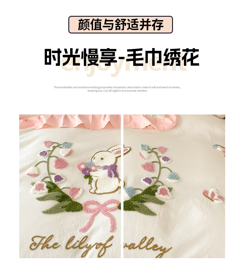 当前位置: 91家纺网 > 商品网购 > 床品套件 > 四件套 > 水洗棉四件套 > 易禾家纺 2025新款韩版小清新毛巾绣水洗棉四件套学生宿舍三件套铃兰小兔系列(专板花型) 铃兰小兔-奶白粉