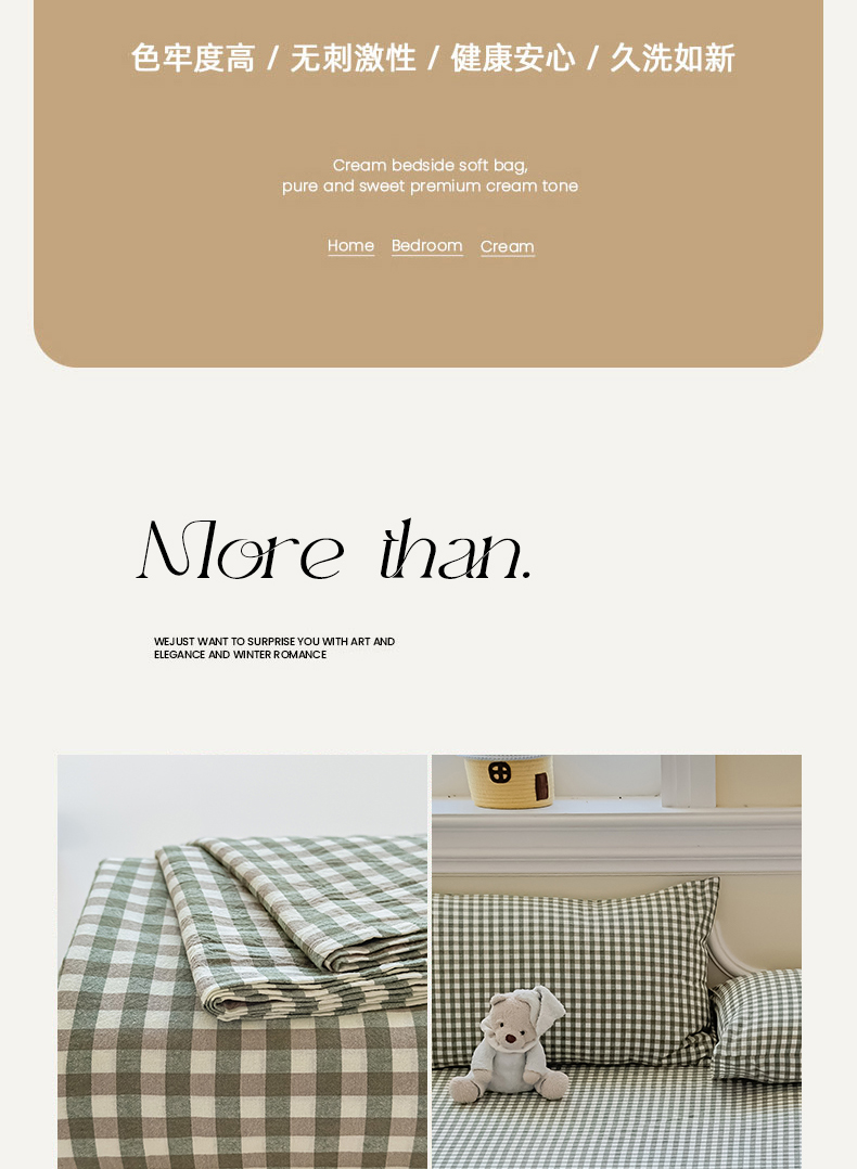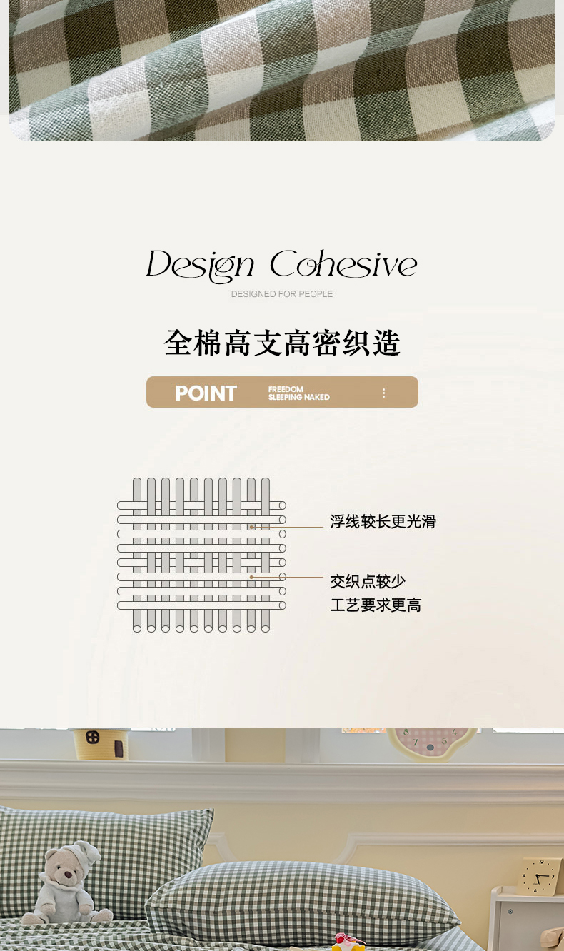 (总)菡宝 2025新款全棉纯棉色织小提花四件套支持定制定做尺寸,暴力熊卡其,暴力熊绿,大方块灰,大方块紫,千鸟格白,千鸟格灰,千鸟格绿,四叶草卡其
