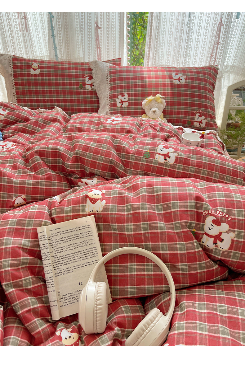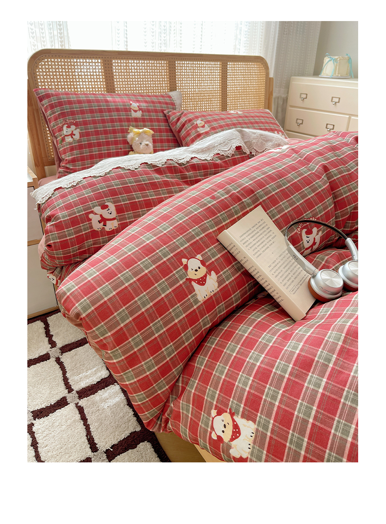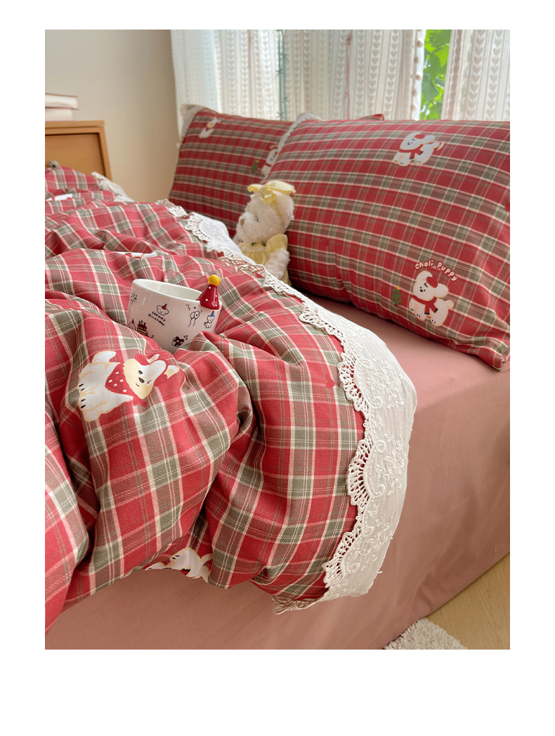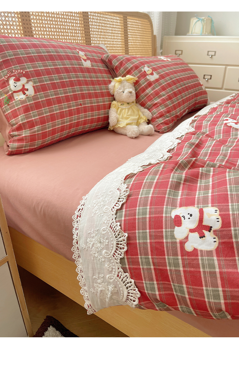 当前位置: 91家纺网 > 商品网购 > 床品套件 > 四件套 > 全棉普通四件套 > 雅居纺家纺 2025新款全棉纯棉韩版花边磨毛四件套 花边红色小狗