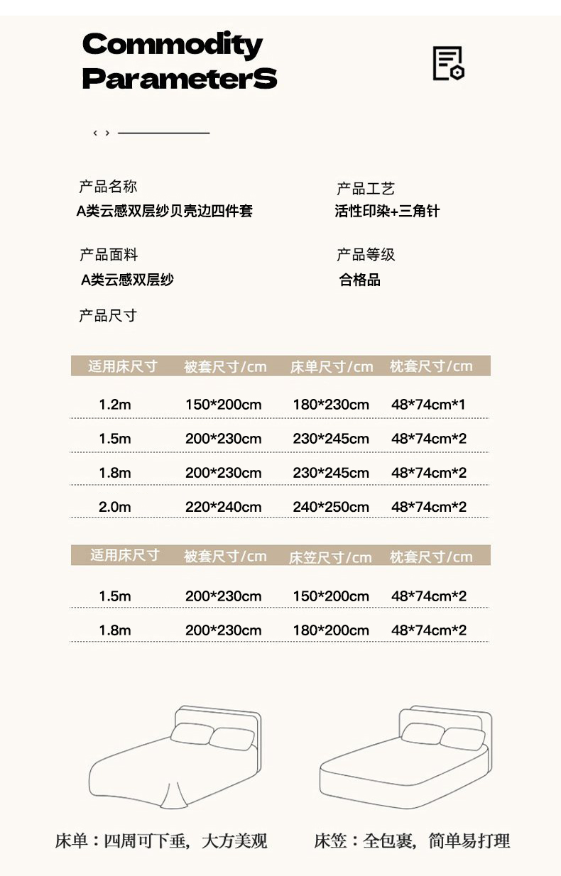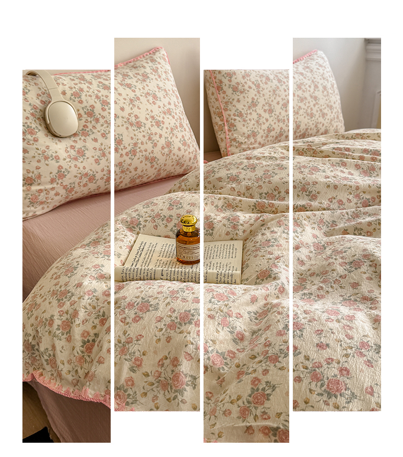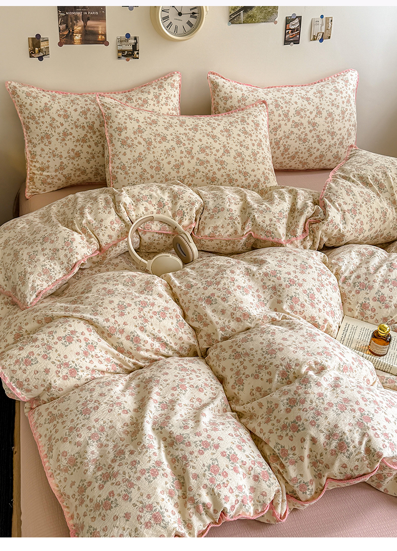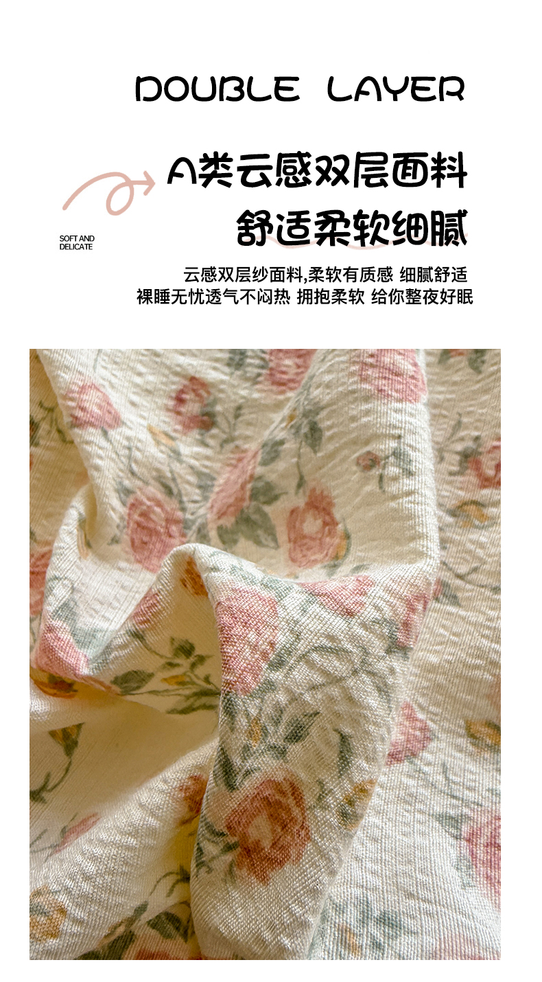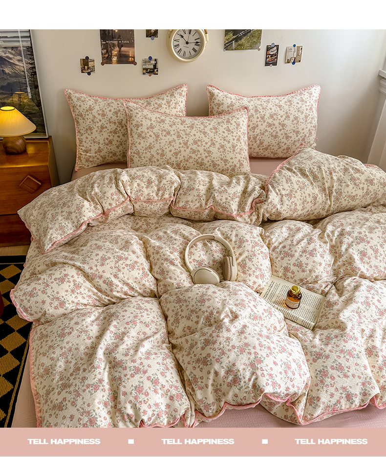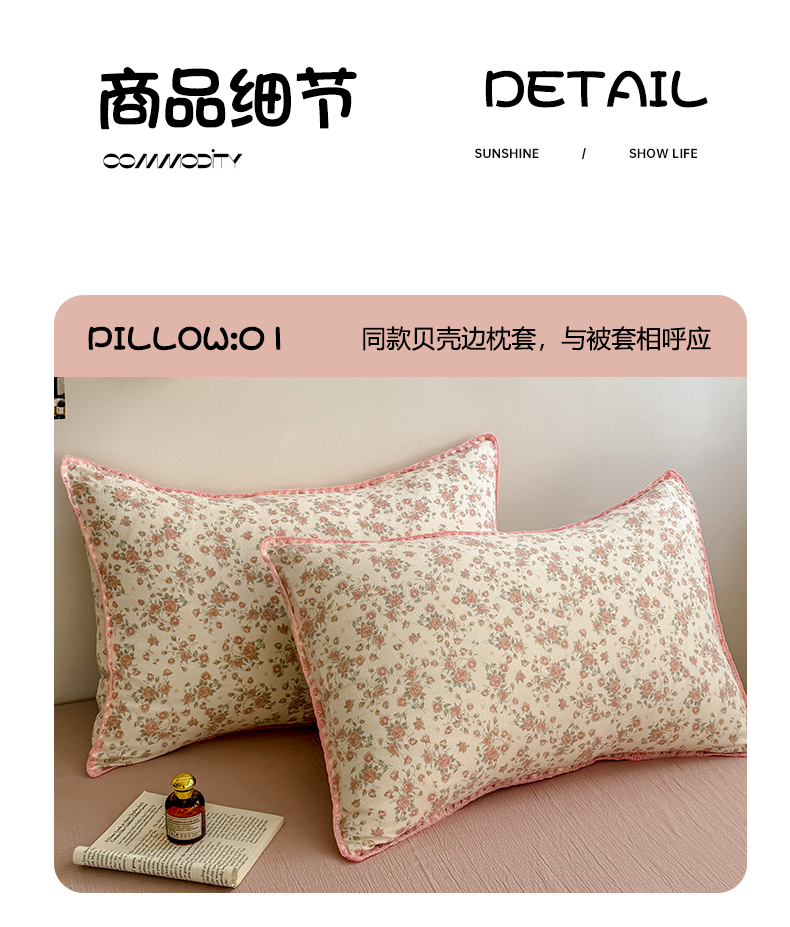 商品名称:晚爱家纺(原晚安家居) 2025新款云感双层纱贝壳边三角针工艺卡通小清新小碎花四件套 玫瑰情书